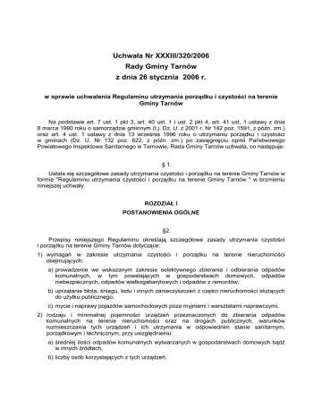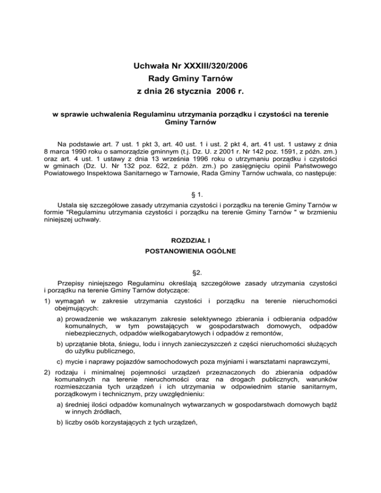 Uchwała Nr XXXIII/320/2006 Rady Gminy Tarnów z dnia 26 stycznia 2006 r. w sprawie uchwalenia Regulaminu utrzymania porządku i czystości na terenie Gminy Tarnów Na podstawie art. 7 ust. 1 pkt 3, art. 40 ust. 1 i ust. 2 pkt 4, art. 41 ust. 1 ustawy z dnia 8 marca 1990 roku o samorządzie gminnym (t.j. Dz. U. z 2001 r. Nr 142 poz. 1591, z późn. zm.) oraz art. 4 ust. 1 ustawy z dnia 13 września 1996 roku o utrzymaniu porządku i czystości w gminach (Dz. U. Nr 132 poz. 622, z późn. zm.) po zasięgnięciu opinii Państwowego Powiatowego Inspektowa Sanitarnego w Tarnowie, Rada Gminy Tarnów uchwala, co następuje: § 1. Ustala się szczegółowe zasady utrzymania czystości i porządku na terenie Gminy Tarnów w formie "Regulaminu utrzymania czystości i porządku na terenie Gminy Tarnów " w brzmieniu niniejszej uchwały. ROZDZIAŁ I POSTANOWIENIA OGÓLNE §2. Przepisy niniejszego Regulaminu określają szczegółowe zasady utrzymania czystości i porządku na terenie Gminy Tarnów dotyczące: 1) wymagań w zakresie utrzymania czystości i porządku na terenie nieruchomości obejmujących: a) prowadzenie we wskazanym zakresie selektywnego zbierania i odbierania odpadów komunalnych, w tym powstających w gospodarstwach domowych, odpadów niebezpiecznych, odpadów wielkogabarytowych i odpadów z remontów, b) uprzątanie błota, śniegu, lodu i innych zanieczyszczeń z części nieruchomości słuŜących do uŜytku publicznego, c) mycie i naprawy pojazdów samochodowych poza myjniami i warsztatami naprawczymi, 2) rodzaju i minimalnej pojemności urządzeń przeznaczonych do zbierania odpadów komunalnych na terenie nieruchomości oraz na drogach publicznych, warunków rozmieszczania tych urządzeń i ich utrzymania w odpowiednim stanie sanitarnym, porządkowym i technicznym, przy uwzględnieniu: a) średniej ilości odpadów komunalnych wytwarzanych w gospodarstwach domowych bądź w innych źródłach, b) liczby osób korzystających z tych urządzeń, 3) częstotliwości i sposobu pozbywania się odpadów komunalnych i nieczystości ciekłych z terenu nieruchomości oraz z terenów przeznaczonych do uŜytku publicznego, 4) maksymalnego poziomu odpadów komunalnych ulegających biodegradacji dopuszczonych do składowania na składowiskach odpadów, 5) innych wymagań wynikających z gminnego planu gospodarki odpadami, 6) obowiązków osób utrzymujących zwierzęta domowe, mających na celu ochronę przed zagroŜeniem lub uciąŜliwością dla ludzi oraz przed zanieczyszczeniem terenów przeznaczonych do wspólnego uŜytku, 7) wymagań utrzymywania zwierząt gospodarskich na terenach wyłączonych z produkcji rolniczej, w tym takŜe zakazu ich utrzymywania na określonych obszarach lub w poszczególnych nieruchomościach, 8) wyznaczania obszarów przeprowadzania. podlegających obowiązkowej deratyzacji i terminów jej § 3. Ilekroć w Regulaminie jest mowa o: 1) właścicielach nieruchomości - rozumie się przez to takŜe współwłaścicieli, uŜytkowników wieczystych oraz jednostki organizacyjne i osoby posiadające nieruchomości w zarządzie lub uŜytkowaniu a takŜe inne osoby i podmioty władające nieruchomościami lub mające obowiązek realizować obowiązki w zakresie utrzymania czystości i porządku, w tym kierowników budowy, 2) nieruchomości – naleŜy przez to rozumieć, zgodnie z art. 46 §1 kodeksu cywilnego, część powierzchni ziemi stanowiącą odrębny przedmiot własności, jak równieŜ budynki trwale z gruntem związane lub część takich budynków. 3) odpadach - naleŜy przez to rozumieć kaŜdą substancję lub przedmiot, naleŜący do jednej z kategorii, określonych odrębnymi przepisami, których posiadacz pozbywa się, zamierza pozbyć się lub do ich pozbycia się jest obowiązany. 4) odpadach komunalnych – rozumie się przez to odpady powstające w gospodarstwach domowych, a takŜe odpady nie zawierające odpadów niebezpiecznych pochodzące od innych wytwórców odpadów, które ze względu na swój charakter lub skład są podobne do odpadów powstających w gospodarstwach domowych, 5) odpadach wielkogabarytowych - naleŜy przez to rozumieć odpady komunalne, które nie mogą być umieszczone ze względu na swoje rozmiary i masę w typowych pojemnikach na odpady (np. stare meble, wózki dziecięce, materace, itp.) 6) odpadach niebezpiecznych – rozumie się przez to frakcję odpadów niebezpiecznych wyselekcjonowanych ze strumienia odpadów komunalnych, tj. baterie, akumulatory, świetlówki, resztki farb, lakierów, rozpuszczalników, środków do impregnacji drewna olejów mineralnych i syntetycznych, benzyn, leków, opakowania po środkach ochrony roślin i nawozach, opakowania po aerozolach, zuŜyte opatrunki itp. 7) odpadach roślinnych - naleŜy przez to rozumieć odpady powstające na prywatnych lub publicznych terenach zielonych wskutek ich pielęgnacji i uprawiania, 8) nieczystościach ciekłych - naleŜy przez to rozumieć ścieki przejściowo gromadzone w zbiornikach bezodpływowych, 2 9) zbiornikach bezodpływowych - naleŜy przez to rozumieć instalacje i urządzenia słuŜące do gromadzenia nieczystości ciekłych w miejscu ich powstawania, 10) budynku uŜyteczności publicznej - rozumie się przez to budynek przeznaczony do wykonania funkcji administracji państwowej, kultury, kultu religijnego, oświaty, słuŜby zdrowia, obsługi bankowej, usług, turystyki, sportu, handlu, gastronomii, obsługi pasaŜerów w transporcie kolejowym, drogowym, poczty, telekomunikacji oraz inny ogólnodostępny budynek przeznaczony do wykonywania podobnych funkcji, 11) zwierzętach domowych naleŜy przez to rozumieć zwierzęta tradycyjnie przebywające wraz z człowiekiem w jego domu lub innym odpowiednim pomieszczeniu, utrzymywane przez człowieka w charakterze jego towarzysza, w szczególności psy, koty, ptaki egzotyczne, chomiki, świnki morskie, ryby i Ŝółwie hodowane w akwarium oraz inne zwierzęta uznane za nadające się do trzy