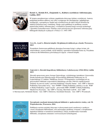 Dymel A., Kotuła D.S., Znajomski A., Kultura czytelnicza i informacyjna, Lublin, 2015 W książce przedstawiono wybrane zagadnienia dotyczące kultury czytelniczej. Autorzy podejmują problem odbiorcy nie tylko czytającego ale słuchającego, oglądającego, surfującego, z perspektywy badań nad czytelnictwem ale także innych dziedzin np. edukacji polonistycznej i medialnej. Druga część publikacji to problemy szeroko pojmowanej kultury informacyjnej, w kontekście dynamicznego rozwoju technologii i sposobów komunikowania. Ostatnia część poświęcona jest sprawności informacyjnej bibliografii lokalnych wydanych w Polsce w l. 1945-1989. Cave R., Ayad S., Historia książki. Od glinianych tabliczek po e-booki, Warszawa, 2015 Przepięknie ilustrowana publikacja ukazująca bezcenne księgi z całego świata, ich różnorodność, rozwój technik, myśli ludzkiej i sposobów komunikowania się. Przydatna zwłaszcza dla bibliotekarzy prowadzących zajęcia o historii książki. Gajewski J., Słownik biograficzny bibliotekarzy Lubelszczyzny (1944-2014), Lublin 2015 Słownik opracowany przez Jerzego Gajewskiego, wieloletniego instruktora i kierownika Działu Instrukcyjno-Metodycznego Wojewódzkiej Biblioteki Publicznej im. H. Łopacińskiego w Lublinie. Publikacja zawiera 178 biogramów wyróżniających się pracowników bibliotek województwa lubelskiego od roku 1944 do współczesności. Znalazły się tam też osoby z powiatu bialskiego: Gruszko Janina – kier. GBP w Janowie Podlaskim, Kaczyński Jerzy – kier. PiMBP w Białej Podlaskiej, później z-ca dyr. WBP w Białej Podlaskiej, Legut Cecylia – pracownik MBP i PiMBP w Białej Podlaskiej, Mackiewicz Krystyna – dyr. GBP w Tucznej, Sławiński Ludwik – kier. GBP w Sławatyczach, Stefaniuk Danuta – kier. GBP w Drelowie, Szechniuk Henryka – kier. GBP w Wisznicach. Zarządzanie zasobami niematerialnymi bibliotek w społeczeństwie wiedzy, red. M. Wojciechowska, Warszawa, 2016 Publikacja zawiera artykuły dotyczące wykorzystania teorii zasobowej w praktyce i teorii zarządzania bibliotekami, oraz poruszające problemy związane z zarządzaniem kapitałem ludzkim w kontekście komunikacji, relacji, kształtowania wizerunku biblioteki, zarządzania zmianami i nowoczesnymi technologiami. Teatr w bibliotece. Doświadczenia i praktyka, red. M. Pietrzak, Warszawa, 2015 Książka skierowana do osób, które w jakikolwiek sposób chcą prowadzić zajęcia z wykorzystaniem narzędzi i technik teatralnych: bibliotekarzy, animatorów kultury, nauczycieli, instruktorów teatralnych, społeczników, wychowawców itd. Jest zbiorem tekstów prezentujących zespoły teatralne działające w określonych środowiskach, ukazujących znaczenie procesu wychowania poprzez teatr. Pokazuje też drogę od słowa mówionego do teatru i jego różnorodnych form. Książki w życiu najmłodszych, red. M. Antczak, A. Walczak-Niewiadomska, Łódź-Warszawa, 2015 W pierwszej części publikacji, książki dla dzieci przedstawione zostały w różnych ujęciach – filologicznym, psychologicznym, terapeutycznym, wychowawczym. W drugiej części omówiono rozmaite formy i metody rozbudzania zainteresowań czytelniczych w najmłodszym wieku. Kotuła S. D., Wstęp do Open Source, Warszawa, 2014 Praca poświęcona technologiom open source, przybliżająca historię ruchu open source, oraz społeczne podstawy jego rozwoju, a także kwestie prawne związane z oprogramowaniem. Znajdziemy tu także porównanie oprogramowania open source z oprogramowaniem komercyjnym, omówienie baz oprogramowania open source ze wskazaniem wybranych technologii dla następujących obszarów: systemy operacyjne, oprogramowanie biurowe, aplikacje do zarządzania informacją, programy przydatne w edukacji, w pracy bibliotecznej, aplikacje internetowe, programy multimedialne, oprogramowanie rozrywkowe. Siwecka D., Światowy model informacji bibliograficznej: programy i projekty (1950-2010), Wrocław-Warszawa, 2015 Książka jest próbą przedstawienia i podsumowania zjawisk jakie wystąpiły w szeroko rozumianej bibliografii w latach 1950-2010. W szczególności przedstawienie ewolucji modelu bibliografii, od narodowych po stadium globalizacji, uwarunkowanej zmianami technologicznymi. Tyszkowska M., Jak korzystać z WEB 2.0 w każdej bibliotece? Praca poświęcona koncepcji Internetu Drugiej Generacji, charakterystyce zjawiska i jego historii a także obecności w bibliotekach. Znajdziemy tu także krytyczną analizę zjawiska Web 2.0 oraz omówienie poszczególnych narzędzi charakterystycznych dla nurtu Internetu Drugiej Generacji i przykłady ich wykorzystania w praktyce. Włodarczyk B., Mapy tematów jako podstawa semantyzacji języka haseł przedmiotowych, Warszawa, 2016 Książka wpisuje się w nurt dyskusji na temat przyszłości opracowania rzeczowego zbiorów bibliotecznych. Autor zaprezentował koncepcję jednej z możliwych transformacji Języka Haseł Przedmiotowych, poprawiającą wyszukiwanie informacji w katalogach bibliotecznych, poprzez lepsze wykorzystanie leksyki tego języka.