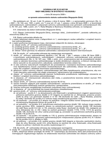 UCHWAŁA NR XLVI/407/09 RADY MIEJSKIEJ W BYSTRZYCY KŁODZKIEJ z dnia 28 sierpnia 2009 r. w sprawie ustanowienia statutu uzdrowiska Długopole-Zdrój Na podstawie art. 18 ust. 2 pkt 15 ustawy z dnia 8 marca 1990 r. o samorządzie gminnym (Dz. U. z 2001 r. Nr 142, poz. 1591, z późn. zm.1)) oraz art. 41 ust. 1 ustawy z dnia 28 lipca 2005 r. o lecznictwie uzdrowiskowym, uzdrowiskach i obszarach ochrony uzdrowiskowej oraz gminach uzdrowiskowych (Dz. U. Nr 167, poz. 1399, z późn. zm.2)). Rada Miejska w Bystrzycy Kłodzkiej uchwala, co następuje: § 1. Ustanawia się statut Uzdrowiska Długopole-Zdrój. § 2. Obszar Uzdrowiska Długopole-Zdrój, zwanego dalej „Uzdrowiskiem”, posiada całkowitą powierzchnię 2206,2 ha. § 3. Statut uzdrowiska składa się: 1) z części tekstowej statutu wraz z załącznikiem nr 1, zawierającym wykaz zakładów i urządzeń lecznictwa uzdrowiskowego; 2) z części graficznej zawierającej mapy, stanowiące załączniki do statutu, obrazujące: a) obszar strefy „A” ochrony uzdrowiskowej, b) przebieg granicy strefy „B” ochrony uzdrowiskowej z zaznaczoną strefą „A”, c) przebieg granicy strefy „C” ochrony uzdrowiskowej z zaznaczoną strefą „A” i „B”, d) obszar i teren górniczy na obszarze uzdrowiska z zaznaczonymi złożami wód leczniczych. § 4. Do strefy „A” uzdrowiska odnoszą się następujące wymagania: 1) strefa „A” ochrony uzdrowiskowej zgodnie z art. 38 ust. 1 pkt 1 ustawy z dnia 28 lipca 2005 r. o lecznictwie uzdrowiskowym, uzdrowiskach i obszarach ochrony uzdrowiskowej oraz gminach uzdrowiskowych (Dz. U. Nr 167, poz. 1399, z późn. zm.), przeznaczona jest do prowadzenia działalności w zakresie lecznictwa uzdrowiskowego w ściśle określonym obszarze, w którym istnieją określone warunki co do powierzchni, zabudowy, wskaźników terenów zieleni itp.; 2) w celu ochrony naturalnych niezbędnych do prowadzenia i rozwijania lecznictwa uzdrowiskowego oraz kształtowania innych czynników środowiskowych dla uzdrowiska, obszar ten jest zarezerwowany dla urządzeń i obiektów lecznictwa uzdrowiskowego; 3) głównym celem ochrony obszaru uzdrowiskowego jest takie kształtowanie urbanistyczne, aby warunki naturalne uzdrowiska nie uległy zniszczeniu, ograniczeniu lub zniekształceniu; 4) obszar „A” ochrony uzdrowiskowej stanowi funkcjonalne przedłużenie najbliższego otoczenia zakładów i urządzeń lecznictwa uzdrowiskowego; 5) w obszarze „A” intensywność zabudowy jest niska, a powierzchnia terenów zieleni wynosi 75% powierzchni terenu; 6) obszar strefy „A” ochrony uzdrowiskowej wynosi 40,10 ha; 7) oprócz terenów zajętych pod szpitale uzdrowiskowe i sanatoria przewidziano w strefie „A” tereny pod potencjalne lokalizacje nowych sanatoriów i pensjonatów; 8) rezerwy terenowe uwzględniają możliwość rozbudowy bazy uzdrowiskowej; 9) w obszarze „A” nie przewiduje się nowej zabudowy mieszkaniowej; 10) granica strefy „A” ochrony uzdrowiskowej przebiega: a) od północy – punkt A-1, na skrzyżowaniu ulic Kościuszki z projektowanym ciągiem spacerowym, północno-zachodnia granica działki nr 61 biegnie na wschód do ul. Zdrojowej, przecina prostopadle tę ulicę i po granicach działek nr nr 53 i 60 dochodzi do rzeki – Nysa Kłodzka, przecina tę rzekę i dochodzi do punktu A-2 (arkusz mapy ewidencyjnej gruntów 1[3]), b) od wschodu − od punktu A-2 skręca na południe i biegnie wzdłuż torów kolejowych granicą administracyjną Długopola-Zdroju do punkt A-3, c) od południa – od punktu A-3, południowo-wschodnia granica działki 130, (arkusz mapy ewidencyjnej gruntów 3[3]), następnie skręca na południowy-zachód i granicą działki 130 dochodzi do rzeki Nysy punkt A-4 (dz. nr 72), przecina rzekę Nysę i dochodzi do działki 122, następnie po ulicy Zdrojowej (dz. nr 23) i dalej na zachód granicami działek 117/6, 117/9, 117/3 do granicy działki 126, dochodzi do ulicy Leśnej przecinając ją, prowadzi na południowo-zachodnią granicą działki 116 punkt A-5, d) od zachodu − od punktu A-5 działka nr 116, tj. granica administracyjna miejscowości, skręca na południowy-wschód i granicami administracyjnymi miejscowości poprzez punkt A-6, A-7 dochodzi do punktu A-8, tj. działka nr 54/5, e) od północy − od punktu A-8, wzdłuż granicy działki 54/5 biegnie w kierunku wschodnim dochodząc do ulicy Bocznej, punkt A-9, ulicą Boczną na wschód do ulicy Kościuszki, ulicą Kościuszki skręca na północ i dochodzi do punktu wyjściowego A-1. § 5. Do strefy „B” uzdrowiska odnoszą się następujące wymagania: 1) strefa "B", o powierzchni 592,0 ha, dla której procentowy udział terenów biologicznie czynnych wynosi 95%, obejmuje obszar przyległy do strefy "A" i stanowiący jej otoczenie, który jest przeznaczony dla niemających negatywnego wpływu na właściwości lecznicze uzdrowiska lub obszaru ochrony uzdro- wiskowej oraz nieuciążliwych w procesie leczenia obiektów usługowych, turystycznych, rekreacyjnych, sportowych i komunalnych, budownictwa mieszkaniowego oraz innych związanych z zaspokajaniem potrzeb osób przebywających na tym obszarze; 2) obszar „B” ochrony uzdrowiskowej jest otuliną dla obszaru „A” stanowiąc jednocześnie teren zabudowy usługowej, turystycznej i mieszkaniowej; 3) granica strefy „B” ochrony uzdrowiskowej przebiega: a) od zachodu – od skrzyżowania dróg ulicy Zdrojowej z drogą powiatową na Międzylesie nr 3235D i drogą na Ponikwę nr 3277D pkt B-1 biegnie na zachód wzdłuż drogi powiatowej w kierunku Ponikwy dochodząc do granicy administracyjnej wsi Ponikwa i Wyszki, b) od północy – od skrzyżowania granicy wsi Ponikwa i Wyszki skręca na wschód i granicami tych wsi dochodzi do punktu granicznego między dwoma działkami leśnymi 208/47 i 310/38 i działką 375, skręca na wschód i wzdłuż granic działek 208/47, 170, 178, 179, 180 do granicy działki 182, c) od wschodu – od granicy 