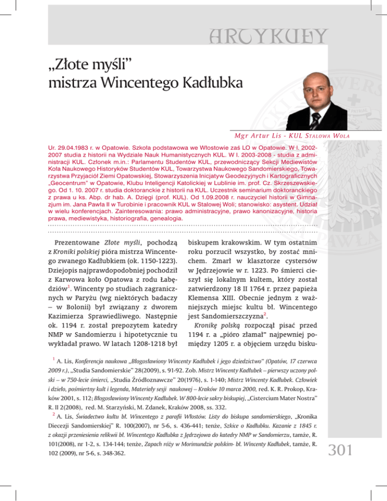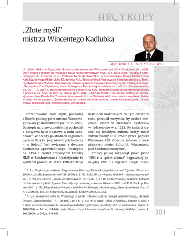 ARTYKUŁY „Złote myśli” mistrza Wincentego Kadłubka Mg r A r t ur L is - K UL S t a l o wa W o l a Ur. 29.04.1983 r. w Opatowie. Szkoła podstawowa we Włostowie zaś LO w Opatowie. W l. 20022007 studia z historii na Wydziale Nauk Humanistycznych KUL. W l. 2003-2008 - studia z administracji KUL. Członek m.in.: Parlamentu Studentów KUL, przewodniczący Sekcji Mediewistów Koła Naukowego Historyków Studentów KUL, Towarzystwa Naukowego Sandomierskiego, Towarzystwa Przyjaciół Ziemi Opatowskiej, Stowarzyszenia Inicjatyw Geodezyjnych i Kartograficznych „Geocentrum” w Opatowie, Klubu Inteligencji Katolickiej w Lublinie im. prof. Cz. Skrzeszewskiego. Od 1. 10. 2007 r. studia doktoranckie z historii na KUL. Uczestnik seminarium doktoranckiego z prawa u ks. Abp. dr hab. A. Dzięgi (prof. KUL). Od 1.09.2008 r. nauczyciel historii w Gimnazjum im. Jana Pawła II w Turobinie i pracownik KUL w Stalowej Woli; stanowisko: asystent. Udział w wielu konferencjach. Zainteresowania: prawo administracyjne, prawo kanonizacyjne, historia prawa, mediewistyka, historiografia, genealogia. Prezentowane Złote myśli, pochodzą z Kroniki polskiej pióra mistrza Wincentego zwanego Kadłubkiem (ok. 1150-1223). Dziejopis najprawdopodobniej pochodził z Karwowa koło Opatowa z rodu Łabędziów1. Wincenty po studiach zagranicznych w Paryżu (wg niektórych badaczy – w Bolonii) był związany z dworem Kazimierza Sprawiedliwego. Następnie ok. 1194 r. został prepozytem katedry NMP w Sandomierzu i hipotetycznie tu wykładał prawo. W latach 1208-1218 był 1 biskupem krakowskim. W tym ostatnim roku porzucił wszystko, by zostać mnichem. Zmarł w klasztorze cystersów w Jędrzejowie w r. 1223. Po śmierci cieszył się lokalnym kultem, który został zatwierdzony 18 II 1764 r. przez papieża Klemensa XIII. Obecnie jednym z ważniejszych miejsc kultu bł. Wincentego jest Sandomierszczyzna2. Kronikę polską rozpoczął pisać przed 1194 r. a „pióro złamał” najpewniej pomiędzy 1205 r. a objęciem urzędu bisku- A. Lis, Konferencja naukowa „Błogosławiony Wincenty Kadłubek i jego dziedzictwo” (Opatów, 17 czerwca 2009 r.), „Studia Sandomierskie” 28(2009), s. 91-92. Zob. Mistrz Wincenty Kadłubek – pierwszy uczony polski – w 750-lecie śmierci, „Studia Źródłoznawcze” 20(1976), s. 1-140; Mistrz Wincenty Kadłubek. Człowiek i dzieło, pośmiertny kult i legenda, Materiały sesji naukowej – Kraków 10 marca 2000, red. K. R. Prokop, Kraków 2001, s. 112; Błogosławiony Wincenty Kadłubek. W 800-lecie sakry biskupiej, „Cistercium Mater Nostra” R. II 2(2008), red. M. Starzyński, M. Zdanek, Kraków 2008, ss. 332. 2 A. Lis, Świadectwo kultu bł. Wincentego z parafii Włostów. Listy do biskupa sandomierskiego, „Kronika Diecezji Sandomierskiej” R. 100(2007), nr 5-6, s. 436-441; tenże, Szkice o Kadłubku. Kazanie z 1845 r. z okazji przeniesienia relikwii bł. Wincentego Kadłubka z Jędrzejowa do katedry NMP w Sandomierzu, tamże, R. 101(2008), nr 1-2, s. 134-144; tenże, Zapach róży w Morimundzie polskim- bł. Wincenty Kadłubek, tamże, R. 102 (2009), nr 5-6, s. 348-362. 301 ARTICLES piego. Kronika mistrza Wincentego to europejskiej miary pomnik tzw. renesansu XII wieku. Jest to dzieło, które stoi u progu kształtowania się świadomej i rozumnej polskiej myśli historycznej i recepcji twórczej, która służyła aktualnym potrzebom kraju i jego ambicji samookreślenia się we wspólnocie państw i ludów cywilizacji zachodniej. Warto zauważyć, że I księga stanowi tzw. cykl krakowskich przedchrześcijańskich epizodów podaniowych tj. Dakowie i Gallowie, Krak i założenie państwa, smok wawelski i założeKsięga I Nie ma serdecznego przymierza między purpurą i łachmanem. [Prolog, rozdz. 1, s. 4]. * Lepiej jest cieszyć się czcią w samotności niż doznawać lekceważenia w poufałym obcowaniu. [Prolog, rozdz. 1, s. 4]. * Dzisiejsi jesteśmy i nie masz w nas sędziwej wiedzy dni wczorajszych. [Księga I, rozdz. 1, s. 8]. * Albowiem dusza podsyca działanie odwagi, światło czyni jasnym ogląd rzeczy, słońce uczy rozsyłać do wszystkich dobroczynne promienie łask. [Księga I, rozdz. 5, s. 11]. * nie Krakowa, Wanda, Lechici i Aleksander Wielki, Lestek I, gonitwy o władzę i Lestek II, Lestek III i Julia – siostra Juliusza Cezara, Pompiliusz I i bracia3. Próbę zestawienia sentencji i przypowieści mistrza Wincentego, podejmowali dotychczas: Jan Wiśniewski4, Brygida Kürbis5 a ostatnio Krzysztof Rafał Prokop6. Niniejszy wybór Złotych myśli opiera się na nowej wersji łacińskiej Kroniki Wincentego wydanej przez Mariana Plezię7 oraz tłumaczeniu Brygidy Kürbis8. Quia nullum est inter purpuras et pannositatem sodalitii fedus. [Prologvs, 1,2, s. 3]. * Quia satius est solitudine uenerari quam familiaritate contempni. [Prologvs, 1,2, s. 3]. * Nos enim hodierni sumus, nec ulla hesternitatis est in nobis cana scientia. [I, 1.3, s. 6]. * Anima siqidem animositatis industriam, lux rerum circumspectionem, sol denique radios munificentiarum beneficos ad omnes docet expandi. [I, 5,2, s. 9]. * 3 H. Łowmiański, Początki Polski, t. V, Warszawa 1973, s. 310-340; t. VI, cz. 2, Warszawa 1985, s. 796-806. 4 J. Wiśniewski, Katalog prałatów i kanoników sandomierskich od 1186-1926, tudzież sesje kapituły sandomier- skiej od 1581 do 1866 r., Radom 1926, s. 113 i nn. 302 5 B. Kürbis, Myśli i nauki Mistrza Wincentego zwanego Kadłubkiem, Warszawa 1980. 6 K. R. Prokop, Wincenty Kadłubek, Kraków 2005 (seria: Wielcy Ludzie Kościoła), s. 72-77. 7 Mistrza Wincentego zwanego Kadłubkiem Kronika Polska, wyd. M. Plezia, [w:] Monumenta Poloniae Historia, seria II, t. 11, Kraków 1994. 8 Mistrz Wincenty (tzw. Kadłubek ), Kronika Polska, wyd. B. Kürbis, Wrocław 2008. ARTYKUŁY Żądza władzy zwykła obchodzić wszystkie kąty u wszystkich, do wszystkich się umizgiwać, wszystkim do nóg padać, dopóki nie osiągnie, do czego wszelkim sposobem dążyła. [Ksi