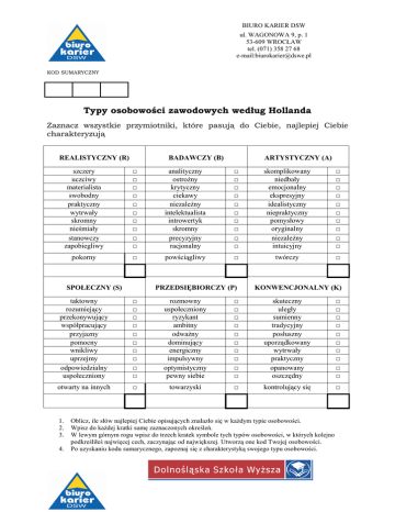 BIURO KARIER DSW ul. WAGONOWA 9, p. 1 53-609 WROCŁAW tel. (071) 358 27 68 e-mail:[email protected] KOD SUMARYCZNY Typy osobowości zawodowych według Hollanda Zaznacz wszystkie przymiotniki, które pasują do Ciebie, najlepiej Ciebie charakteryzują REALISTYCZNY (R) BADAWCZY (B) ARTYSTYCZNY (A) szczery uczciwy materialista swobodny praktyczny wytrwały skromny nieśmiały stanowczy zapobiegliwy □ □ □ □ □ □ □ □ □ □ analityczny ostroŜny krytyczny ciekawy niezaleŜny intelektualista introwertyk skromny precyzyjny racjonalny □ □ □ □ □ □ □ □ □ □ skomplikowany niedbały emocjonalny ekspresyjny idealistyczny niepraktyczny pomysłowy oryginalny niezaleŜny intuicyjny □ □ □ □ □ □ □ □ □ □ pokorny □ powściągliwy □ twórczy □ SPOŁECZNY (S) PRZEDSIĘBIORCZY (P) KONWENCJONALNY (K) taktowny rozumiejący przekonywujący współpracujący przyjazny pomocny wnikliwy uprzejmy odpowiedzialny uspołeczniony □ □ □ □ □ □ □ □ □ □ rozmowny uspołeczniony ryzykant ambitny odwaŜny dominujący energiczny impulsywny optymistyczny pewny siebie □ □ □ □ □ □ □ □ □ □ skuteczny uległy sumienny tradycyjny posłuszny uporządkowany wytrwały praktyczny opanowany oszczędny □ □ □ □ □ □ □ □ □ □ otwarty na innych □ towarzyski □ kontrolujący się □ 1. 2. 3. 4. Oblicz, ile słów najlepiej Ciebie opisujących znalazło się w kaŜdym typie osobowości. Wpisz do kaŜdej kratki sumę zaznaczonych określeń. W lewym górnym rogu wpisz do trzech kratek symbole tych typów osobowości, w których kolejno podkreśliłeś najwięcej cech, zaczynając od największej. Utworzą one kod Twojej osobowości. Po uzyskaniu kodu sumarycznego, zapoznaj się z charakterystyką swojego typu osobowości. TYP REALISTYCZNY (R) CECHUJE: niezaleŜność, odpowiedzialność, systematyczność, sprawność fizyczna, logika. Typ realistyczny lubi podejmowanie ryzyka,, rozwiązywanie konkretnych problemów, posługiwać się narzędziami i maszynami (stolarz, hydraulik, kierowca) TYP BADAWCZY (B) CECHUJE: ciekawość świata, intelektualizm, precyzja, posiada uzdolnienia matematyczne i naukowe. Typ badawczy lubi studiowanie, wyzwania, wymianę myśli i skomplikowane, abstrakcyjne problemy (biolog, psycholog, fizyk, chemik). TYP KONWENCJONALNY (K) CECHUJE: łagodne usposobienie, dokładność, odpowiedzialność, sumienność, brak elastyczności. W pracy lubią mieć do czynienia z danymi i przestrzegać jasno zdefiniowanych procedur (księgowa, urzędnik, sekretarka). TYP ARTYSTYCZNY (A) CECHUJE: kreatywność, poczucie estetyki, analizowanie swoich myśli i uczuć, ekspresyjność. W pracy preferują kreatywne podejście do rozwiązywania problemów, często podejmują decyzje na podstawie intuicji (malarz, rzeźbiarz, aktor). TYP PRZEDSIĘBIORCZY (P) CECHUJE: pełna wiara we własne siły, chęć dominacji, niezaleŜność. W pracy z ludźmi podczas wykonywania zadań kieruje się uczuciami i logiką (przedsiębiorca, przedstawiciel handlowy) TYP SPOŁECZNY (S) CECHUJE: otwartość na kontakty z ludźmi, zainteresowanie ludźmi, uczuciowość, potrzeba wspierania. W pracy z innymi kieruje się uczuciami, jest empatyczny (nauczyciel, pedagog, doradca zawodu). Źródło: Opracowanie na podstawie koncepcji Johna, L. Hollanda.