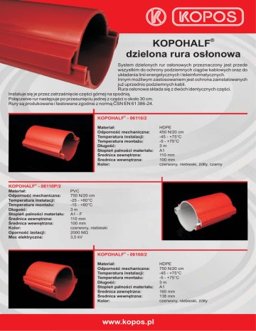 ® KOPOHALF dzielona rura osłonowa System dzielonych rur osłonowych przeznaczony jest przede wszystkim do ochrony podziemnych ciągów kablowych oraz do układania linii energetycznych i teleinformatycznych. Innym możliwym zastosowaniem jest ochrona zainstalowanych już uprzednio podziemnych kabli. Rura osłonowa składa się z dwóch identycznych części. Instaluje się je przez zatrzaśnięcie części górnej na spodnią. Połączenie rur następuje po przesunięciu jednej z części o około 30 cm. Rury są produkowane i testowane zgodnie z normą ČSN EN 61 386-24. ® KOPOHALF - 06110/2 Materiał: Odporność mechaniczna: Temperatura instalacji: Temperatura montażu: Długość: Stopień palności materiału: Średnica zewnętrzna: Średnica wewnętrzna: Kolor: HDPE 450 N/20 cm -45 - +75°C -5 - +75°C 3m A1 110 mm 100 mm czerwony, niebieski, żółty, czarny ® KOPOHALF - 06110P/2 Materiał: Odporność mechaniczna: Temperatura instalacji: Temperatura montażu: Długość: Stopień palności materiału: Średnica zewnętrzna: Średnica wewnętrzna: Kolor: Oporność izolacji: Moc elektryczna: PVC 750 N/20 cm -25 - +60°C -15 - +60°C 3m A1 - F 110 mm 100 mm czerwony, niebieski 2000 MΩ 3,5 kV ® KOPOHALF - 06160/2 Materiał: Odporność mechaniczna: Temperatura instalacji: Temperatura montażu: Długość: Stopień palności materiału: Średnica zewnętrzna: Średnica wewnętrzna: Kolor: www.kopos.pl HDPE 750 N/20 cm -45 - +75°C -5 - +75°C 3m A1 160 mm 138 mm czerwony, niebieski, żółty