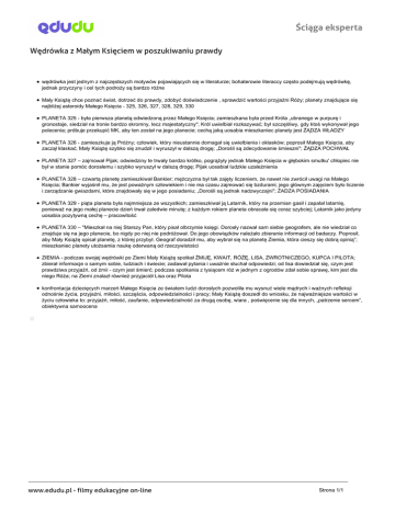 Ściąga eksperta Wędrówka z Małym Księciem w poszukiwaniu prawdy wędrówka jest jednym z najczęstszych motywów pojawiających się w literaturze; bohaterowie literaccy często podejmują wędrówkę, jednak przyczyny i cel tych podroży są bardzo różne Mały Książę chce poznać świat, dotrzeć do prawdy, zdobyć doświadczenie , sprawdzić wartości przyjaźni Róży; planety znajdujące się najbliżej asteroidy Małego Księcia - 325, 326, 327, 328, 329, 330 PLANETA 325 - była pierwsza planetą odwiedzoną przez Małego Księcia; zamieszkana była przed Króla „ubranego w purpurę i gronostaje, siedział na tronie bardzo skromny, lecz majestatyczny"; Król uwielbiał rozkazywać; był szczęśliwy, gdy ktoś wykonywał jego polecenia; próbuje przekupić MK, aby ten został na jego planecie; cechą jaką uosabia mieszkaniec planety jest ŻĄDZA WŁADZY PLANETA 326 - zamieszkuje ją Próżny; człowiek, który nieustannie domagał się uwielbienia i oklasków; poprosił Małego Księcia, aby zaczął klaskać; Mały Książę szybko się znudził i wyruszył w dalszą drogę; „Dorośli są zdecydowanie śmieszni"; ŻĄDZA POCHWAŁ PLANETA 327 – zajmował Pijak; odwiedziny te trwały bardzo krótko, pogrążyły jednak Małego Księcia w głębokim smutku' chłopiec nie był w stanie pomóc dorosłemu i szybko wyruszył w dalszą drogę; Pijak uosabiał ludzkie uzależnienia PLANETA 328 – czwartą planetę zamieszkiwał Bankier; mężczyzna był tak zajęty liczeniem, że nawet nie zwrócił uwagi na Małego Księcia; Bankier wyjaśnił mu, że jest poważnym człowiekiem i nie ma czasu zajmować się bzdurami; jego głównym zajęciem było liczenie i zarządzanie gwiazdami, które znajdowały się w jego posiadaniu; „Dorośli są jednak nadzwyczajni"; ŻADZA POSIADANIA PLANETA 329 - piąta planeta była najmniejsza ze wszystkich; zamieszkiwał ją Latarnik, który na przemian gasił i zapalał latarnię, ponieważ na jego małej planecie dzień trwał zaledwie minutę; z każdym rokiem planeta obracała się coraz szybciej; Latarnik jako jedyny uosabia pozytywną cechę – pracowitość PLANETA 330 – "Mieszkał na niej Starszy Pan, który pisał olbrzymie księgi. Dorosły nazwał sam siebie geografem, ale nie wiedział co znajduje się na jego planecie, bo nigdy po niej nie podróżował. Do jego obowiązków należało zbieranie informacji od badaczy. Poprosił, aby Mały Książę opisał planetę, z której przybył. Geograf doradził mu, aby wybrał się na planetę Ziemia, która cieszy się dobrą opinią”; mieszkaniec planety utożsamia naukę oderwaną od rzeczywistości ZIEMIA - podczas swojej wędrówki po Ziemi Mały Książę spotkał ŻMIJĘ, KWAIT, RÓŻĘ, LISA, ZWROTNICZEGO, KUPCA I PILOTA; zbierał informacje o samym sobie, ludziach i świecie; zadawał pytania i uważnie słuchał odpowiedzi; od lisa dowiedział się, czym jest prawdziwa przyjaźń, od żmii - czym jest śmierć; podczas spotkania z tysiącem róż w jednym z ogrodów zdał sobie sprawę, kim jest dla niego Róża; na Ziemi znalazł również przyjaciół Lisa oraz Pilota konfrontacja dziecięcych marzeń Małego Księcia ze światem ludzi dorosłych pozwoliła mu wysnuć wiele mądrych i ważnych refleksji odnośnie życia, przyjaźni, miłości, szczęścia, odpowiedzialności i pracy; Mały Książę doszedł do wniosku, że najważniejsze wartości w życiu człowieka to: przyjaźń, miłość, zaufanie, odpowiedzialność za drugą osobę, wiara , poświęcenie się dla innych, „patrzenie sercem”, obiektywna samoocena www.edudu.pl - filmy edukacyjne on-line Powered by TCPDF (www.tcpdf.org) Strona 1/1