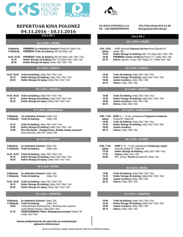 REPERTUAR KINA POLONEZ 04.11.2016 - 10.11.2016 UL.WITA STWOSZA 2/4 96 - 100 SKIERNIEWICE SALA NR 1 SALA NR 2 04.11.2016 r. PIĄTEK 04.11.2016 r. PIĄTEK 9:00szkoły 11:00szkoły PREMIERA Za niebieskim drzwiami Polska 90’| bilety 12zł PREMIERA Trolle 2d dubbing USA 93’| bilety 12zł 14:45, 16:30 18:15 20:30 PREMIERA Trolle 2d dubbing USA 93’| bilety 18zł I 16zł I 14zł Doktor Strange 2d dubbing USA 115’| bilety 18zł I 16zł I 14zł Doktor Strange 2d napisy | bilety 18zł I 16zł I 14zł 8:30, 12:00 szkoły 15:45 18:00 20:15 05.11.2016 r. SOBOTA 14:45, 16:30 Trolle 2d dubbing | bilety 18zł I 16zł I 14zł 18:15 Doktor Strange 2d dubbing | bilety 18zł I 16zł I 14zł 20:30 Doktor Strange 2d napisy | bilety 18zł I 16zł I 14zł 14:00 15:45 18:00 20:15 14:15 16:00 19:00 Trolle 2d dubbing | bilety 18zł I 16zł I 14zł Doktor Strange 2d dubbing | bilety 18zł I 16zł I 14zł Kino Dla Kobiet – Przedpremiera „Światło miedzy oceanami” Nowa Zelandia, USA 130’ | bilety 18zł 14:00 15:45 18:00 20:15 14:45, 16:30 Trolle 2d dubbing | bilety 18zł I 16zł I 14zł 18:15 Doktor Strange 2d dubbing | bilety 18zł I 16zł I 14zł 20:30 Doktor Strange 2d napisy | bilety 18zł I 16zł I 14zł 9:00, 11:00 szkoły 14:00 15:45 18:00 20:15 14:45, 16:30 Trolle 2d dubbing | bilety 18zł I 16zł I 14zł 18:15 Doktor Strange 2d dubbing | bilety 18zł I 16zł I 14zł 20:30 Doktor Strange 2d napisy | bilety 18zł I 16zł I 14zł 9:00, 11:00 szkoły 15:30 17:45 20:00 NHEF kl. IV – VI szk. podstawowe Podejmując ryzyko Holandia, Belgia 87’ | bilety 8zł Doktor Strange 3d dubbing | bilety 20zł I 18zł I 16zł Inferno | bilety 18zł I 16zł DKF „Eroica” Powrót Australia 96’ | bilety 12zł 09.11.2016 r. ŚRODA 14:00 15:45 18:00 20:15 10.11.2016 r. CZWARTEK 9:00szkoły Za niebieskim drzwiami | bilety 12zł 11:00szkoły Trolle 2d dubbing | bilety 12zł 19:00 Festiwal Muzyki Romantycznej – Romantycznie i jazzowo recital Włodka Pawlika | bilety 50zł I 40zł 21:15 PRZEDPREMIERA Pitbull. Niebezpieczne kobiety Polska 136’ | bilety 18zł I 16zł NHEF kl. I – III szk. podstawowe Przyjaciel na balkonie Austria 90’ | bilety 8zł Trolle 3d dubbing | bilety 20zł I 18zł I 16zł Doktor Strange 3d dubbing | bilety 20zł I 18zł I 16zł Jestem mordercą Inferno | bilety 18zł I 16zł 08.11.2016 r. WTOREK 09.11.2016 r. ŚRODA 9:00szkoły Za niebieskim drzwiami | bilety 12zł 11:00szkoły Trolle 2d dubbing | bilety 12zł Trolle 3d dubbing | bilety 20zł I 18zł I 16zł Doktor Strange 3d dubbing | bilety 20zł I 18zł I 16zł Jestem mordercą | bilety 18zł I 16zł Inferno | bilety 18zł I 16zł 07.11.2016 r. PONIEDZIAŁEK 08.11.2016 r. WTOREK 9:00szkoły Za niebieskim drzwiami | bilety 12zł 11:00szkoły Trolle 2d dubbing | bilety 12zł Trolle 3d dubbing | bilety 20zł I 18zł I 16zł Doktor Strange 3d dubbing | bilety 20zł I 18zł I 16zł Jestem mordercą | bilety 18zł I 16zł Inferno | bilety 18zł I 16zł 06.11.2016 r. NIEDZIELA 07.11.2016 r. PONIEDZIAŁEK 9:00szkoły Za niebieskim drzwiami | bilety 12zł 11:00szkoły Trolle 2d dubbing | bilety 12zł NHEF gimnazja Operacja hip-hop Nowa Zelandia 93’ | bilety 10zł Doktor Strange 3d dubbing USA 115’| bilety 20zł I 18zł I 16zł PREMIERA Jestem mordercą Polska 117’ | bilety 18zł I 16zł Inferno Japonia, Turcja, USA, Węgry 121’ | bilety 18zł I 16zł 04.11.2016 r. SOBOTA 06.11.2016 r. NIEDZIELA 14:45, 16:30 Trolle 2d dubbing | bilety 18zł I 16zł I 14zł 18:15 Doktor Strange 2d dubbing | bilety 18zł I 16zł I 14zł 20:30 Doktor Strange 2d napisy | bilety 18zł I 16zł I 14zł TEL/FAX (046) 833 44 89 [email protected] Trolle 3d dubbing | bilety 20zł I 18zł I 16zł Doktor Strange 3d dubbing | bilety 20zł I 18zł I 16zł Jestem mordercą | bilety 18zł I 16zł Inferno | bilety 18zł I 16zł 10.11.2016 r. CZWARTEK 14:00 15:45 18:00 20:15 Seanse przedpołudniowe dla szkół tylko po wcześniejszym zgłoszeniu telefonicznym KINO ZASTRZEGA SOBIE MOŻLIWOŚĆ ZMIAN W REPERTUARZE Trolle 2d dubbing | bilety 18zł I 16zł I 14zł Doktor Strange 3d dubbing | bilety 20zł I 18zł I 16zł Jestem mordercą | bilety 18zł I 16zł Inferno | bilety 18zł I 16zł
