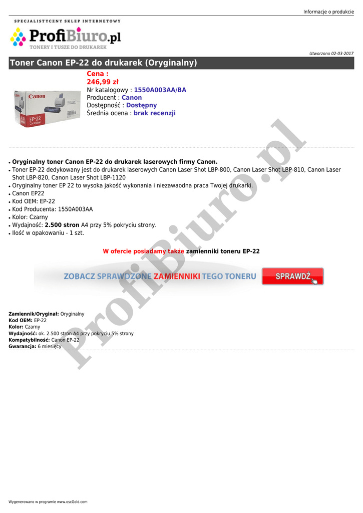 Informacje o produkcie Utworzono 02-03-2017 Toner Canon EP-22 do drukarek (Oryginalny) Cena : 246,99 zł ● ● ● ● ● ● ● ● Oryginalny toner Canon EP-22 do drukarek laserowych firmy Canon. Toner EP-22 dedykowany jest do drukarek laserowych Canon Laser Shot LBP-800, Canon Laser Shot LBP-810, Canon Laser Shot LBP-820, Canon Laser Shot LBP-1120 Oryginalny toner EP 22 to wysoka jakość wykonania i niezawaodna praca Twojej drukarki. Canon EP22 Kod OEM: EP-22 Kod Producenta: 1550A003AA Kolor: Czarny Wydajność: 2.500 stron A4 przy 5% pokryciu strony. Ilość w opakowaniu - 1 szt. iu r ● o. pl Nr katalogowy : 1550A003AA/BA Producent : Canon Dostępność : Dostępny Średnia ocena : brak recenzji of iB W ofercie posiadamy także zamienniki toneru EP-22 Pr Zamiennik/Oryginał: Oryginalny Kod OEM: EP-22 Kolor: Czarny Wydajność: ok. 2.500 stron A4 przy pokryciu 5% strony Kompatybilność: Canon EP-22 Gwarancja: 6 miesięcy Wygenerowano w programie www.oscGold.com
