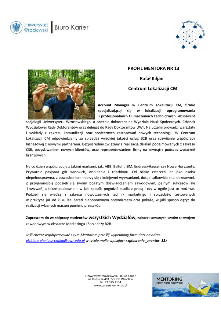 PROFIL MENTORA NR 13 Rafał Kiljan Centrum Lokalizacji CM Account Manager w Centrum Lokalizacji CM, firmie specjalizującej się w lokalizacji oprogramowania i profesjonalnych tłumaczeniach technicznych. Absolwent socjologii Uniwersytetu Wrocławskiego, a obecnie doktorant na Wydziale Nauk Społecznych. Członek Wydziałowej Rady Doktorantów oraz delegat do Rady Doktorantów UWr. Na uczelni prowadzi warsztaty i wykłady z zakresu komunikacji oraz społecznych zastosowań nowych technologii. W Centrum Lokalizacji CM odpowiedzialny za sprzedaż wysokiej jakości usług B2B oraz rozwijanie współpracy biznesowej z nowymi partnerami. Bezpośrednio związany z realizacją działań podejmowanych z zakresu CSR, pozyskiwaniem nowych klientów, oraz reprezentowaniem firmy na zewnątrz podczas wydarzeń branżowych. Na co dzień współpracuje z takimi markami, jak: ABB, Balluff, IBM, Endress+Hauser czy Nowe Horyzonty. Prywatnie pasjonat gór wysokich, wspinania i triathlonu. Od blisko czterech lat jako osoba niepełnosprawna, z powodzeniem mierzy się z kolejnymi wyzwaniami, dotąd całkowicie mu nieznanymi. Z przyjemnością podzieli się swoim bogatym doświadczeniem zawodowym, pełnym sukcesów ale i wyzwań, a także podpowie – w jaki sposób pogodzić studia z pracą i czy w ogóle jest to możliwe. Podzieli się wiedzą z zakresu nowoczesnych technik marketingu i sprzedaży, testowanych w praktyce już od kilku lat. Zarazi niepoprawnym optymizmem oraz pokaże, w jaki sposób dążyć do realizacji własnych marzeń pomimo przeszkód. Zapraszam do współpracy studentów wszystkich Wydziałów, zainteresowanych swoim rozwojem zawodowym w obszarze Marketingu i Sprzedaży B2B. Jeśli chcesz współpracować z tym Mentorem prześlij wypełniony formularz na adres: [email protected] w tytule maila wpisując: <zgłoszenie _mentor 13> Uniwersytet Wrocławski - Biuro Karier ul. Kuźnicza 49A, 50-138 Wrocław tel. 71 375 2134 www.careers.uni.wroc.pl
