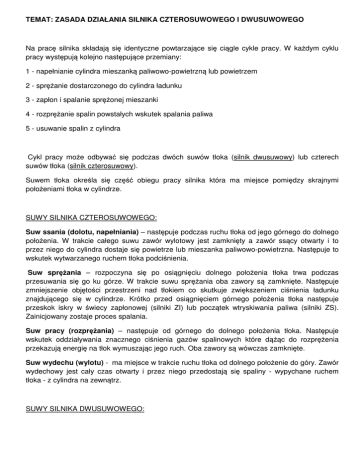 TEMAT: ZASADA DZIAŁANIA SILNIKA CZTEROSUWOWEGO I DWUSUWOWEGO Na pracę silnika składają się identyczne powtarzające się ciągle cykle pracy. W każdym cyklu pracy występują kolejno następujące przemiany: 1 - napełnianie cylindra mieszanką paliwowo-powietrzną lub powietrzem 2 - sprężanie dostarczonego do cylindra ładunku 3 - zapłon i spalanie sprężonej mieszanki 4 - rozprężanie spalin powstałych wskutek spalania paliwa 5 - usuwanie spalin z cylindra Cykl pracy może odbywać się podczas dwóch suwów tłoka (silnik dwusuwowy) lub czterech suwów tłoka (silnik czterosuwowy). Suwem tłoka określa się część obiegu pracy silnika która ma miejsce pomiędzy skrajnymi położeniami tłoka w cylindrze. SUWY SILNIKA CZTEROSUWOWEGO: Suw ssania (dolotu, napełniania) – następuje podczas ruchu tłoka od jego górnego do dolnego położenia. W trakcie całego suwu zawór wylotowy jest zamknięty a zawór ssący otwarty i to przez niego do cylindra dostaje się powietrze lub mieszanka paliwowo-powietrzna. Następuje to wskutek wytwarzanego ruchem tłoka podciśnienia. Suw sprężania – rozpoczyna się po osiągnięciu dolnego położenia tłoka trwa podczas przesuwania się go ku górze. W trakcie suwu sprężania oba zawory są zamknięte. Następuje zmniejszenie objętości przestrzeni nad tłokiem co skutkuje zwiększeniem ciśnienia ładunku znajdującego się w cylindrze. Krótko przed osiągnięciem górnego położenia tłoka następuje przeskok iskry w świecy zapłonowej (silniki ZI) lub początek wtryskiwania paliwa (silniki ZS). Zainicjowany zostaje proces spalania. Suw pracy (rozprężania) – następuje od górnego do dolnego położenia tłoka. Następuje wskutek oddziaływania znacznego ciśnienia gazów spalinowych które dążąc do rozprężenia przekazują energię na tłok wymuszając jego ruch. Oba zawory są wówczas zamknięte. Suw wydechu (wylotu) - ma miejsce w trakcie ruchu tłoka od dolnego położenie do góry. Zawór wydechowy jest cały czas otwarty i przez niego przedostają się spaliny - wypychane ruchem tłoka - z cylindra na zewnątrz. SUWY SILNIKA DWUSUWOWEGO: PRZESTRZEŃ NAD TŁOKIEM PRZESTRZEŃ POD TŁOKIEM RUCH TŁOKA Z DOŁU DO GÓRY Tłok podążając ku górze zasłania okno przelotowe i wylotowe i następuje sprężanie wypełniającego komorę spalania mieszaniny paliwowo-powietrznej. Na krótko przed osiągnięciem górnego położenia tłoka następuje przeskok iskry w świecy i rozpoczyna się spalanie sprężonego ładunku Podczas ruchu tłoka do góry do chwili zamknięcia okna przelotowego ładunek z komory korbowej dostaje się do komory spalania. Po zasłonięciu przez tłok okien dolotowego i przelotowego ruch tłoka wytwarza w komorze korbowej podciśnienie. Po odsłonięciu okna dolotowego podciśnienie zasysa mieszankę paliwowo-powietrzną. RUCH TŁOKA Z GÓRY DO DOŁU Rozprężające się spaliny przekazują energię na tłok. Z chwilą gdy krawędź przesuwającego się w dół tłoka odsłania okno wylotowe następuje wylot spalin. Po dalszym przesunięciu odsłonięte zostaje okno kanału przelotowego i do wnętrza cylindra zaczyna dostawać się mieszanka paliwowopowietrzna która odpowiednio skierowana przepłukuje wnętrze cylindra wspomagając wylot spalin. Tłok przesuwając się w dół z chwilą zasłonięcia okna dolotowego powoduje wstępne sprężanie mieszanki paliwowopowietrznej. Dopiero po otwarciu okna kanału przelotowego ładunek zostaje dodatkowo wskutek ruchu tłoka wtłoczony do przestrzeni nad tłokiem.