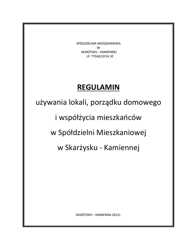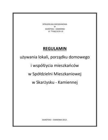SPÓŁDZIELNIA MIESZKANIOWA W SKARŻYSKU - KAMIENNEJ Ul. TYSIĄCLECIA 10 REGULAMIN używania lokali, porządku domowego i współżycia mieszkańców w Spółdzielni Mieszkaniowej w Skarżysku - Kamiennej SKARŻYSKO – KAMIENNA 2012r. Regulamin używania lokali, porządku domowego i współżycia mieszkańców w Spółdzielni Mieszkaniowej w Skarżysku-Kamiennej I. Postanowienia ogólne §1 1. Regulamin określa zasady używania lokali, porządku domowego i współżycia mieszkańców obowiązujące członków Spółdzielni Mieszkaniowej w Skarżysku-Kamiennej i wszystkie inne osoby zamieszkałe w zasobach Spółdzielni. 2. Członek Spółdzielni oraz najemca lokalu niebędący członkiem, są odpowiedzialni w zakresie postanowień niniejszego Regulaminu za wszystkie osoby reprezentujące ich prawa (członków rodziny, domowników, podnajemców, gości, itp.). 3. Uchylanie się przez członka od wykonywania obowiązków określonych w niniejszym regulaminie może być potraktowana przez organy Spółdzielni, jako rażące naruszenie norm etycznych i zwyczajowo przyjętych z konsekwencjami (do wykluczenia ze Spółdzielni włącznie) wynikającymi z §15 Statutu Spółdzielni Mieszkaniowej. §2 Podstawę prawną niniejszego Regulaminu stanowi §56 pkt 23 Statutu spółdzielni w Skarżysku – Kamiennej. II. Używanie lokali §3 Przydzielony członkowi lokal może być używany wyłącznie na cele określone w przydziale lub umowie. A. Zasiedlanie lokali mieszkalnych §4 Lokal i piwnice w stanie nadającym się do użytku przekazuje członkowi lub najemcy Administracja Osiedla. 1 B. Zasady eksploatacji lokali §5 Członek (najemca) obowiązany jest do odnawiania lokalu oraz dokonywania drobnych napraw w trybie i zakresie ustalonym w Regulaminie, określającym obowiązki Spółdzielni i członków w zakresie napraw wewnątrz lokali. §6 W zakresie instalacji gazowych: 1. Nie wolno dokonywać żadnych zmian i przeróbek bez zgody Administracji czy dostawcy gazu oraz używać przewodów gazowych jako uziemienia instalacji elektrycznej, nawet przy odbiornikach radiowych. 2. Przybory gazowe należy utrzymywać w czystości oraz bieżąco oczyszczać palniki i wewnętrzne otwory prowadzące do główki palnika. Okresową konserwację kurka i regulację spalania w palniku należy zlecać uprawnionemu specjaliście. 3. Wszelkie zmiany i naprawy instalacji gazowych oraz kuchenek mogą być wykonane w uzgodnieniu z Administracją, tylko przez osoby posiadające specjalistyczne uprawnienia. 4. W przypadku stwierdzenia ulatniania się gazu należy natychmiast zamknąć zawór odcinający kuchenkę gazową, wywietrzyć mieszkanie i zawiadomić Administrację Osiedla lub Pogotowie Gazowe. 5. Przed wyjściem z mieszkania należy sprawdzić zamknięcie wszystkich kurków. 6. W przypadku rozłączenia kuchenki z instalacją traci ważność próba szczelności instalacji. W razie ukrycia faktu rozłączenia kuchenki z instalacją lub innych przeróbek i braku ponownej próby szczelności, wszelką odpowiedzialność ponosi użytkownik mieszkania. 7. W nagłych przypadkach zagrażających bezpieczeństwu osób i mienia, przedstawiciele dostawcy gazu w obecności funkcjonariusza Policji i Przedstawiciela Spółdzielni mają prawo wejść do lokalu pod nieobecność użytkownika. §7 W zakresie instalacji wodno-kanalizacyjnej: 1. Przed każdorazowym wyjściem z mieszkania należy sprawdzić zamknięcie baterii ciepłej i zimnej wody. 2. Przy indywidualnym pomiarze wody naruszenie plomb i stwierdzenie naruszenia połączeń złącznikowych spowoduje rozliczanie zużytej wody według regulaminu rozliczeń wody. 2 §8 Bez zgody Spółdzielni niedozwolone jest instalowanie indywidualnych zewnętrznych anten radiowych, telewizyjnych i innych, poza balkonami i oknami użytkowanych mieszkań. §9 W zakresie korzystania z urządzeń elektrycznych: 1. Dla zapewnienia bezpieczeństwa osób ich życia i zdrowia, zabrania się: - dokonywania napraw bezpieczników elektrycznych w miejscach wspólnego użytku (klatki schodowe, piwnice) - instalowania światła w piwnicach z przewodów poprowadzonych bezpośrednio od tablicy bezpieczników i lamp oświetlenia korytarza piwnicznego. 2. Instalowanie oświetlenia w piwnicy indywidualnej wymaga zgody Spółdzielni z zachowaniem podanych przez nią warunków technicznych. 3. Instalowanie w piwnicach dodatkowych punktów poboru energii elektrycznej jest zabronione. 4. O zauważonych uszkodzeniach instalacji w pomieszczeniach ogólnodostępnych, należy niezwłocznie zawiadomić Administrację Osiedla. § 10 W zakresie dbałości o stan sanitarno-porządkowy pomieszczeń wspólnego użytku budynku, w którym znajduje się lokal, mieszkańcy obowiązani są do: 1. Zachowaniu porządku na klatkach schodowych oraz w kabinach wind, a w przypadku zanieczyszczenia do bezzwłocznego usunięcia zanieczyszczenia. §11 Użytkownicy lokali zobowiązani są zabezpieczać lokal przed utratą ciepła na okres zimy, poprzez uszczelnienie okien i drzwi oraz okienek piwnicznych, znajdujących się w użytkowanej piwnicy. §12 1. Użytkownicy lokali mieszkalnych i użytkowych obowiązani są umożliwić wstęp do lokalu oraz pomieszczeń przynależnych komisji Spółdzielni w celu dokonania kontroli stanu urządzeń i lokalu. 3 Użytkownicy lokali, o których mowa w ust 1, zobowiązani są także do udostępnienia 2. balkonów w celu przeprowadzenia przez Spółdzielnię remontów i napraw elewacji oraz balkonów położonych na sąsiednich kondygnacjach. III. Zasady porządku domowego §13 1. Każdy członek (najemca lokalu, mieszkania) jest obowiązany utrzymać lokal i pomieszczenia do niego przynależne we właściwym stanie technicznym i sanitarnym oraz przestrzegać postanowień niniejszego Regulaminu. 2. Członek obowiązany jest dbać i chronić przed uszkodzeniem lub dewastacją części budynku przeznaczone do wspólnego korzystania jak windy, klatki schodowe, korytarze, pomieszczenia z