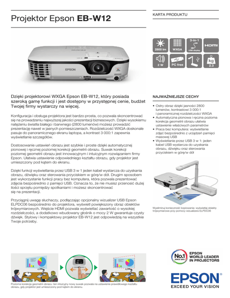 Projektor Epson EB-W12 KARTA PRODUKTU Dzięki projektorowi WXGA Epson EB-W12, który posiada szeroką gamę funkcji i jest dostępny w przystępnej cenie, budżet Twojej firmy wystarczy na więcej. NAJWAŻNIEJSZE CECHY konfiguracja i obsługa projektora jest bardzo prosta, co pozwala skoncentrować się na prowadzeniu najwyższej jakości prezentacji biznesowych. Dzięki wysokiemu natężeniu światła białego i barwnego (2800 lumenów) możesz prowadzić prezentację nawet w jasnych pomieszczeniach. rozdzielczość WXgA doskonale pasuje do panoramicznego ekranu laptopa, a kontrast 3 000:1 zapewnia wyświetlanie szczegółów. Dostosowanie ustawień obrazu jest szybkie i proste dzięki automatycznej pionowej i ręcznej poziomej korekcji geometrii obrazu. Suwak korekcji poziomej geometrii obrazu jest innowacyjnym i intuicyjnym rozwiązaniem firmy Epson. Ułatwia ustawienie odpowiedniego kształtu obrazu, gdy projektor jest umieszczony pod kątem do ekranu. • Ostry obraz dzięki jasności 2800 lumenów, kontrastowi 3 000:1 i panoramicznej rozdzielczości WXgA • Automatyczna pionowa i ręczna pozioma korekcja geometrii obrazu ułatwia ustawienie właściwych parametrów • Praca bez komputera: wyświetlanie zdjęć bezpośrednio z urządzeń pamięci masowej USB • Wyświetlanie przez USB 3 w 1: jeden kabel USB wystarcza do uzyskania obrazu, dźwięku oraz sterowania przyciskiem w górę/w dół Dzięki funkcji wyświetlania przez USB 3 w 1 jeden kabel wystarcza do uzyskania obrazu, dźwięku oraz sterowania przyciskiem w górę/w dół. Drugim sposobem jest wykorzystanie funkcji pracy bez komputera, która pozwala prezentować zdjęcia bezpośrednio z pamięci USB. oznacza to, że nie musisz przenosić dużej ilości sprzętu pomiędzy spotkaniami i możesz skoncentrować się na prezentacji. Przyciągnij uwagę słuchaczy, podłączając opcjonalny wizualizer USB Epson ELPDC06 bezpośrednio do projektora, wyświetl powiększony obraz obiektów trójwymiarowych. Wejście HDMi pozwala wyświetlać zawartość o wysokiej rozdzielczości, a dodatkowo wbudowany głośnik o mocy 2 W gwarantuje czysty dźwięk. Stylowy i kompaktowy projektor EB-W12 jest odpowiedzią na wszystkie Twoje potrzeby. Pozioma korekcja geometrii obrazu: ten intuicyjny nowy suwak pozwala na ustawienie prawidłowego kształtu obrazu, gdy projektor jest umieszczony pod kątem do ekranu. Wyeliminuj konieczność kopiowania: wyświetlaj obiekty trójwymiarowe przy pomocy wizualizera ELPDC06 Epson EB-W12 DANE TECHNICZNE PRODUKTU Technologia projekcji Wyświetlacz LCD Technologia 3LCD 0,59 cala z MLA ROZDZIELCZOŚĆ WXGA (1280 × 800) (format obrazu 16:10) Do 1080p NATĘŻENIE ŚWIATŁA BIAŁEGO * Tryb Normalny/Ekonomiczny 2800/2240 lumenów NATĘŻENIE ŚWIATŁA BARWNEGO * Tryb Normalny/Ekonomiczny 2800/2240 lumenów KONTRAST 3 000:1 ROZMIAR EKRANU 33 do 318 cali ODLEGŁOŚĆ PROJEKCJI Obraz 60 cali: 1,68–2,02 m WSPÓŁCZYNNIK RZUTU 1,30–1,56:1 ZOOM Optyczny × 1,2 KOREKCJA GEOMETRII OBRAZU Automatyczna pionowa ±30°, ręczna pozioma ±30° TYP OBIEKTYWU Otwór względny obiektywu Ogniskowa Przesunięcie Ostrość 1,58–1,72 16,9–20,28 mm 10:1 Ostrość ustawiana ręcznie LAMPA Żywotność (tryb normalny/ekonomiczny) Rodzaj 4000/5000 godzin 200 W UHE (E-TORL) Złącza Wejście wideo Wejście komputerowe Wejście pamięci USB Wejście wyświetlania przez USB 3 w 1 Wejście cyfrowe Wejście audio Wejście sterowania Wejście na wizualizer USB Epson 1 × RCA (żółty), 1 × S-Video, 1 × Component (D-sub 15-stykowe) 1 × D-sub 15-stykowe (RGB), 1 × USB 2.0 typu B 1 × USB 2.0 typu A 1 × USB 2.0 typu B 1 × HDMI 1 × RCA (biały/czerwony) 1 × USB 2.0 typu B ELPDC06 (bezpośrednie połączenie przez USB typu A) Zaawansowane funkcje Zabezpieczenia Obsługa Oprogramowanie EasyMP do pracy bez komputera Obraz Otwór na kłódkę i kabel zabezpieczający, blokada Kensington, ochrona hasłem Bezpośrednie włączanie/wyłączanie zasilania, natychmiastowe wyłączanie, suwak wyłączania obrazu/dźwięku Przeglądarka zdjęć przez USB typu A (zgodna z plikami JPEG/PNG/GIF/BMP) 8 trybów kolorów JĘZYKI Angielski / Francuski / Niemiecki / Włoski / Hiszpański / Holenderski / Portugalski / Rosyjski / Szwedzki / Norweski / Fiński / Duński / Bułgarski / Polski / Węgierski / Czeski / Słowacki / Rumuński / Chorwacki / Słoweński / Ukraiński / Kataloński / Grecki / Turecki / Arabski / Hebrajski / Hindi / Japoński / Uproszczony Chiński / Tradycyjny Chiński / Koreański / Tajski / Indonezyjski / Malajski / Wietnamski POZIOM HAŁASU (Tryb Normalny/Ekonomiczny) 37/29 dB DŹWIĘK 1 głośnik o mocy 2 W WAGA 2,3 kg WYMIARY (szer. × gł. × wys.) 295 × 228 × 77 mm POBÓR MOCY Tryb Normalny/Ekonomiczny Stan gotowości 270/223 W 0,47 W GWARANCJA 2 lata na projektor, 1 rok na lampę Przepisy dotyczące bezpieczeństwa IEC 60950-1 wydanie 1 (znak CE) Dyrektywa zgodności elektromagnetycznej (EMC) 89/336/EEC Przepisy dotyczące recyklingu AKCESORIA DODATKOWE •Zapasowa lampa V13H010L67 (ELPLP67) •Filtr powietrza V13H134A32 (ELPAF32) •50-calowy ekran stołowy 4:3 (ELPSC32) V12H002S32 •80-calowy ekran przenośny 16:9 V12H002S21 (ELPSC21) •80-calowy ekran składany 16:10 V12H002S24 (ELPSC24) •Ekran z możliwością zmiany proporcji 65/74/80 cali V12H002S26 (ELPSC26) •Wizualizer USB Epson V12H321003 (ELPDC06) •Wizualizer biurkowy Epson V12H377040 (ELPDC11) •Zestaw mocowania sufitowego (ELPMB23) V12H003B23 •Rurka sufitowa 668–918 mm (ELPFP13) V12H003P13 •Rurka sufitowa 918–1 168 mm (ELPFP14) V12H003P14 * ISO 21118 EB-W12_ds_1PL_10/11 OPAKOWANIE KOD SKU V11H428040 KOD KRESKOWY 8715946488813 ZAWARTOŚĆ OPAKOWANIA Projektor EB-W12, przewód zasilający 1,8 m, przewód komputerowy 1,8 m, kabel USB 1,8 m, pilot zdalnego sterowania z bateriami, futerał, instrukcja obsługi WAGA BRUTTO 4,1 kg WYMIARY PUDEŁKA (dł. x szer. x wys.) 366 × 338 × 155 mm Epson Europe B.V. Sp. z o.o. Oddział w Polsce ul. B