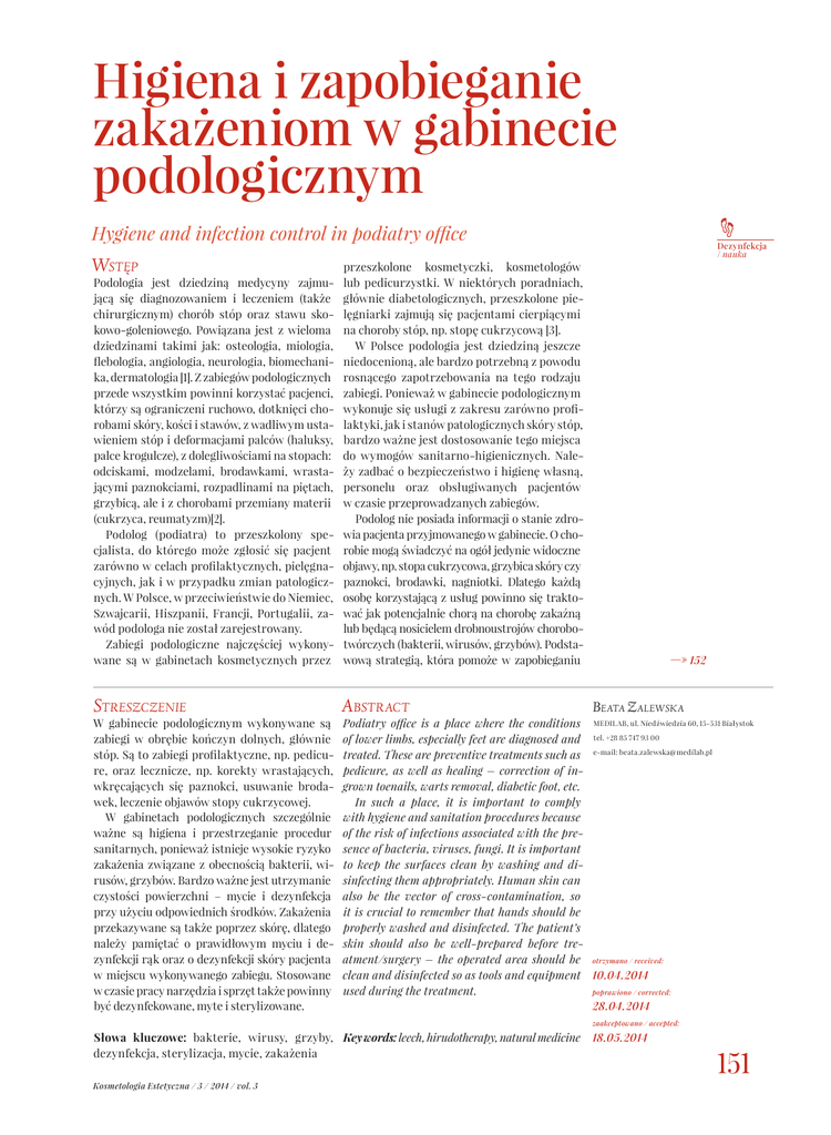 Higiena i zapobieganie zakażeniom w gabinecie podologicznym Hygiene and infection control in podiatry office Wstęp Podologia jest dziedziną medycyny zajmującą się diagnozowaniem i leczeniem (także chirurgicznym) chorób stóp oraz stawu skokowo-goleniowego. Powiązana jest z wieloma dziedzinami takimi jak: osteologia, miologia, flebologia, angiologia, neurologia, biomechanika, dermatologia [1]. Z zabiegów podologicznych przede wszystkim powinni korzystać pacjenci, którzy są ograniczeni ruchowo, dotknięci chorobami skóry, kości i stawów, z wadliwym ustawieniem stóp i deformacjami palców (haluksy, palce krogulcze), z dolegliwościami na stopach: odciskami, modzelami, brodawkami, wrastającymi paznokciami, rozpadlinami na piętach, grzybicą, ale i z chorobami przemiany materii (cukrzyca, reumatyzm)[2]. Podolog (podiatra) to przeszkolony specjalista, do którego może zgłosić się pacjent zarówno w celach profilaktycznych, pielęgnacyjnych, jak i w przypadku zmian patologicznych. W Polsce, w przeciwieństwie do Niemiec, Szwajcarii, Hiszpanii, Francji, Portugalii, zawód podologa nie został zarejestrowany. Zabiegi podologiczne najczęściej wykonywane są w gabinetach kosmetycznych przez przeszkolone kosmetyczki, kosmetologów lub pedicurzystki. W niektórych poradniach, głównie diabetologicznych, przeszkolone pielęgniarki zajmują się pacjentami cierpiącymi na choroby stóp, np. stopę cukrzycową [3]. W Polsce podologia jest dziedziną jeszcze niedocenioną, ale bardzo potrzebną z powodu rosnącego zapotrzebowania na tego rodzaju zabiegi. Ponieważ w gabinecie podologicznym wykonuje się usługi z zakresu zarówno profilaktyki, jak i stanów patologicznych skóry stóp, bardzo ważne jest dostosowanie tego miejsca do wymogów sanitarno-higienicznych. Należy zadbać o bezpieczeństwo i higienę własną, personelu oraz obsługiwanych pacjentów w czasie przeprowadzanych zabiegów. Podolog nie posiada informacji o stanie zdrowia pacjenta przyjmowanego w gabinecie. O chorobie mogą świadczyć na ogół jedynie widoczne objawy, np. stopa cukrzycowa, grzybica skóry czy paznokci, brodawki, nagniotki. Dlatego każdą osobę korzystającą z usług powinno się traktować jak potencjalnie chorą na chorobę zakaźną lub będącą nosicielem drobnoustrojów chorobotwórczych (bakterii, wirusów, grzybów). Podstawową strategią, która pomoże w zapobieganiu Streszczenie Abstract W gabinecie podologicznym wykonywane są zabiegi w obrębie kończyn dolnych, głównie stóp. Są to zabiegi profilaktyczne, np. pedicure, oraz lecznicze, np. korekty wrastających, wkręcających się paznokci, usuwanie brodawek, leczenie objawów stopy cukrzycowej. W gabinetach podologicznych szczególnie ważne są higiena i przestrzeganie procedur sanitarnych, ponieważ istnieje wysokie ryzyko zakażenia związane z obecnością bakterii, wirusów, grzybów. Bardzo ważne jest utrzymanie czystości powierzchni – mycie i dezynfekcja przy użyciu odpowiednich środków. Zakażenia przekazywane są także poprzez skórę, dlatego należy pamiętać o prawidłowym myciu i dezynfekcji rąk oraz o dezynfekcji skóry pacjenta w miejscu wykonywanego zabiegu. Stosowane w czasie pracy narzędzia i sprzęt także powinny być dezynfekowane, myte i sterylizowane. Dezynfekcja / nauka �� 152 Beata Zalewska Podiatry office is a place where the conditions MEDILAB, ul. Niedźwiedzia 60, 15-531 Białystok of lower limbs, especially feet are diagnosed and tel. +28 85 747 93 00 treated. These are preventive treatments such as e-mail: [email protected] pedicure, as well as healing – correction of ingrown toenails, warts removal, diabetic foot, etc. In such a place, it is important to comply with hygiene and sanitation procedures because of the risk of infections associated with the presence of bacteria, viruses, fungi. It is important to keep the surfaces clean by washing and disinfecting them appropriately. Human skin can also be the vector of cross-contamination, so it is crucial to remember that hands should be properly washed and disinfected. The patient’s skin should also be well-prepared before treatment/surgery – the operated area should be otrzymano / received: clean and disinfected so as tools and equipment 10.04.2014 used during the treatment. poprawiono / corrected: 28.04.2014 zaakceptowano / accepted: Słowa kluczowe: bakterie, wirusy, grzyby, Key words: leech, hirudotherapy, natural medicine dezynfekcja, sterylizacja, mycie, zakażenia Kosmetologia Estetyczna / 3 / 2014 / vol. 3 18.05.2014 151 zakażeniom, jest przestrzeganie właściwych procedur higienicznych takich jak mycie, dezynfekcja, sterylizacja [4]. Czynności te doprowadzą do bezpiecznego i przyjaznego środowiska pracy. 1. R egulacje prawne 2. 3. 4. 5. 6. Fot. 1-6. Etapy W Polsce nie ma wyodrębnionych przepisów dotyczących gabinetów podologii. Podlegają one tym samym uregulowaniom prawnym, co gabinety kosmetyczne, fryzjerskie, tatuażu, odnowy biologicznej. Wymagania sanitarne, jakie muszą spełniać, regulowane są przez Ustawę z dnia 05.12.2008 r. o zapobieganiu oraz zwalczaniu zakażeń i chorób zakaźnych u ludzi (Dz. U. nr 234, poz. 1570) oraz Ustawę z dnia 06.09.2001 r. Prawo farmaceutyczne (Dz. U. nr 126, poz. 1381) [5-6]. Przed rozpoczęciem zabiegu należy upewnić się, że stanowisko pracy jest odpowiednio przygotowane – czyste, zdezynfekowane powierzchnie i sprzęt zabiegowy, przygotowany odpowiedni zapas wysterylizowanych narzędzi, środków do mycia, dezynfekcji skóry, jednorazowe rękawiczki ochronne. Preparaty stosowane w gabinecie podologicznym muszą gwarantować bezpieczeństwo przeprowadzanych procedur dezynfekcyjnych. W Polsce obowiązuje wiele aktów prawnych, na podstawie których wprowadza się do obrotu preparaty wykorzystywane do dezynfekcji. Są to: Ustawa z dnia 20.05.2010 r. o wyrobach medycznych (Dz. U. 2010 Nr 107 poz. 679), Ustawa z dnia 13.09.2002 r. o produktach biobójczyc
