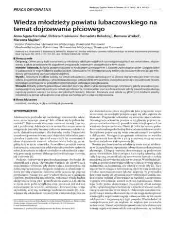 PRACA ORYGINALNA Medycyna Ogólna i Nauki o Zdrowiu, 2015, Tom 21, Nr 3, 317–321 www.monz.pl Wiedza młodzieży powiatu lubaczowskiego na temat dojrzewaniapłciowego Anna Agata Kremska1, Elżbieta Kraśnianin1, Bernadeta Kołodziej1, Romana Wróbel1, Marzena Majdan2 Instytut Położnictwa i Ratownictwa Medycznego, Uniwersytet Rzeszowski Absolwentka Instytutu Położnictwa i Ratownictwa Medycznego, Uniwersytet Rzeszowski 1 2 Kremska AA, Kraśnianin E, Kołodziej B, Wróbel R, Majdan M. Wiedza młodzieży powiatu lubaczowskiego na temat dojrzewania płciowego. Med Og Nauk Zdr. 2015; 21(3): 317–321. doi: 10.5604/20834543.1165360 Streszczenie Cel pracy. Celem pracy była ocena wiedzy młodzieży szkół gimnazjalnych i ponadgimnazjalnych na temat okresu dojrzewania, a także przedstawienie zagadnień związanych z rozwojem seksualności w tym czasie. Materiał i metoda. Badania przeprowadzono w Publicznym Gimnazjum nr 1, Liceum Ogólnokształcącym i Zespole Szkół w Lubaczowie w województwie podkarpackim. Skierowano 190 kwestionariuszy ankiety do losowo wybranej grupy młodzieży gimnazjalnej oraz ponadgimnazjalnej. Wyniki. Głównymi źródłami wiedzy na temat seksualności, zmian zachodzących w okresie dojrzewania jest Internet oraz szkoła. Znajomość przebiegu cyklu miesiączkowego potwierdziło 57% uczniów. Zdecydowanie częściej uczniowie liceum, technikum orientują się w prawidłowej terminologii dotyczącej jajeczkowania. Wnioski. Kobiety potrafią prawidłowo określać pierwszy dzień cyklu miesiączkowego. Uczniowie szkoły zawodowej posiadają najniższy poziom wiedzy na temat jajeczkowania. Gimnazjaliści oraz wychowankowie szkoły zawodowej wykazują najniższy poziom wiedzy na temat dni płodnych kobiety. Internet, literatura oraz szkoła są głównymi źródłami wiedzy młodzieży na temat seksualności oraz zmian zachodzących w okresie dojrzewania. Słowa kluczowe młodzież, owulacja, wpływ rodziny, dojrzewanie Adolescencja pochodzi od łacińskiego czasownika adolescere, oznaczającego „rosnąć” lub „zbliżać się do pełnej doj rzałości”. Dojrzewanie obejmuje zarówno rozwój fizyczny, jak i psychiczny. Adolescencja w sensie fizycznym oznacza osiągnięcie dojrzałej budowy ciała oraz rozwoju cech fizycz nych, charakterystycznych dla dojrzałej osoby. Dojrzałości umysłowej powinna towarzyszyć dojrzałość seksualna, emo cjonalna i społeczna. Spośród wszystkich faz rozwojowych okres dojrzewania stanowi, zdaniem wielu badaczy, szcze gólną fazę w życiu człowieka. Prawidłowe przejście okresu dojrzewania, nauczenie się adekwatnych sposobów radzenia sobie, korzystanie ze zdobytej wiedzy o seksualności stano wią gwarancję zarówno dalszego indywidualnego rozwoju, jak i zdrowia [1]. Podczas dojrzewania psychoseksualnego dochodzi do identyfikacji z płcią. Optymalne warunki do identyfikacji mają miejsce wówczas, gdy dojrzewająca dziewczynka ma dobrą więź uczuciową z obojgiem rodziców, a członkowie ro dziny potrafią wzajemne okazywać sobie uczucia, np. poprzez przytulanie. Ważne jest, aby wychowywała się w udanym, ciepłym środowisku rodzinnym, ponieważ wtedy będzie akceptowała swoją płeć i przeobrażenia ciała [2,3,4]. Matka w życiu córki pełni wyjątkową rolę, ponieważ jest dla niej najważniejszym wzorem kobiecości. Dziewczynka, stając się kobietą, uczy się, naśladując zachowania matki [5]. Roz wijająca się seksualność dziewczynki w okresie dojrzewania - - - - WPROWADZENIE Adres do korespondencji: Anna Agata Kremska, Instytut Położnictwa i Ratownictwa Medycznego, Uniwersytet Rzeszowski, ul. Pigonia 6, 35-310 Rzeszów E-mail: [email protected] - Nadesłano: 1 grudnia 2014; zaakceptowano do druku: 24 marca 2015 jest doświadczana przez nią głównie jako pragnienie więzi uczuciowej, na zewnątrz przejawiającej się jako dążenie do bliskości. Pragnienia seksualne są wówczas nieświadome. Dezintegracja seksualna przejawia się głównie poprzez za przeczenie seksualności i poszukiwanie relacji opartych na więzi oraz bezpieczeństwie. Około 16. roku życia stany pobu dzenia seksualnego dochodzą do świadomości dziewczynki. Początkowo pojawiają się wizje romantycznych związków z chłopcami. Następnie pragnienia seksualne w wyniku nawiązywania kontaktów z płcią przeciwną stają się coraz bardziej świadome i akceptowane [6]. Rozwój psychoseksualny młodzieży może zostać zakłóco ny w przypadku przyśpieszenia lub opóźnienia dojrzewania płciowego. Chłopcy szybciej dojrzewający są podziwiani przez rówieśników. Ma to związek z ich męską sylwetką ciała i siłą fizyczną, co przekłada się zarówno na kontakty z płcią przeciwną, jak również na sukcesy w sporcie. Wiele badań do wodzi, że późno dojrzewający chłopcy częściej bywają spięci, nadmiernie się kontrolują, nie wierzą w swoje siły [2]. Tacy mężczyźni w relacjach heteroseksualnych bywają zamknięci w sobie, ujawniają postawy lękowe, depresję. W przypadku dziewcząt mamy do czynienia z odwrotnym zjawiskiem, tzn. dziewczęta wolniej dojrzewające są bardziej akceptowane w grupie rówieśniczej aniżeli szybciej dojrzewające. Mimo tego osoby późno dojrzewające mają gorszy obraz samego siebie, są bardziej przewrażliwione na punkcie własnej osoby, czują się odrzucone przez innych. Dziewczęta wcześnie roz poczynające miesiączkowanie często nie mogą zaakceptować własnej płci, negatywnie reagują na to zjawisko, są też często zakłopotane i niepokoją się z tego powodu. Warto dodać, iż zaniepokojenie jest tym większe, im większa jest niewiedza na ten temat. Nawet w późniejszym okresie życia dziewczęta te mają negatywny stosunek do miesiączkowania, są bardziej 318 Medycyna Ogólna i Nauki o Zdrowiu, 2015, Tom 21, Nr 3 Anna Agata Kremska, Elżbieta Kraśnianin, Bernadeta Kołodziej, Romana Wróbel, Marzena Majdan. Wiedza młodzieży powiatu lubaczow