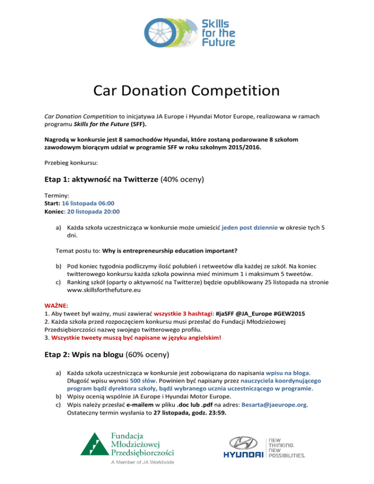 Car Donation Competition Car Donation Competition to inicjatywa JA Europe i Hyundai Motor Europe, realizowana w ramach programu Skills for the Future (SFF). Nagrodą w konkursie jest 8 samochodów Hyundai, które zostaną podarowane 8 szkołom zawodowym biorącym udział w programie SFF w roku szkolnym 2015/2016. Przebieg konkursu: Etap 1: aktywność na Twitterze (40% oceny) Terminy: Start: 16 listopada 06:00 Koniec: 20 listopada 20:00 a) Każda szkoła uczestnicząca w konkursie może umieścić jeden post dziennie w okresie tych 5 dni. Temat postu to: Why is entrepreneurship education important? b) Pod koniec tygodnia podliczymy ilość polubień i retweetów dla każdej ze szkół. Na koniec twitterowego konkursu każda szkoła powinna mieć minimum 1 i maksimum 5 tweetów. c) Ranking szkół (oparty o aktywność na Twitterze) będzie opublikowany 25 listopada na stronie www.skillsforthefuture.eu WAŻNE: 1. Aby tweet był ważny, musi zawierać wszystkie 3 hashtagi: #jaSFF @JA_Europe #GEW2015 2. Każda szkoła przed rozpoczęciem konkursu musi przesłać do Fundacji Młodzieżowej Przedsiębiorczości nazwę swojego twitterowego profilu. 3. Wszystkie tweety muszą być napisane w języku angielskim! Etap 2: Wpis na blogu (60% oceny) a) Każda szkoła uczestnicząca w konkursie jest zobowiązana do napisania wpisu na bloga. Długość wpisu wynosi 500 słów. Powinien być napisany przez nauczyciela koordynującego program bądź dyrektora szkoły, bądź wybranego ucznia uczestniczącego w programie. b) Wpisy ocenią wspólnie JA Europe i Hyundai Motor Europe. c) Wpis należy przesłać e-mailem w pliku .doc lub .pdf na adres: [email protected]. Ostateczny termin wysłania to 27 listopada, godz. 23:59. d) Wymagane elementy związane z wpisem to zdjęcie portretowe autora lub zdjęcia klasowe, uczniów lub nauczyciela. Wpis na blogu powinien być tak sformułowany, aby dał odpowiedzi na następujące pytania: 1. Why is it important to bring entrepreneurship education into vocational schools? 2. What skills does SFF teach your students? 3. Why is it particularly important to connect vocational students with professional mentors/Hyundai volunteers? Ostateczny ranking szkół zostanie ogłoszony 18 grudnia 2015 r. Wpisy nagrodzonych szkół zostaną opublikowane na stronie internetowej SFF oraz w kanałach społecznościowych JA Europe. Aspekty prawne 1. W konkursie mogą uczestniczyć szkoły biorące udział w programie Skills for the Future w roku szkolnym 2015/2016. 2. Szkoły, które otrzymały samochody w poprzednich edycjach konkursu, NIE MOGĄ WZIĄĆ UDZIAŁU w tegorocznym konkursie. 3. Szkoła jest zobowiązana do podpisania umowy uczestnictwa w Car Donation Competition. 4. W konkursie mogą wziąć udział wyłącznie szkoły, których uczestnictwo jest potwierdzone przez Fundację Młodzieżowej Przedsiębiorczości. 5. Nagrodę w konkursie może otrzymać maksymalnie tylko 1 szkoła z danego kraju, bez względu na liczbę szkół biorących udział w konkursie. 6. Szkoły zgadzają się na wykorzystywanie samochodu wyłącznie w celach edukacyjnych. 7. Samochody nie są przeznaczone do jazdy na drogach publicznych i nie mogą być wykorzystane jako środek lokomocji. 8. Szkoła zobowiązana jest do opłacenia podatku związanego z otrzymaniem darowizny, jeżeli wymagają tego odpowiednie przepisy prawno-podatkowe. 9. Hyundai Motor Europe pokrywa koszty związane z transportem samochodu do szkoły. 10. Szkoła podpisuje umowę z Hyundai Motor Europe, podmiotem zrzekającym się praw do samochodu. 11. Żadne wpisy nie będą uwzględniane po upływie terminów określonych w regulaminie. 12. Wszystkie tweety zamieszczane przez szkoły muszą być sformułowane w języku angielskim. Wpisy w innych językach nie będą brane pod uwagę. 13. Wszystkie wpisy na blogu również muszą być w języku angielskim. 14. Hyundai Motor dostarczy zwycięzcom konkursu łącznie 8 samochodów marki Hyundai Jeśli fundator przekaże kolejne egzemplarze podczas trwania konkursu bądź zaraz po jego zakończeniu, Hyundai Motor Europe i JA Europe podejmą decyzję o przyznaniu samochodu kolejnym szkołom na podstawie wyników konkursu oraz regulaminu. Pytania i uwagi dotyczące konkursu należy kierować do JA Europe nie później niż tydzień po ogłoszeniu wyników, za pośrednictwem e-maila do Pani Roxany Stefanescu (JA Europe): [email protected].