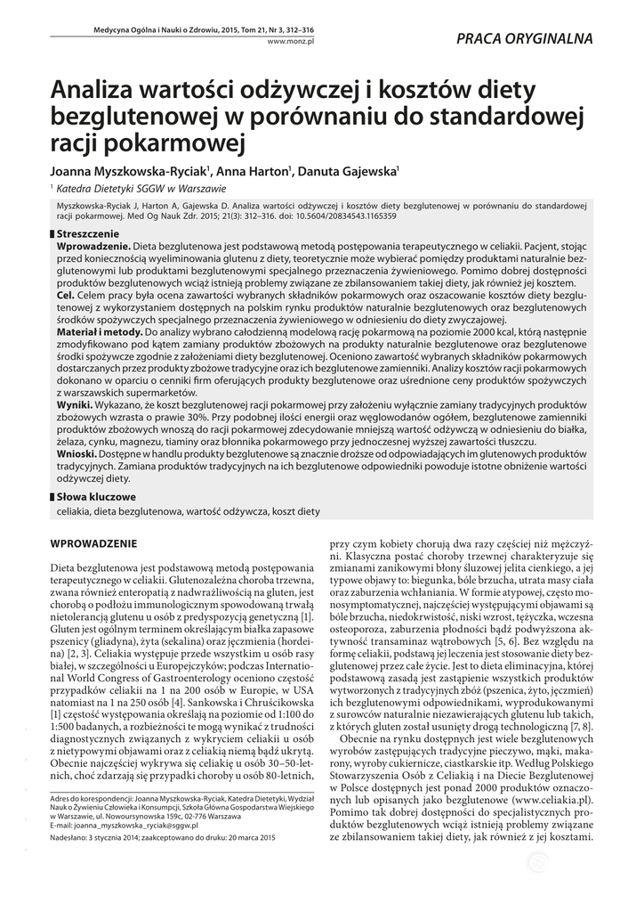 Medycyna Ogólna i Nauki o Zdrowiu, 2015, Tom 21, Nr 3, 312–316 www.monz.pl PRACA ORYGINALNA Analiza wartości odżywczej i kosztów diety bezglutenowej w porównaniu do standardowej racji pokarmowej Joanna Myszkowska-Ryciak1, Anna Harton1, Danuta Gajewska1 1 Katedra Dietetyki SGGW w Warszawie Myszkowska-Ryciak J, Harton A, Gajewska D. Analiza wartości odżywczej i kosztów diety bezglutenowej w porównaniu do standardowej racji pokarmowej. Med Og Nauk Zdr. 2015; 21(3): 312–316. doi: 10.5604/20834543.1165359 Streszczenie Wprowadzenie. Dieta bezglutenowa jest podstawową metodą postępowania terapeutycznego w celiakii. Pacjent, stojąc przed koniecznością wyeliminowania glutenu z diety, teoretycznie może wybierać pomiędzy produktami naturalnie bezglutenowymi lub produktami bezglutenowymi specjalnego przeznaczenia żywieniowego. Pomimo dobrej dostępności produktów bezglutenowych wciąż istnieją problemy związane ze zbilansowaniem takiej diety, jak również jej kosztem. Cel. Celem pracy była ocena zawartości wybranych składników pokarmowych oraz oszacowanie kosztów diety bezglutenowej z wykorzystaniem dostępnych na polskim rynku produktów naturalnie bezglutenowych oraz bezglutenowych środków spożywczych specjalnego przeznaczenia żywieniowego w odniesieniu do diety zwyczajowej. Materiał i metody. Do analizy wybrano całodzienną modelową rację pokarmową na poziomie 2000 kcal, którą następnie zmodyfikowano pod kątem zamiany produktów zbożowych na produkty naturalnie bezglutenowe oraz bezglutenowe środki spożywcze zgodnie z założeniami diety bezglutenowej. Oceniono zawartość wybranych składników pokarmowych dostarczanych przez produkty zbożowe tradycyjne oraz ich bezglutenowe zamienniki. Analizy kosztów racji pokarmowych dokonano w oparciu o cenniki firm oferujących produkty bezglutenowe oraz uśrednione ceny produktów spożywczych z warszawskich supermarketów. Wyniki. Wykazano, że koszt bezglutenowej racji pokarmowej przy założeniu wyłącznie zamiany tradycyjnych produktów zbożowych wzrasta o prawie 30%. Przy podobnej ilości energii oraz węglowodanów ogółem, bezglutenowe zamienniki produktów zbożowych wnoszą do racji pokarmowej zdecydowanie mniejszą wartość odżywczą w odniesieniu do białka, żelaza, cynku, magnezu, tiaminy oraz błonnika pokarmowego przy jednoczesnej wyższej zawartości tłuszczu. Wnioski. Dostępne w handlu produkty bezglutenowe są znacznie droższe od odpowiadających im glutenowych produktów tradycyjnych. Zamiana produktów tradycyjnych na ich bezglutenowe odpowiedniki powoduje istotne obniżenie wartości odżywczej diety. Słowa kluczowe celiakia, dieta bezglutenowa, wartość odżywcza, koszt diety Dieta bezglutenowa jest podstawową metodą postępowania terapeutycznego w celiakii. Glutenozależna choroba trzewna, zwana również enteropatią z nadwrażliwością na gluten, jest chorobą o podłożu immunologicznym spowodowaną trwałą nietolerancją glutenu u osób z predyspozycją genetyczną [1]. Gluten jest ogólnym terminem określającym białka zapasowe pszenicy (gliadyna), żyta (sekalina) oraz jęczmienia (hordeina) [2, 3]. Celiakia występuje przede wszystkim u osób rasy białej, w szczególności u Europejczyków; podczas International World Congress of Gastroenterology oceniono częstość przypadków celiakii na 1 na 200 osób w Europie, w USA natomiast na 1 na 250 osób [4]. Sankowska i Chruścikowska [1] częstość występowania określają na poziomie od 1:100 do 1:500 badanych, a rozbieżności te mogą wynikać z trudności diagnostycznych związanych z wykryciem celiakii u osób z nietypowymi objawami oraz z celiakią niemą bądź ukrytą. Obecnie najczęściej wykrywa się celiakię u osób 30–50-letnich, choć zdarzają się przypadki choroby u osób 80-letnich, - - - - WPROWADZENIE Adres do korespondencji: Joanna Myszkowska-Ryciak, Katedra Dietetyki, Wydział Nauk o Żywieniu Człowieka i Konsumpcji, Szkoła Główna Gospodarstwa Wiejskiego w Warszawie, ul. Nowoursynowska 159c, 02-776 Warszawa E-mail: [email protected] - Nadesłano: 3 stycznia 2014; zaakceptowano do druku: 20 marca 2015 przy czym kobiety chorują dwa razy częściej niż mężczyźni. Klasyczna postać choroby trzewnej charakteryzuje się zmianami zanikowymi błony śluzowej jelita cienkiego, a jej typowe objawy to: biegunka, bóle brzucha, utrata masy ciała oraz zaburzenia wchłaniania. W formie atypowej, często monosymptomatycznej, najczęściej występującymi objawami są bóle brzucha, niedokrwistość, niski wzrost, tężyczka, wczesna osteoporoza, zaburzenia płodności bądź podwyższona aktywność transaminaz wątrobowych [5, 6]. Bez względu na formę celiakii, podstawą jej leczenia jest stosowanie diety bezglutenowej przez całe życie. Jest to dieta eliminacyjna, której podstawową zasadą jest zastąpienie wszystkich produktów wytworzonych z tradycyjnych zbóż (pszenica, żyto, jęczmień) ich bezglutenowymi odpowiednikami, wyprodukowanymi z surowców naturalnie niezawierających glutenu lub takich, z których gluten został usunięty drogą technologiczną [7, 8]. Obecnie na rynku dostępnych jest wiele bezglutenowych wyrobów zastępujących tradycyjne pieczywo, mąki, makarony, wyroby cukiernicze, ciastkarskie itp. Według Polskiego Stowarzyszenia Osób z Celiakią i na Diecie Bezglutenowej w Polsce dostępnych jest ponad 2000 produktów oznaczonych lub opisanych jako bezglutenowe (www.celiakia.pl). Pomimo tak dobrej dostępności do specjalistycznych produktów bezglutenowych wciąż istnieją problemy związane ze zbilansowaniem takiej diety, jak również z jej kosztami. Medycyna Ogólna i Nauki o Zdrowiu, 2015, Tom 21, Nr 3 313 Joanna Myszkowska-Ryciak, Anna Harton, Danuta Gajewska. Analiza wartości odżywczej i kosztów diety bezglutenowej w porównaniu do standardowej racji pokarmowej W literaturze można spotkać się z doniesieniami na temat występowania niedoborów s