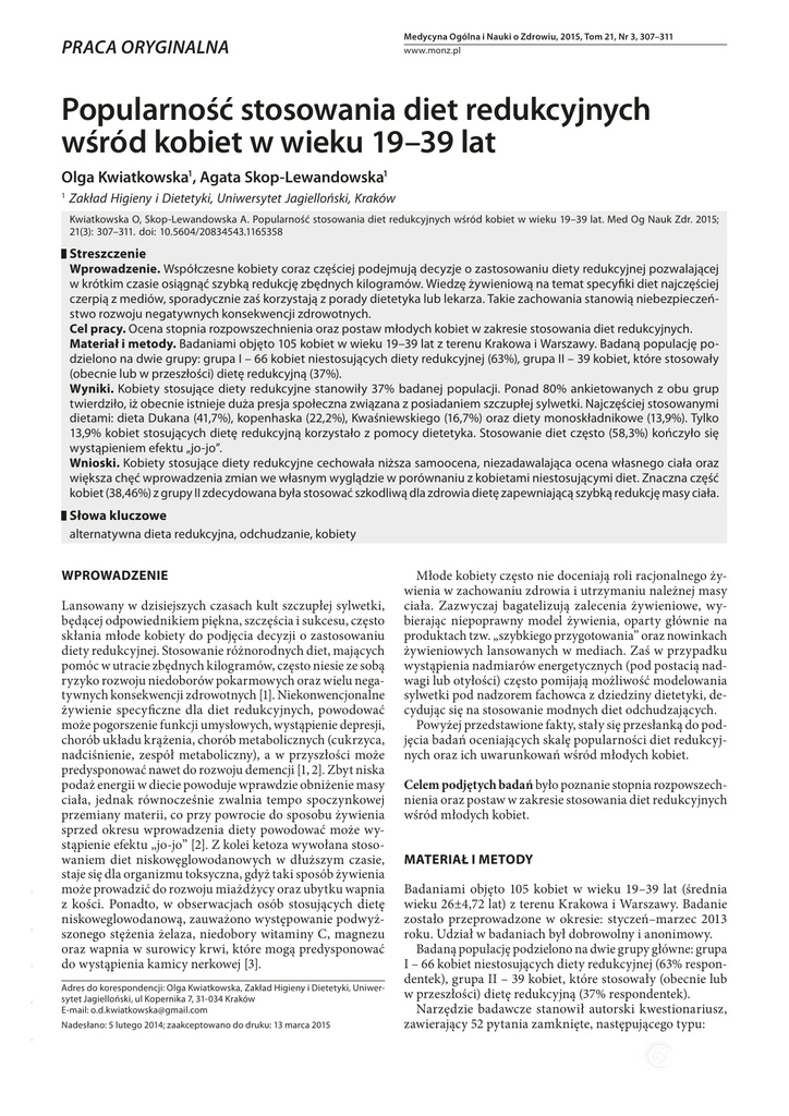 PRACA ORYGINALNA Medycyna Ogólna i Nauki o Zdrowiu, 2015, Tom 21, Nr 3, 307–311 www.monz.pl Popularność stosowania diet redukcyjnych wśród kobiet w wieku 19–39 lat Olga Kwiatkowska1, Agata Skop-Lewandowska1 1 Zakład Higieny i Dietetyki, Uniwersytet Jagielloński, Kraków Kwiatkowska O, Skop-Lewandowska A. Popularność stosowania diet redukcyjnych wśród kobiet w wieku 19–39 lat. Med Og Nauk Zdr. 2015; 21(3): 307–311. doi: 10.5604/20834543.1165358 Streszczenie Wprowadzenie. Współczesne kobiety coraz częściej podejmują decyzje o zastosowaniu diety redukcyjnej pozwalającej w krótkim czasie osiągnąć szybką redukcję zbędnych kilogramów. Wiedzę żywieniową na temat specyfiki diet najczęściej czerpią z mediów, sporadycznie zaś korzystają z porady dietetyka lub lekarza. Takie zachowania stanowią niebezpieczeństwo rozwoju negatywnych konsekwencji zdrowotnych. Cel pracy. Ocena stopnia rozpowszechnienia oraz postaw młodych kobiet w zakresie stosowania diet redukcyjnych. Materiał i metody. Badaniami objęto 105 kobiet w wieku 19–39 lat z terenu Krakowa i Warszawy. Badaną populację podzielono na dwie grupy: grupa I – 66 kobiet niestosujących diety redukcyjnej (63%), grupa II – 39 kobiet, które stosowały (obecnie lub w przeszłości) dietę redukcyjną (37%). Wyniki. Kobiety stosujące diety redukcyjne stanowiły 37% badanej populacji. Ponad 80% ankietowanych z obu grup twierdziło, iż obecnie istnieje duża presja społeczna związana z posiadaniem szczupłej sylwetki. Najczęściej stosowanymi dietami: dieta Dukana (41,7%), kopenhaska (22,2%), Kwaśniewskiego (16,7%) oraz diety monoskładnikowe (13,9%). Tylko 13,9% kobiet stosujących dietę redukcyjną korzystało z pomocy dietetyka. Stosowanie diet często (58,3%) kończyło się wystąpieniem efektu „jo-jo”. Wnioski. Kobiety stosujące diety redukcyjne cechowała niższa samoocena, niezadawalająca ocena własnego ciała oraz większa chęć wprowadzenia zmian we własnym wyglądzie w porównaniu z kobietami niestosującymi diet. Znaczna część kobiet (38,46%) z grupy II zdecydowana była stosować szkodliwą dla zdrowia dietę zapewniającą szybką redukcję masy ciała. Słowa kluczowe alternatywna dieta redukcyjna, odchudzanie, kobiety - - - - WPROWADZENIE Lansowany w dzisiejszych czasach kult szczupłej sylwetki, będącej odpowiednikiem piękna, szczęścia i sukcesu, często skłania młode kobiety do podjęcia decyzji o zastosowaniu diety redukcyjnej. Stosowanie różnorodnych diet, mających pomóc w utracie zbędnych kilogramów, często niesie ze sobą ryzyko rozwoju niedoborów pokarmowych oraz wielu negatywnych konsekwencji zdrowotnych [1]. Niekonwencjonalne żywienie specyficzne dla diet redukcyjnych, powodować może pogorszenie funkcji umysłowych, wystąpienie depresji, chorób układu krążenia, chorób metabolicznych (cukrzyca, nadciśnienie, zespół metaboliczny), a w przyszłości może predysponować nawet do rozwoju demencji [1, 2]. Zbyt niska podaż energii w diecie powoduje wprawdzie obniżenie masy ciała, jednak równocześnie zwalnia tempo spoczynkowej przemiany materii, co przy powrocie do sposobu żywienia sprzed okresu wprowadzenia diety powodować może wystąpienie efektu „jo-jo” [2]. Z kolei ketoza wywołana stosowaniem diet niskowęglowodanowych w dłuższym czasie, staje się dla organizmu toksyczna, gdyż taki sposób żywienia może prowadzić do rozwoju miażdżycy oraz ubytku wapnia z kości. Ponadto, w obserwacjach osób stosujących dietę niskoweglowodanową, zauważono występowanie podwyższonego stężenia żelaza, niedobory witaminy C, magnezu oraz wapnia w surowicy krwi, które mogą predysponować do wystąpienia kamicy nerkowej [3]. Adres do korespondencji: Olga Kwiatkowska, Zakład Higieny i Dietetyki, Uniwersytet Jagielloński, ul Kopernika 7, 31-034 Kraków E-mail: [email protected] - Nadesłano: 5 lutego 2014; zaakceptowano do druku: 13 marca 2015 Młode kobiety często nie doceniają roli racjonalnego żywienia w zachowaniu zdrowia i utrzymaniu należnej masy ciała. Zazwyczaj bagatelizują zalecenia żywieniowe, wybierając niepoprawny model żywienia, oparty głównie na produktach tzw. „szybkiego przygotowania” oraz nowinkach żywieniowych lansowanych w mediach. Zaś w przypadku wystąpienia nadmiarów energetycznych (pod postacią nadwagi lub otyłości) często pomijają możliwość modelowania sylwetki pod nadzorem fachowca z dziedziny dietetyki, decydując się na stosowanie modnych diet odchudzających. Powyżej przedstawione fakty, stały się przesłanką do podjęcia badań oceniających skalę popularności diet redukcyjnych oraz ich uwarunkowań wśród młodych kobiet. Celem podjętych badań było poznanie stopnia rozpowszechnienia oraz postaw w zakresie stosowania diet redukcyjnych wśród młodych kobiet. MATERIAŁ I METODY Badaniami objęto 105 kobiet w wieku 19–39 lat (średnia wieku 26±4,72 lat) z terenu Krakowa i Warszawy. Badanie zostało przeprowadzone w okresie: styczeń–marzec 2013 roku. Udział w badaniach był dobrowolny i anonimowy. Badaną populację podzielono na dwie grupy główne: grupa I – 66 kobiet niestosujących diety redukcyjnej (63% respondentek), grupa II – 39 kobiet, które stosowały (obecnie lub w przeszłości) dietę redukcyjną (37% respondentek). Narzędzie badawcze stanowił autorski kwestionariusz, zawierający 52 pytania zamknięte, następującego typu: 308 Medycyna Ogólna i Nauki o Zdrowiu, 2015, Tom 21, Nr 3 Olga Kwiatkowska, Agata Skop-Lewandowska. Popularność stosowania diet redukcyjnych wśród kobiet w wieku 19–39 lat – 41 pytań dotyczących znajomości diet redukcyjnych, stosowania diet redukcyjnych, przyczyn przejścia na dietę oraz stosunku do diet redukcyjnych, a także pytania na temat samooceny; – 11 pytań dostarczających danych na temat: poziomu wykształcenia, stanu cywilnego, obszaru zamieszkania. Ponadto u wszystkich respondentek wykon