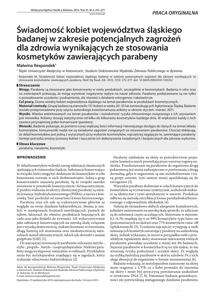 Medycyna Ogólna i Nauki o Zdrowiu, 2015, Tom 21, Nr 3, 272–277 www.monz.pl PRACA ORYGINALNA Świadomość kobiet województwa śląskiego badanej w zakresie potencjalnych zagrożeń dla zdrowia wynikających ze stosowania kosmetyków zawierających parabeny Malwina Respondek1 1 Śląski Uniwersytet Medyczny w Katowicach, Studium Doktoranckie Wydziału Zdrowia Publicznego w Bytomiu Respondek M. Świadomość kobiet województwa śląskiego badanej w zakresie potencjalnych zagrożeń dla zdrowia wynikających ze stosowania kosmetyków zawierających parabeny. Med Og Nauk Zdr. 2015; 21(3): 272–277. doi: 10.5604/20834543.1165352 Streszczenie Wstęp. Parabeny są stosowane jako konserwanty w wielu produktach, szczególnie w kosmetykach. Badania in vitro oraz na zwierzętach pokazują, że mogą wywierać negatywny wpływ na nasze zdrowie. Parabeny podejrzewane są nie tylko o powodowanie uczulenia i podrażnienia, ale również o działanie estrogenne i rakotwórcze. Cel pracy. Ocena wiedzy kobiet województwa śląskiego na temat parabenów w produktach kosmetycznych. Materiał i metody. Grupę badawczą stanowiło 151 kobiet w wieku 20–55 lat zamieszkujących Aglomeracje Śląską. Badanie zostało przeprowadzone przy użyciu autorskiego kwestionariusza ankiety w okresie styczeń–marzec 2011. Wyniki. Wiedza ankietowanych na temat parabenów i świadomość ryzyka zdrowotnego związanego z ich używaniem jest niewielka. Kobiety stosują statystycznie od kilku do kilkunastu kosmetyków każdego dnia. W większości każdy z nich zawiera przynajmniej jeden konserwant (paraben). Wnioski. Badanie pokazuje, że pomimo coraz większej ilości informacji i łatwiejszego dostępu do danych na temat składu kosmetyków, konsumentki nadal nie są świadome zagrożeń związanych ze stosowaniem parabenów. Chociaż deklarują, że skład kosmetyków jest jedną z wytycznych przy wyborze kosmetyków, najczęściej sięgają po te, zawierające parabeny. Istnieje potrzeba zmiany postawy kobiet i nauczenie ich dokonywania świadomych i bezpiecznych dla zdrowia wyborów. Słowa kluczowe parabeny, narażenie, kosmetyki W skład kosmetyków wchodzi szereg substancji chemicznych spełniających różnorodne funkcje. Substancje konserwujące to związki, które mogą być dodawane do kosmetyków w celu hamowania rozwoju w nich drobnoustrojów. Jedną z grup konserwantów stanowią parabeny. Są to związki szeroko stosowane w przemyśle kosmetycznym i farmaceutycznym. Z punktu widzenia struktury chemicznej parabeny są estrami kwasu p-hydroksybenzoesowego (PHBA), a nazwa z końcówką ‘ben’ pochodzi od zawartości kwasu benzoesowego. Parabeny oraz ich sole są wykorzystywane głównie ze względu na swoje działanie bakteriobójcze. Można je znaleźć w szamponach, kremach nawilżających, pastach do zębów, lakierach do włosów, produktach brązujących do ciała oraz jako dodatki do żywności. Ich wykorzystywanie jako substancji konserwujących na szeroką skalę związane jest z wysoką skutecznością, niskimi kosztami wytworzenia, długą historią ich stosowania oraz nieskutecznością naturalnych metod alternatywnych, takich jak ekstrakt z nasion grejpfruta (GSE) [1]. Do najczęściej stosowanych parabenów zaliczamy metylo-, etylo-, propylo-, butylo- i isopropyloparaben. Niektóre parabeny mogą występować naturalnie w roślinach. Przykładem może być metyloparaben znajdujący się w jagodach, który wykazuje właściwości bakteriobójcze [2]. - - - - WPROWADZENIE Adres do korespondencji: Malwina Respondek, Śląski Uniwersytet Medyczny w Katowicach, Studium Doktoranckie Wydziału Zdrowia Publicznego w Bytomiu, ul. Piekarska 18, 41-902 Bytom E-mail: [email protected] - Nadesłano: 27 października 2014; zaakceptowano do druku: 16 marca 2015 Parabeny nakładane na skórę za pośrednictwem preparatów kosmetycznych przenikają przez warstwę rogową naskórka. Przedostawanie się parabenów do organizmu drogą pokarmową jest mniej niebezpieczne w porównaniu z drogą dermalną, gdyż w organizmie są one metabolizowane i tracą grupy estrowe, tym samym mniej upodabniają się do estrogenów [3]. Wszystkie parabeny dodawane w celach komercyjnych do kosmetyków są wytwarzane syntetycznie, aczkolwiek niektóre są identyczne z tymi spotykanymi w naturze. Produkcja odbywa się metodą estryfikacji kwasu parahydroksybenzoesowego z odpowiednim alkoholem [4]. Należą do stosunkowo słabych alergenów kontaktowych, jednakże zastosowanie na szeroką skalę sprawiło, że zaliczane są do substancji często uczulających. Stosowane w stężeniu: 0,1–0,3% znajdują się w aż 99% kosmetyków typu leave-on (pozostawianych na skórze) oraz 77% kosmetyków rinse-off (spłukiwanych) [5]. Uczulenia najczęściej występują u osób nanoszących kosmetyk zawierający parabeny na uszkodzoną skórę. Jednak wykazano, że nawet w przypadku osób z przewlekłym zapaleniem skóry stosowanie mieszaniny różnych parabenów powoduje uczulenia u mniej niż 4% badanych. Stężenia parabenów w kosmetykach są na tyle niskie, że nie stwarzają ryzyka podrażnień i uczuleń skóry. Ze względu na szybką hydrolizę parabenów w skórze zaledwie 1% z nich ulega absorpcji do organizmu w formie niezmienionej [6]. Badania wskazują, że metyloparaben nanoszony na skórę może reagować z UVB, co z kolei prowadzi do starzenia się skóry i może być przyczyną powstawania uszkodzeń w strukturze DNA [7, 8]. Natomiast badania genotoksyczności nie potwierdzają mutagennego działania parabenów, Medycyna Ogólna i Nauki o Zdrowiu, 2015, Tom 21, Nr 3 Malwina Respondek . Świadomość kobiet województwa śląskiego badanej w zakresie potencjalnych zagrożeń dla zdrowia wynikających ze stosowania… takich właściwości nie stwierdzono ani w testach Amesa, jak również w testach cytogenetycznych [6]. Parabeny są podejrzane o zakłócanie działania układu dokrewnego. Ponadto wykazano związek pomięd