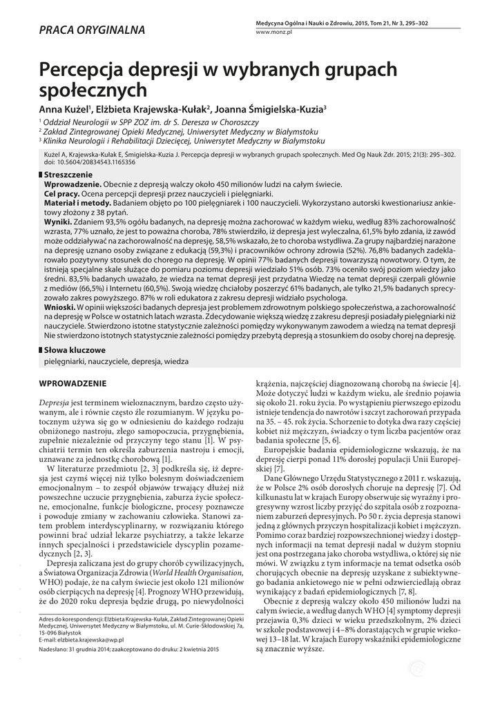 PRACA ORYGINALNA Medycyna Ogólna i Nauki o Zdrowiu, 2015, Tom 21, Nr 3, 295–302 www.monz.pl Percepcja depresji w wybranych grupach społecznych Anna Kużel1, Elżbieta Krajewska-Kułak2, Joanna Śmigielska-Kuzia3 Oddział Neurologii w SPP ZOZ im. dr S. Deresza w Choroszczy Zakład Zintegrowanej Opieki Medycznej, Uniwersytet Medyczny w Białymstoku 3 Klinika Neurologii i Rehabilitacji Dziecięcej, Uniwersytet Medyczny w Białymstoku 1 2 Kużel A, Krajewska-Kułak E, Śmigielska-Kuzia J. Percepcja depresji w wybranych grupach społecznych. Med Og Nauk Zdr. 2015; 21(3): 295–302. doi: 10.5604/20834543.1165356 Streszczenie Wprowadzenie. Obecnie z depresją walczy około 450 milionów ludzi na całym świecie. Cel pracy. Ocena percepcji depresji przez nauczycieli i pielęgniarki. Materiał i metody. Badaniem objęto po 100 pielęgniarek i 100 nauczycieli. Wykorzystano autorski kwestionariusz ankietowy złożony z 38 pytań. Wyniki. Zdaniem 93,5% ogółu badanych, na depresję można zachorować w każdym wieku, według 83% zachorowalność wzrasta, 77% uznało, że jest to poważna choroba, 78% stwierdziło, iż depresja jest wyleczalna, 61,5% było zdania, iż zawód może oddziaływać na zachorowalność na depresję, 58,5% wskazało, że to choroba wstydliwa. Za grupy najbardziej narażone na depresję uznano osoby związane z edukacją (59,3%) i pracowników ochrony zdrowia (52%). 76,8% badanych zadeklarowało pozytywny stosunek do chorego na depresję. W opinii 77% badanych depresji towarzyszą nowotwory. O tym, że istnieją specjalne skale służące do pomiaru poziomu depresji wiedziało 51% osób. 73% oceniło swój poziom wiedzy jako średni. 83,5% badanych uważało, że wiedza na temat depresji jest przydatna Wiedzę na temat depresji czerpali głównie z mediów (66,5%) i Internetu (60,5%). Swoją wiedzę chciałoby poszerzyć 61% badanych, ale tylko 21,5% badanych sprecyzowało zakres powyższego. 87% w roli edukatora z zakresu depresji widziało psychologa. Wnioski. W opinii większości badanych depresja jest problemem zdrowotnym polskiego społeczeństwa, a zachorowalność na depresję w Polsce w ostatnich latach wzrasta. Zdecydowanie większą wiedzę z zakresu depresji posiadały pielęgniarki niż nauczyciele. Stwierdzono istotne statystycznie zależności pomiędzy wykonywanym zawodem a wiedzą na temat depresji Nie stwierdzono istotnych statystycznie zależności pomiędzy przebytą depresją a stosunkiem do osoby chorej na depresję. Słowa kluczowe pielęgniarki, nauczyciele, depresja, wiedza Depresja jest terminem wieloznacznym, bardzo często używanym, ale i równie często źle rozumianym. W języku potocznym używa się go w odniesieniu do każdego rodzaju obniżonego nastroju, złego samopoczucia, przygnębienia, zupełnie niezależnie od przyczyny tego stanu [1]. W psychiatrii termin ten określa zaburzenia nastroju i emocji, uznawane za jednostkę chorobową [1]. W literaturze przedmiotu [2, 3] podkreśla się, iż depresja jest czymś więcej niż tylko bolesnym doświadczeniem emocjonalnym – to zespół objawów trwający dłużej niż powszechne uczucie przygnębienia, zaburza życie społeczne, emocjonalne, funkcje biologiczne, procesy poznawcze i powoduje zmiany w zachowaniu człowieka. Stanowi zatem problem interdyscyplinarny, w rozwiązaniu którego powinni brać udział lekarze psychiatrzy, a także lekarze innych specjalności i przedstawiciele dyscyplin pozamedycznych [2, 3]. Depresja zaliczana jest do grupy chorób cywilizacyjnych, a Światowa Organizacja Zdrowia (World Health Organisation, WHO) podaje, że na całym świecie jest około 121 milionów osób cierpiących na depresję [4]. Prognozy WHO przewidują, że do 2020 roku depresja będzie drugą, po niewydolności - - - - WPROWADZENIE Adres do korespondencji: Elżbieta Krajewska-Kułak, Zakład Zintegrowanej Opieki Medycznej, Uniwersytet Medyczny w Białymstoku, ul. M. Curie-Skłodowskiej 7a, 15-096 Białystok E-mail: [email protected] - Nadesłano: 31 grudnia 2014; zaakceptowano do druku: 2 kwietnia 2015 krążenia, najczęściej diagnozowaną chorobą na świecie [4]. Może dotyczyć ludzi w każdym wieku, ale średnio pojawia się około 21. roku życia. Po wystąpieniu pierwszego epizodu istnieje tendencja do nawrotów i szczyt zachorowań przypada na 35. – 45. rok życia. Schorzenie to dotyka dwa razy częściej kobiet niż mężczyzn, świadczy o tym liczba pacjentów oraz badania społeczne [5, 6]. Europejskie badania epidemiologiczne wskazują, że na depresję cierpi ponad 11% dorosłej populacji Unii Europejskiej [7]. Dane Głównego Urzędu Statystycznego z 2011 r. wskazują, że w Polsce 2% osób dorosłych choruje na depresję [7]. Od kilkunastu lat w krajach Europy obserwuje się wyraźny i progresywny wzrost liczby przyjęć do szpitala osób z rozpoznaniem zaburzeń depresyjnych. Po 50 r. życia depresja stanowi jedną z głównych przyczyn hospitalizacji kobiet i mężczyzn. Pomimo coraz bardziej rozpowszechnionej wiedzy i dostępnych informacji na temat depresji nadal w dużym stopniu jest ona postrzegana jako choroba wstydliwa, o której się nie mówi. W związku z tym informacje na temat odsetka osób chorujących obecnie na depresję uzyskane z subiektywnego badania ankietowego nie w pełni odzwierciedlają obraz wynikający z badań epidemiologicznych [7, 8]. Obecnie z depresją walczy około 450 milionów ludzi na całym świecie, a według danych WHO [4] symptomy depresji przejawia 0,3% dzieci w wieku przedszkolnym, 2% dzieci w szkole podstawowej i 4–8% dorastających w grupie wiekowej 13–18 lat. W krajach Europy wskaźniki epidemiologiczne są znacznie wyższe. 296 Medycyna Ogólna i Nauki o Zdrowiu, 2015, Tom 21, Nr 3 Anna Kużel, Elżbieta Krajewska-Kułak, Joanna Śmigielska-Kuzia. Percepcja depresji w wybranych grupach społecznych Stresogenność niektórych zawodów (za Kliszcz i wsp. [9]) bywa częstym problemem, jakim zajmują się badacze anali