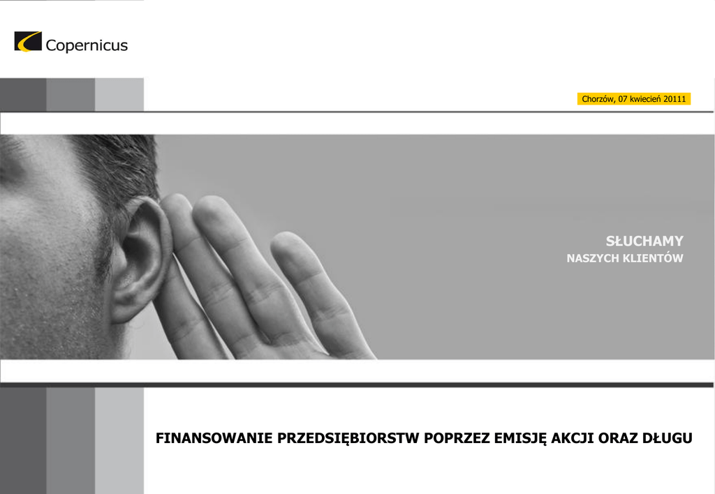 Chorzów, 07 kwiecień 20111 SŁUCHAMY NASZYCH KLIENTÓW FINANSOWANIE PRZEDSIĘBIORSTW POPRZEZ EMISJĘ AKCJI ORAZ DŁUGU PODSUMOWANIE – O NAS Działamy na rynku kapitałowym od 1996 roku, a od grudnia 2005 jako akcjonariusze oraz Zarząd domu maklerskiego Suprema Securities, później Copernicus Securities S.A. W styczniu 2008 dokonaliśmy wykupu menedżerskiego domu maklerskiego Suprema Securities (od lutego 2008 Copernicus Securities S.A.). Oferujemy kompleksowe usługi finansowe z zakresu corporate finance, asset mamangement oraz capital markets Nie angażujemy się w ryzykowne transakcje – większość naszych przychodów i zysków pochodzi z opłat i prowizji Wiodący akcjonariusze (niemal 80% akcji) Grupy Copernicus to: Marcin Billewicz, Marek Witkowski, Radosław Solan W 2008 roku sfinalizowaliśmy transakcję nabycia 100% akcji Copernicus Capital TFI, największego pod względem aktywów niezależnego TFI Jesteśmy członkiem GPW, działamy na rynku NewConnect, jesteśmy aktywni na rynku animacji (GPW i NC, 4 pozycja) Od lipca 2010 roku Copernicus Securities SA notowany jest na rynku NewConnect, planujemy przeniesienie na rynek regulowany w 3Q2011 Zatrudniamy 60 osób 2009A 2010E 2011F Przychody 20,4 24,0 NA Zysk netto 3,9 7,1 14,0 EPS 3,5 6,3 12,4 1 STRUKTURA GRUPY COPERNICUS COPERNICUS SECURITIES S.A. Copernicus Securities jest prywatnym domem maklerskim specjalizującym się w świadczeniu usług z zakresu Corporate Finance oraz COPERNICUS CAPITAL TFI S.A. Capital Markets. Koncentruje się na obsłudze firm o średniej kapitalizacji (do ok. 1 mld euro) oraz zamożnych osób fizycznych MCF ACCOUNTING SERVICES SP. Z O.O. Copernicus Capital TFI specjalizuje się w tworzeniu i zarządzaniu funduszami inwestycyjnymi zamkniętymi, w tym dedykowanymi strukturami oraz funduszami sekurytyzacyjnymi. W zakresie Funduszy Inwestycyjnych Zamkniętych jest zdecydowanym COPERNICUS SERVICES SP. Z O.O. liderem na rynku polski MCF Accounting Services Sp. z o.o. świadczy usługi z zakresu księgowości zarówno Funduszy Inwestycyjnych jak i spółek COPERNICUS INVESTMENT LIMITED Copernicus Services Sp. z o.o. świadczy usługi z zakresu corporate finance: CC12 FIZ inwestycyjnymi pozyskiwanie kapitału, doradztwo przy fuzjach i przejęciach, obsługa emisji obligacji oraz sporządzanie wycen spółek COPERNICUS SERVICES SP. Z O.O. SKA 2 KONCENTRUJEMY SIĘ NA DWÓCH GRUPACH KLIENTÓW INSTYTUCJONALNY PRYWATNY Pozyskiwanie kapitału na rozwój – akcje, obligacje zamienne, obligacje Optymalizacja podatkowa Doradztwo w zakresie fuzji i przejęć Animator Nabywanie akcji celem umorzenia Przygotowywanie raportów analitycznych Zarządzanie aktywami – portfele oraz fundusze Inwestycje w obligacje korporacyjne – alternatywa dla lokat bankowych Bezpośrednie inwestowanie na GPW Udział w emisjach prywatnych Optymalizacje podatkowe 3 LIDER NA NIEBANKOWYM RYNKU EMISJI OBLIGACJI KORPORACYJNYCH ORGANIZATOR / OBLIGACJE I OBLIGACJE PRZYCHODOWE (MLN PLN) Pekao SA 5 637,78 BRE Bank 3 229,87 ING Bank Śląski 2 834,00 PKO Bank Polski 1 711,17 Nordea Bank Polska 1 461,81 Copernicus Securities SA 678,55 Bank Handlowy 605,64 Bank BPS/Dom Maklerski Banku BPS 322,95 Polski Bank Przedsiębiorczości 200,00 Dom Maklerski IDMSA 191,83 IPOPEMA Securities S.A. 150,00 Raiffeisen Bank 94,50 Societe Generale 67,20 DB 50,00 Bank DnB NORD Polska S.A. 30,48 BGŻ 20,10 DM AmerBrokers 16,00 HSBC / Larchmont Finance 14,00 BGK 12,00 Kredyt Bank ORGANIZATOR / OBLIGACJE ZAMIENNE (MLN PLN) UDZIAŁ ORGANIZATORÓW W RYNKU OBLIGACJI PRZEDSIĘBIORSTW [ 2010R] 4,90 Źródło: Fitch Polska 4 PONAD 1 MLD ZŁ EMISJI OBLIGACJI 5 SPECJALIZUJEMY SIĘ W RYNKU ZWIĄZANYM Z BUDOWNICTWEM OSTATNIE TRANSAKCJE NA EQUITY 6 FINANSOWANIE PRZEDSIĘBIORSTW POZYSKANIE KAPITAŁU • • • • Analiza potrzeb – kapitał własny vs. kapitał obcy Wybór doradców Analiza możliwości – historia inwestycyjna, nabywcy Realizacja Elementy podstawowe: Obligacje proste, obligacje zamienne, obligacje z prawem pierwszeństwa Czas trwania (tenor) obligacji Oprocentowanie stałe vs. zmienne Obligacje zerokuponowe vs. obligacje z kuponem Spread, czyli marża Kowenanty Emisja prywatna vs. emisja publiczna OBLIGACJE Elementy podstawowe: Emisja prywatna vs. Emisja publiczna Umowa inwestycyjna Czynniki mające wpływ na powodzenie oferty: Branża Historia inwestycyjna Zarząd Cena Doradca AKCJE 7 GRUPY INWESTORÓW „Typowi” inwestorzy indywidualni Aniołowie biznesu INWESTORZY INDYWIDUALNI Otwarte fundusze emerytalne Towarzysztwa funduszy inwestycyjnych ZAGRANICZNI INWESTORZY INSTYTUCJONALNI Firmy ubezpieczeniowe Fundusze private equity POLSCY INWESTORZY Pozostali INSTYTUCJONALNI 8 DEPARTAMENT SRZEDAŻY WARSZAWA ul. Grójecka 5, 02-019 Warszawa Agnieszka Kwaczyńska: K.: +48 693 465 158 Maciej Chodyna: K.: +48 784 029 478 [email protected] KATOWICE ul. Opolska 22, 40-084 Katowice Marek Skrzynecki: K.: +48 606 797 909 [email protected] GDYNIA ul. Władysława IV 43, 81-395 Gdynia Romuald Olchowicz: K.: +48 600 889 694 [email protected] ŁÓDŹ Wojciech Soliński: K.:+48 609 697 357 [email protected] POZNAŃ Wojciech Domaradzki: K.:+48 609 646 546 [email protected] GRUPA COPERNICUS Telefon: +48 22 44 00 100 | +48 22 44 00 101 Fax: +48 22 44 00 105 | +48 22 44 00 106 www.copernicus.pl | [email protected] WROCŁAW ul. Kazimierza Wielkiego 1, 50-077 Wrocław Anna Rzońca - Majdańska: K.:+48 609 598 878 [email protected] KRAKÓW ul. Pilotów 2, 31-462 Kraków Dariusz Rusek: K.: +48 609 598 018 [email protected] 9