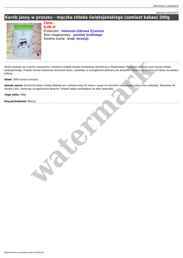 Informacje o produkcie Utworzono 02-03-2017 Karob jasny w proszku - mączka chleba świętojańskiego (zamiast kakao) 200g Cena : 9,00 zl Producent : Intenson-Zdrowa Zywnosc Stan magazynowy : poniżej średniego Średnia ocena : brak recenzji Skład: 100% karob w proszku er m ar k Karob uzyskuje się w wyniku wysuszenia i zmielenia strąków drzewa karobowego (Szarańczynu Strąkowego). Potocznie nazywany jest mączką chleba świętojańskiego. Produkt stanowi doskonały zamiennik kakao, czekolady, w szczególności polecany dla alergików. Karob w odróżnieniu od kakao nie zawiera kofeiny. Sposób użycia: Zamiennik kakao (należy dodawać go o połowę mniej niż kakao z uwagi na naturalnie występujące cukry) oraz czekolady. Stosowany do wyrobu ciast, ciasteczek, przygotowania deserów. Produkt należy wprowadzać do diety stopniowo. Waga netto: 200g w at Kraj pochodzenia: Włochy. Wygenerowano w programie www.oscGold.com