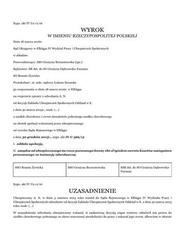 Sygn. akt IV Ua 11/16 WYROK W IMIENIU RZECZYPOSPOLITEJ POLSKIEJ Dnia 18 marca 2016r. Sąd Okręgowy w Elblągu IV Wydział Pracy i Ubezpieczeń Społecznych w składzie: Przewodniczący: SSO Grażyna Borzestowska (spr.) Sędziowie: SR del. do SO Grażyna Dąbrowska-Furman SO Renata Żywicka Protokolant : st. sekr. sądowy Łukasz Szramke po rozpoznaniu w dniu 18 marca 2016r. w Elblągu na rozprawie sprawy z odwołania A. N. od decyzji Zakładu Ubezpieczeń Społecznych Oddział w E. z dnia 30 marca 2015r., znak: (...) o zasiłek chorobowy i zwrot nienależnie pobranego zasiłku chorobowego na skutek apelacji wniesionej przez ubezpieczonego od wyroku Sądu Rejonowego w Elblągu z dnia 30 grudnia 2015r., sygn. akt IV U 366/15 I. oddala apelację, II. zasądza od ubezpieczonego na rzecz pozwanego kwotę 180 zł tytułem zwrotu kosztów zastępstwa procesowego za instancję odwoławczą. SSO Renata Żywicka SSO Grażyna Borzestowska SSR del. do SO Grażyna DąbrowskaFurman Sygn. akt IV Ua 11/16 UZASADNIENIE Ubezpieczony A. N. w dniu 3 czerwca 2015 roku wniósł do Sądu Rejonowego w Elblągu IV Wydziału Pracy i Ubezpieczeń Społecznych odwołanie od decyzji Zakładu Ubezpieczeń Społecznych Oddział w E. z dnia 30 marca 2015 roku znak: (...). W uzasadnieniu odwołania ubezpieczony wskazał, iż zaskarżoną decyzją organ rentowy odmówił mu prawa do zasiłku chorobowego pobranego za okres orzeczonej niezdolności do pracy i nakazał jego zwrot, albowiem w okresie niezdolności do pracy czynnie uczestniczył w polowaniach. Tym samym Zakład Ubezpieczeń Społecznych Oddział w E. przyjął, że uczestnictwo w polowaniach było zachowaniem niezgodnym z celem zwolnienia lekarskiego. W dalszej części uzasadnienia ubezpieczony podniósł, że stan faktyczny sprawy ustalony został na podstawie skąpego i wybiórczo dobranego materiału dowodowego, a przyjęty przez organ rentowy zakres czynności, które ubezpieczony wykonywał podczas polowania nie odzwierciedlał rzeczywistości. Ponadto, jak wskazał ubezpieczony, pozwany przed wydaniem zaskarżonej decyzji nie zwrócił się o złożenie wyjaśnień odnośnie faktycznie wykonywanych czynności podczas pobytu w łowisku na polowaniu oraz nie zaciągnął opinii lekarza prowadzącego, a jedynie arbitralnie uznano, że wykonywanie polowania było niezgodne z celem wydanego zwolnienia od pracy. Nadto ubezpieczony wskazał, że zatrudniony był jako kierowca zawodowy, a do jego codziennych obowiązków należało przewożenie podopiecznych Domu Pomocy Społecznej (...) i w jego ocenie charakter jego pracy doprowadził do zmian zwyrodnieniowych w kręgosłupie - dyskopatii (...)-L, klinowatego zniekształcenia trzonu kręgu LI oraz zmian zwyrodnieniowych odcinka LS. Ponadto ubezpieczony wskazał, iż nie miał świadomości, że jego zachowanie mogło być uznane jako mające wpływ na prawo do zasiłku chorobowego, a pobrane świadczenie za nienależne, a nadto nie był on pouczony o okolicznościach powodujących utratę prawa do zasiłku chorobowego. Bezsprzeczny był fakt, iż w czasie orzeczonej niezdolności do pracy ubezpieczony wielokrotnie przebywał w obwodach łowieckich 326 i 343 na polowaniu. Jednakże wykonywał on tzw. polowanie z podchodu, bez zasiadki lub czatowania na ambonie, a przebywanie w łowisku polegało na spacerowaniu i przemieszczaniu się po obwodzie. Była to forma rehabilitacji, która przynosiła efekty. W odpowiedzi na odwołanie Zakład Ubezpieczeń Społecznych Oddział w E. wniósł o oddalenie odwołania. W uzasadnieniu odpowiedzi na odwołanie pozwany wskazał, że zaskarżoną decyzją odmówił ubezpieczonemu prawa do zasiłku chorobowego za okres od dnia 14 października 2014 roku do dnia 31 grudnia 2014 roku oraz od dnia 22 stycznia 2015 roku do dnia 28 lutego 2015 roku, jak również zobowiązał go, do zwrotu nienależnie pobranego zasiłku chorobowego za ww. okres w łącznej kwocie 6.147,01 zł. W dalszej części uzasadnienia organ rentowy wskazał, iż ubezpieczony podlegał do ubezpieczeń społecznych z tytułu zatrudnienia w domu Pomocy Społecznej (...) w S. na stanowisku kierowcy. W okresie od dnia 30 września 2014 roku 1 do dnia 13 października 2014 roku oraz od dnia 8 stycznia 2015 roku do dnia 21 stycznia 2015 roku ubezpieczony otrzymał wynagrodzenie za czas choroby, z kolei od dnia 14 października 2014 roku do dnia 31 grudnia 2014 roku oraz od dnia 22 stycznia 2015 roku do dnia 28 lutego 2015 roku zasiłek chorobowy. W dniu 15 stycznia 2015 roku do pozwanego wpłynęło niepodpisane pismo, w którym wskazano, że ubezpieczony w okresie orzeczonej niezdolności do pracy brał udział w polowaniach Koła (...) w O.. Na podstawie zapisów dokonanych w książce pobytu w łowisku obwodów 326,343,84 ustalono, że A. N. brał udział w polowaniach w okresach orzeczonej niezdolności do pracy. Na podstawie informacji uzyskanych z ww. dokumentacji oraz zaświadczeń lekarskich ubezpieczonego, z których wynikało, że był on niezdolny do pracy z powodu schorzeń G 54 pozwany uznał, że A. N. biorąc udział w wielogodzinnych polowaniach w okresie jesienno - zimowym, a więc w okresie niesprzyjającym leczeniu i rekonwalescencji warunków pogodowych, wykorzystywał zwolnienia lekarskie w sposób niezgodny z ich celem. Wyrokiem z dnia 30 grudnia 2015r. Sąd Rejonowy w Elblągu w punkcie I zmienił zaskarżoną decyzję w ten sposób, że uchylił wobec ubezpieczonego obowiązek zapłaty odsetek w kwocie 132,04zł od pobranego nienależnie zasiłku chorobowego, w punkcie II oddalił odwołanie w pozostałym zakresie. Rozstrzygnięcie swoje Sąd Rejonowy oparł na następujących ustaleniach i rozważaniach: Ubezpieczony A. N. podlegał do ubezpieczeń (...) z tytułu zatrudnienia w Domu Pomocy Społecznej (...) w S., na stanowisku kierowcy. Do jego codziennych obowiązków na zajmowanym stanowisku należało przewożenie podopiecznych Domu Pomocy Społecznej (...). Ubezpieczony był niezdo