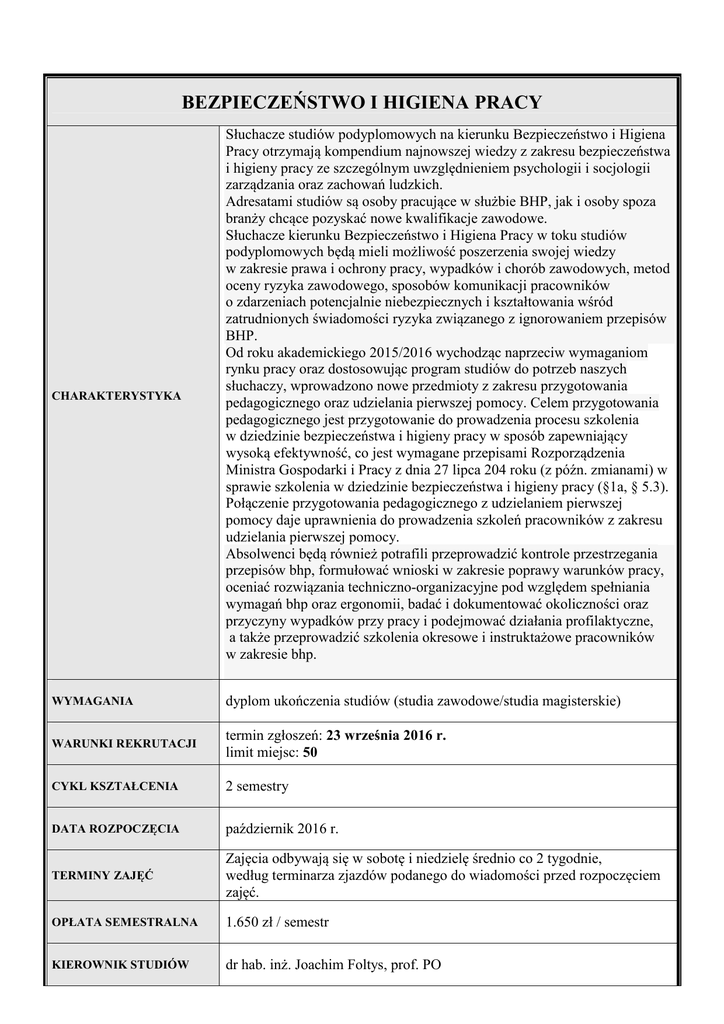 BEZPIECZEŃSTWO I HIGIENA PRACY CHARAKTERYSTYKA Słuchacze studiów podyplomowych na kierunku Bezpieczeństwo i Higiena Pracy otrzymają kompendium najnowszej wiedzy z zakresu bezpieczeństwa i higieny pracy ze szczególnym uwzględnieniem psychologii i socjologii zarządzania oraz zachowań ludzkich. Adresatami studiów są osoby pracujące w służbie BHP, jak i osoby spoza branży chcące pozyskać nowe kwalifikacje zawodowe. Słuchacze kierunku Bezpieczeństwo i Higiena Pracy w toku studiów podyplomowych będą mieli możliwość poszerzenia swojej wiedzy w zakresie prawa i ochrony pracy, wypadków i chorób zawodowych, metod oceny ryzyka zawodowego, sposobów komunikacji pracowników o zdarzeniach potencjalnie niebezpiecznych i kształtowania wśród zatrudnionych świadomości ryzyka związanego z ignorowaniem przepisów BHP. Od roku akademickiego 2015/2016 wychodząc naprzeciw wymaganiom rynku pracy oraz dostosowując program studiów do potrzeb naszych słuchaczy, wprowadzono nowe przedmioty z zakresu przygotowania pedagogicznego oraz udzielania pierwszej pomocy. Celem przygotowania pedagogicznego jest przygotowanie do prowadzenia procesu szkolenia w dziedzinie bezpieczeństwa i higieny pracy w sposób zapewniający wysoką efektywność, co jest wymagane przepisami Rozporządzenia Ministra Gospodarki i Pracy z dnia 27 lipca 204 roku (z późn. zmianami) w sprawie szkolenia w dziedzinie bezpieczeństwa i higieny pracy (§1a, § 5.3). Połączenie przygotowania pedagogicznego z udzielaniem pierwszej pomocy daje uprawnienia do prowadzenia szkoleń pracowników z zakresu udzielania pierwszej pomocy. Absolwenci będą również potrafili przeprowadzić kontrole przestrzegania przepisów bhp, formułować wnioski w zakresie poprawy warunków pracy, oceniać rozwiązania techniczno-organizacyjne pod względem spełniania wymagań bhp oraz ergonomii, badać i dokumentować okoliczności oraz przyczyny wypadków przy pracy i podejmować działania profilaktyczne, a także przeprowadzić szkolenia okresowe i instruktażowe pracowników w zakresie bhp. WYMAGANIA dyplom ukończenia studiów (studia zawodowe/studia magisterskie) WARUNKI REKRUTACJI termin zgłoszeń: 23 września 2016 r. limit miejsc: 50 CYKL KSZTAŁCENIA 2 semestry DATA ROZPOCZĘCIA październik 2016 r. TERMINY ZAJĘĆ Zajęcia odbywają się w sobotę i niedzielę średnio co 2 tygodnie, według terminarza zjazdów podanego do wiadomości przed rozpoczęciem zajęć. OPŁATA SEMESTRALNA 1.650 zł / semestr KIEROWNIK STUDIÓW dr hab. inż. Joachim Foltys, prof. PO KONTAKT DODATKOWE INFORMACJE DLA SŁUCHACZY telefon: Centrum Obsługi Studenta, tel. 77/449-85-09 e-mail: [email protected], [email protected] Komplet dokumentów: - druk podania o przyjęcie na studia (do pobrania ze strony internetowej www.po.opole.pl w zakładce „Rekrutacja” / „studia podyplomowe” ), - 2 zdjęcia legitymacyjne, - kserokopię odpisu dyplomu ukończenia studiów wyższych, - kserokopię dowodu osobistego, należy złożyć w sekretariacie Wydziału Ekonomii i Zarządzania, ul. Luboszycka 7, pok.115, lub przesłać pocztą na adres: Politechnika Opolska, Wydział Ekonomii i Zarządzania ( pok. 115), ul. Luboszycka 7, 45-036 Opole