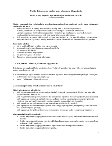 Ulotka dołączona do opakowania: informacja dla pacjenta Defur, 4 mg, kapsułki o przedłużonym uwalnianiu, twarde Tolterodini tartras Należy zapoznać się z treścią ulotki przed zastosowaniem leku, ponieważ zawiera ona informacje ważne dla pacjenta. - Należy zachować tę ulotkę, aby w razie potrzeby móc ją ponownie przeczytać. - W razie jakichkolwiek wątpliwości należy zwrócić się do lekarza lub farmaceuty. - Lek ten przepisano ściśle określonej osobie. Nie należy go przekazywać innym. Lek może zaszkodzić innej osobie, nawet jeśli objawy jej choroby są takie same. - Jeśli u pacjenta wystąpią jakiekolwiek objawy niepożądane, w tym wszelkie objawy niepożądane niewymienione w tej ulotce, należy powiedzieć o tym lekarzowi lub farmaceucie Patrz punkt 4. Spis treści ulotki: 1. Co to jest lek Defur i w jakim celu się go stosuje 2. Informacje ważne przed zastosowaniem leku Defur 3. Jak stosować lek Defur 4. Możliwe działania niepożądane 5. Jak przechowywać lek Defur 6. Zawartość opakowania i inne informacje 1. Co to jest lek Defur i w jakim celu się go stosuje Substancją czynną leku Defur jest tolterodyna. Tolterodyna należy do grupy leków zwanych lekami przeciwmuskarynowymi. Lek Defur stosuje się w leczeniu objawów zespołu pęcherza moczowego nadreaktywnego, takich jak: nietrzymanie moczu z parcia naglącego nagłe i (lub) częste oddawanie moczu. 2. Informacje ważne przed zastosowaniem leku Defur Kiedy nie stosować leku Defur: - jeśli pacjent ma uczulenie na tolterodynę lub którykolwiek z pozostałych składników tego leku (wymienione w punkcie 6) - jeśli pacjent ma zmniejszoną zdolność do opróżniania pęcherza moczowego (zatrzymanie moczu) - jeśli u pacjenta występuje niekontrolowana jaskra z wąskim kątem przesączania (zwiększone ciśnienie wewnątrz gałek ocznych z utratą widzenia, niepoddające się leczeniu) - jeśli u pacjenta stwierdzono miastenię (nadmierne osłabienie siły mięśni) - jeśli u pacjenta stwierdzono ciężką postać wrzodziejącego zapalenia jelita grubego (owrzodzenie oraz zapalenie jelita grubego). - jeśli u pacjenta stwierdzono toksyczne rozszerzenie okrężnicy (ostre rozszerzenie okrężnicy). Ostrzeżenia i środki ostrożności Jeśli u pacjenta występują trudności w oddawaniu moczu i (lub) oddawanie niewielkich ilości moczu. Jeśli u pacjenta stwierdzono chorobę układu pokarmowego powodującą zaburzenia przepływu pokarmu i (lub) trawienia. Jeśli u pacjenta występują zaburzenia czynności nerek (niewydolność nerek). Jeśli u pacjenta występuje choroba wątroby. 1 Jeśli u pacjenta stwierdzono zaburzenia neurologiczne, wpływające na ciśnienie krwi, czynność jelit i sprawność seksualną (każda neuropatia autonomicznego układu nerwowego). Jeśli u pacjenta występuje przepuklina rozworu przełykowego (przemieszczenie narządu jamy brzusznej). Jeśli u pacjenta kiedykolwiek wystąpiło spowolnienie ruchów robaczkowych jelit lub ciężkie zaparcie (zmniejszona ruchliwość odcinka żołądkowo–jelitowego). jeśli u pacjent stwierdzono zaburzenia czynności serca, takie jak: nieprawidłowy zapis EKG spowolnienie rytmu serca (bradykardia) istotne, uprzednio istniejące choroby serca, takie jak: kardiomiopatia (osłabienie mięśnia sercowego), niedokrwienie mięśnia sercowego (zmniejszony dopływ krwi do serca), zaburzenia rytmu serca (nieregularna akcja serca) i niewydolność serca Jeśli u pacjenta występuje zmniejszone stężenie potasu (hipokaliemia), wapnia (hipokalcemia) lub magnezu (hipomagnezemia) we krwi. Przed rozpoczęciem stosowania leku Defur należy poinformować lekarza lub farmaceutę, jeśli któryś z wymienionych przypadków może dotyczyć pacjenta. Inne leki i Defur Należy powiedzieć lekarzowi lub farmaceucie o wszystkich lekach przyjmowanych obecnie lub ostatnio, a także o lekach, które pacjent planuje stosować. Tolterodyna, substancja czynna leku Defur, może wchodzić w interakcje z innymi lekami. Nie zaleca się stosowania tolterodyny w skojarzeniu z: niektórymi antybiotykami (zawierające, m.in., erytromycynę, klarytromycynę) lekami stosowanymi w leczeniu zakażeń grzybiczych (zawierającymi, m.in. ketokonazol, itrakonazol) lekami stosowanymi w leczeniu zakażeń wywołanych wirusem HIV. Należy zachować ostrożność podczas równoczesnego stosowania leku Defur z poniższymi lekami: leki wpływające na przemieszczanie się treści pokarmowej (zawierające m.in. metoklopramid i cyzapryd) leki stosowane w leczeniu zaburzeń rytmu serca (zawierające np. amiodaron, sotalol, chinidynę, prokainamid) inne leki o działaniu podobnym do leku Defur (właściwości przeciwmuskarynowe) lub leki o działaniu przeciwnym do leku Defur (właściwości cholinergiczne). Spowolnienie ruchów przewodu pokarmowego spowodowane lekami przeciwmuskarynowymi może wpływać na wchłanianie innych leków. Jeśli pacjent nie jest pewny, czy powyższa informacja go dotyczy, powinien skonsultować się z lekarzem. Lek Defur z jedzeniem i piciem Defur można stosować niezależnie od posiłków. Ciąża i karmienie piersią Ciąża Leku Defur nie należy stosować w okresie ciąży. Należy natychmiast powiadomić lekarza jeśli pacjentka jest w ciąży, podejrzewa, że jest w ciąży lub planuje zajść w ciążę. Karmienie piersią Niewiadomo, czy tolterodyna, substancja czynna leku Defur, przenika do mleka ludzkiego. Nie zaleca się karmienia piersią podczas stosowania leku Defur. 2 Przed zastosowaniem jakiegokolwiek leku należy poradzić się lekarza lub farmaceuty. Prowadzenie pojazdów i obsługiwanie maszyn Lek Defur może powodować zawroty głowy, zmęczenie lub zaburzenia widzenia. W razie wystąpienia któregokolwiek z tych objawów nie należy prowadzić pojazdu lub obsługiwać maszyn. Lek Defur zawiera laktozę Jeżeli stwierdzono wcześniej u pacjenta nietolerancję niektórych cukrów, pacjent powinien skontaktować się z lekarzem pr