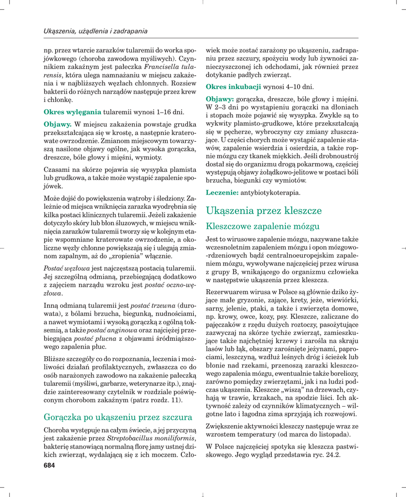 Ukàszenia, u˝àdlenia i zadrapania np. przez wtarcie zarazków tularemii do worka spojówkowego (choroba zawodowa myÊliwych). Czynnikiem zakaênym jest pa∏eczka Francisella tularensis, która ulega namna˝aniu w miejscu zaka˝enia i w najbli˝szych w´z∏ach ch∏onnych. Rozsiew bakterii do ró˝nych narzàdów nast´puje przez krew i ch∏onk´. Okres wyl´gania tularemii wynosi 1–16 dni. Objawy. W miejscu zaka˝enia powstaje grudka przekszta∏cajàca si´ w krost´, a nast´pnie kraterowate owrzodzenie. Zmianom miejscowym towarzyszà nasilone objawy ogólne, jak wysoka goràczka, dreszcze, bóle g∏owy i mi´Êni, wymioty. Czasami na skórze pojawia si´ wysypka plamista lub grudkowa, a tak˝e mo˝e wystàpiç zapalenie spojówek. Mo˝e dojÊç do powi´kszenia wàtroby i Êledziony. Zale˝nie od miejsca wnikni´cia zarazka wyodr´bnia si´ kilka postaci klinicznych tularemii. Je˝eli zaka˝enie dotyczy∏o skóry lub b∏on Êluzowych, w miejscu wnikni´cia zarazków tularemii tworzy si´ w kolejnym etapie wspomniane kraterowate owrzodzenie, a okoliczne w´z∏y ch∏onne powi´kszajà si´ i ulegajà zmianom zapalnym, a˝ do „zropienia” w∏àcznie. Postaç w´z∏owa jest najcz´stszà postacià tularemii. Jej szczególnà odmianà, przebiegajàcà dodatkowo z zaj´ciem narzàdu wzroku jest postaç oczno-w´z∏owa. Innà odmianà tularemii jest postaç trzewna (durowata), z bólami brzucha, biegunkà, nudnoÊciami, a nawet wymiotami i wysokà goràczkà z ogólnà toksemià, a tak˝e postaç anginowa oraz najci´˝ej przebiegajàca postaç p∏ucna z objawami Êródmià˝szowego zapalenia p∏uc. Bli˝sze szczegó∏y co do rozpoznania, leczenia i mo˝liwoÊci dzia∏aƒ profilaktycznych, zw∏aszcza co do osób nara˝onych zawodowo na zaka˝enie pa∏eczkà tularemii (myÊliwi, garbarze, weterynarze itp.), znajdzie zainteresowany czytelnik w rozdziale poÊwi´conym chorobom zakaênym (patrz rozdz. 11). Goràczka po ukàszeniu przez szczura Choroba wyst´puje na ca∏ym Êwiecie, a jej przyczynà jest zaka˝enie przez Streptobacillus moniliformis, bakteri´ stanowiàcà normalnà flor´ jamy ustnej dzikich zwierzàt, wydalajàcà si´ z ich moczem. Cz∏o684 wiek mo˝e zostaç zara˝ony po ukàszeniu, zadrapaniu przez szczury, spo˝yciu wody lub ˝ywnoÊci zanieczyszczonej ich odchodami, jak równie˝ przez dotykanie pad∏ych zwierzàt. Okres inkubacji wynosi 4–10 dni. Objawy: goràczka, dreszcze, bóle g∏owy i mi´Êni. W 2–3 dni po wystàpieniu goràczki na d∏oniach i stopach mo˝e pojawiç si´ wysypka. Zwykle sà to wykwity plamisto-grudkowe, które przekszta∏cajà si´ w p´cherze, wybroczyny czy zmiany z∏uszczajàce. U cz´Êci chorych mo˝e wystàpiç zapalenie stawów, zapalenie wsierdzia i osierdzia, a tak˝e ropnie mózgu czy tkanek mi´kkich. JeÊli drobnoustrój dosta∏ si´ do organizmu drogà pokarmowà, cz´Êciej wyst´pujà objawy ˝o∏àdkowo-jelitowe w postaci bóli brzucha, biegunki czy wymiotów. Leczenie: antybiotykoterapia. Ukàszenia przez kleszcze Kleszczowe zapalenie mózgu Jest to wirusowe zapalenie mózgu, nazywane tak˝e wczesnoletnim zapaleniem mózgu i opon mózgowo-rdzeniowych bàdê centralnoeuropejskim zapaleniem mózgu, wywo∏ywane najcz´Êciej przez wirusa z grupy B, wnikajàcego do organizmu cz∏owieka w nast´pstwie ukàszenia przez kleszcza. Rezerwuarem wirusa w Polsce sà g∏ównie dziko ˝yjàce ma∏e gryzonie, zajàce, krety, je˝e, wiewiórki, sarny, jelenie, ptaki, a tak˝e i zwierz´ta domowe, np. krowy, owce, kozy, psy. Kleszcze, zaliczane do paj´czaków z rz´du du˝ych roztoczy, paso˝ytujàce zazwyczaj na skórze tych˝e zwierzàt, zamieszkujàce tak˝e najch´tniej krzewy i zaroÊla na skraju lasów lub ∏àk, obszary zaroÊni´te je˝ynami, paprociami, leszczynà, wzd∏u˝ leÊnych dróg i Êcie˝ek lub b∏onie nad rzekami, przenoszà zarazki kleszczowego zapalenia mózgu, ewentualnie tak˝e boreliozy, zarówno pomi´dzy zwierz´tami, jak i na ludzi podczas ukàszenia. Kleszcze „wiszà” na drzewach, czyhajà w trawie, krzakach, na spodzie liÊci. Ich aktywnoÊç zale˝y od czynników klimatycznych – wilgotne lato i ∏agodna zima sprzyjajà ich rozwojowi. Zwi´kszenie aktywnoÊci kleszczy nast´puje wraz ze wzrostem temperatury (od marca do listopada). W Polsce najcz´Êciej spotyka si´ kleszcza pastwiskowego. Jego wyglàd przedstawia ryc. 24.2. Ukàszenia (ugryzienia) a a) ruje, pozostaje jego nosicielem na ca∏e ˝ycie (bowiem mo˝e byç przenoszony z jednego stadium rozwojowego kleszcza na drugie). Wirus ten szybko traci zakaênoÊç przez wysuszenie, pasteryzacj´, ewentualnie przez poddanie go dzia∏aniu Êrodków chemicznych lub enzymatycznych. W normalnych warunkach mo˝e jednak przetrwaç wiele miesi´cy, np. w mleku i maÊle. Przenoszony jest przez ró˝ne gatunki kleszczy, spoÊród których najbardziej rozpowszechniony jest kleszcz pastwiskowy (∏àkowy). b) b Do infekcji dochodzi w wyniku uk∏ucia cz∏owieka przez zaka˝onego kleszcza. Mo˝liwe te˝ jest zaka˝enie drogà pokarmowà przez picie surowego mleka kozy, owcy lub krowy, b´dàcej nosicielkà tego˝ wirusa, oraz drogà oddechowà przez wdychanie znajdujàcego si´ w kurzu ka∏u zaka˝onych kleszczy (np. z siana). Kleszcze najcz´Êciej wszczepiajà si´ w skór´ ràk i nóg, stamtàd przenoszà si´ niezauwa˝one w zgi´cia du˝ych stawów. Poniewa˝ ich Êlina ma w∏aÊciwoÊci znieczulajàce, ukàszenia najcz´Êciej pozostajà niezauwa˝one. Wi´kszoÊç ludzi przechodzi zaka˝enie wirusem kleszczowego zapalenia mózgu skàpo- lub bezobjawowo, a jedynym dowodem przebytego zaka˝enia jest potwierdzenie serologiczne. Jest to tzw. postaç poronna. Ryc. 24.2. Kleszcze: a – wyglàd kleszcza (Rhipicephalus sanguineus) w mikroskopie elektronowym (wg firmy Bayer); b – g∏owa kleszcza w powi´kszeniu (wg firmy Bayer). Kleszcze sà szeroko rozpowszechnione w Êwiecie. Wyst´pujà w ró˝nym nat´˝eniu w poszc