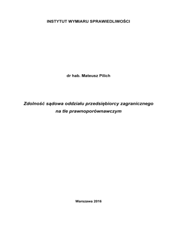 INSTYTUT WYMIARU SPRAWIEDLIWOŚCI dr hab. Mateusz Pilich Zdolność sądowa oddziału przedsiębiorcy zagranicznego na tle prawnoporównawczym Warszawa 2016 Spis treści Wykaz skrótów ............................................................................................................. i Wstęp ......................................................................................................................... 1 Rozdział 1. Oddziały przedsiębiorców zagranicznych w Polsce (zagadnienia ogólne)4 1.1. Pojęcie oddziału przedsiębiorcy ....................................................................... 4 1.2. Oddziały przedsiębiorców zagranicznych w Polsce ......................................... 8 1.3. Zakładanie i rejestracja oddziału zagranicznego przedsiębiorcy w Polsce ..... 12 1.4. Prawo właściwe dla oddziału przedsiębiorcy zagranicznego (uwagi na tle ustawy – Prawo prywatne międzynarodowe) ........................................................ 15 1.5. Status oddziałów zagranicznych przedsiębiorców w świetle niektórych ustaw szczególnych ......................................................................................................... 20 1.6. Aspekty prawnoprocesowe............................................................................. 23 1.7. Prawo Unii Europejskiej ................................................................................. 31 Rozdział 2. Analiza prawnoporównawcza................................................................. 34 2.1. Prawo niemieckie ........................................................................................... 34 2.2. Prawo austriackie ........................................................................................... 42 2.3. Prawo włoskie ................................................................................................ 47 2.4. Prawo angielskie ............................................................................................ 50 2.5. Prawo irlandzkie ............................................................................................. 52 2.6. Prawo amerykańskie ...................................................................................... 54 Rozdział 3. Zdolność sądowa oddziałów przedsiębiorców zagranicznych w polskiej praktyce sądowej ...................................................................................................... 57 3.1. Orzecznictwo sądów powszechnych .............................................................. 57 3.1.1. Stanowisko opowiadające się za odrzuceniem pozwu ze względu na nieusuwalny brak zdolności sądowej jednej ze stron .................................... 57 3.1.2. Stanowisko przychylne konwalidowaniu nieprawidłowego oznaczenia strony poprzez prawidłowe wskazanie przedsiębiorcy w miejsce jego oddziału 61 3.2. Orzecznictwo Sądu Najwyższego .................................................................. 64 3.3. Krytyka judykatury i propozycje alternatywnego rozstrzygnięcia .................... 68 Podsumowanie i wnioski........................................................................................... 80 Bibliografia ................................................................................................................ 81 Notka o autorze ........................................................................................................ 87 Wykaz skrótów Publikatory urzędowe aktów normatywnych BGBl. - niem. Bundesgesetzblatt (Federalny Dziennik Ustaw RFN/Austrii) Dz. Urz. UE -Dziennik Urzędowy Unii Europejskiej RGBl. - niem. Reichsgesetzblatt (d. Dziennik Ustaw Rzeszy Niemieckiej) Czasopisma i zbiory orzecznictwa BGHZ - Entscheidungen des Bundesgerichtshofs in Zivilsachen (Zbiór Orzeczeń BGH w Sprawach Cywilnych) ECR - European Court (Zbiór Reports Orzecznictwa Trybunału Sprawiedliwości Unii Europejskiej) HS - Handelsrechtliche Entscheidungen OSNC - Orzecznictwo Sądu Najwyższego – Izba Cywilna OSNCP - Orzecznictwo Sądu Najwyższego – Izba Cywilna i Pracy (do 1993 r.) OSNP - Orzecznictwo Sądu Najwyższego – Izba Pracy, Ubezpieczeń Społecznych i Spraw Publicznych MoP - Monitor Prawniczy NJW - niem. Neue Juristische Wochenschrift (czasopismo) NJW-RR - niem. Neue Juristische Wochenschrift-Rechtsprechungs-Report (czasopismo) NP - Nowe Prawo Pal. - Palestra PPH - Przegląd Prawa Handlowego PS Przegląd Sądowy - RPEiS - Ruch Prawniczy, Ekonomiczny i Socjologiczny SZ Sammlung Zivilsachen (austr. zbiór orzeczeń OGH w sprawach - cywilnych) Sądy i trybunały BGH - niem. Bundesgerichtshof (Trybunał Federalny) ETS - Europejski Trybunał Sprawiedliwości (aktualna nazwa oficjalna: Trybunał Sprawiedliwości Unii Europejskiej) OGH - austr. Oberster Gerichtshof (Trybunał Najwyższy) SN Sąd Najwyższy - Akty normatywne p.d.g. - ustawa z dnia 19 listopada 1999 r. – Prawo działalności gospodarczej (Dz. U. z 1999 r. Nr 101, poz. 1178 z późn. zm.) p.p.m. - ustawa z dnia 4 lutego 2011 r. – Prawo prywatne międzynarodowe (Dz. U. z 2015 r. poz. 1792) TFUE - Traktat o funkcjonowaniu Unii Europejskiej (Dz. U. z 2004 r. Nr 90, poz. 864/2 z późn. zm.) u.KRS - ustawa z dnia 20 sierpnia 1997 r. o Krajowym Rejestrze Sądowym (Dz. U. z 2016 r. poz. 687) u.ubezp. - ustawa z dnia 11 września 2015 r. o działalności ubezpieczeniowej i reasekuracyjnej (Dz. U. poz. 1844; zm. Dz. U. z 2016 r. poz. 615) u.s.d.g. - ustawa z dnia 2 lipca 2004 r. o swobodzie działalności gospodarczej (Dz. U. z 2015 r. poz. 584) Inne skróty nrb. - numer boczny orz. - orzeczenie v - ang. versus (przeciwko) vol. - ang. volume (tom/rocznik czasopisma) ii Wstęp Tematem niniejszego opracowania jest zdolność sądowa oddziałów przedsiębiorców1 zagranicznych w aspekcie prawnoporównawczym. Warto w tym miejscu przypomnieć, iż pojęcie „zdolności sądowej” należy wprawdzie do elementów prawa procesowego cywilnego, zarazem jednak dostrzegalny jest i