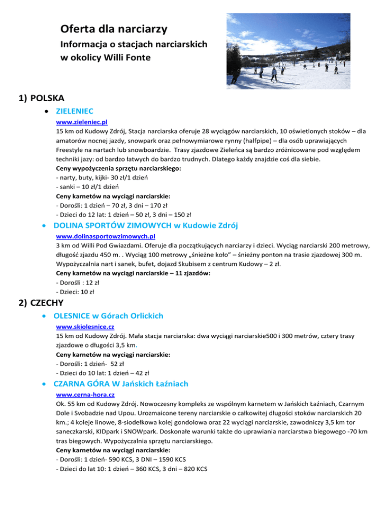 Oferta dla narciarzy Informacja o stacjach narciarskich w okolicy Willi Fonte 1) POLSKA ZIELENIEC www.zieleniec.pl 15 km od Kudowy Zdrój, Stacja narciarska oferuje 28 wyciągów narciarskich, 10 oświetlonych stoków – dla amatorów nocnej jazdy, snowpark oraz pełnowymiarowe rynny (halfpipe) – dla osób uprawiających Freestyle na nartach lub snowboardzie. Trasy zjazdowe Zieleoca są bardzo zróżnicowane pod względem techniki jazy: od bardzo łatwych do bardzo trudnych. Dlatego każdy znajdzie coś dla siebie. Ceny wypożyczenia sprzętu narciarskiego: - narty, buty, kijki- 30 zł/1 dzieo - sanki – 10 zł/1 dzieo Ceny karnetów na wyciągi narciarskie: - Dorośli: 1 dzieo – 70 zł, 3 dni – 170 zł - Dzieci do 12 lat: 1 dzieo – 50 zł, 3 dni – 150 zł DOLINA SPORTÓW ZIMOWYCH w Kudowie Zdrój www.dolinasportowzimowych.pl 3 km od Willi Pod Gwiazdami. Oferuje dla początkujących narciarzy i dzieci. Wyciąg narciarski 200 metrowy, długośd zjazdu 450 m. . Wyciąg 100 metrowy „śnieżne koło” – śnieżny ponton na trasie zjazdowej 300 m. Wypożyczalnia nart i sanek, bufet, dojazd Skubisem z centrum Kudowy – 2 zł. Ceny karnetów na wyciągi narciarskie – 11 zjazdów: - Dorośli : 12 zł - Dzieci: 10 zł 2) CZECHY OLESNICE w Górach Orlickich www.skiolesnice.cz 15 km od Kudowy Zdrój. Mała stacja narciarska: dwa wyciągi narciarskie500 i 300 metrów, cztery trasy zjazdowe o długości 3,5 km. Ceny karnetów na wyciągi narciarskie: - Dorośli: 1 dzieo- 52 zł - Dzieci do 10 lat: 1 dzieo – 42 zł CZARNA GÓRA W Jańskich Łaźniach www.cerna-hora.cz Ok. 55 km od Kudowy Zdrój. Nowoczesny kompleks ze wspólnym karnetem w Jaoskich Łaźniach, Czarnym Dole i Svobadzie nad Upou. Urozmaicone tereny narciarskie o całkowitej długości stoków narciarskich 20 km.; 4 koleje linowe, 8-siodełkowa kolej gondolowa oraz 22 wyciągi narciarskie, zawodniczy 3,5 km tor saneczkarski, KIDpark i SNOWpark. Doskonałe warunki także do uprawiania narciarstwa biegowego -70 km tras biegowych. Wypożyczalnia sprzętu narciarskiego. Ceny karnetów na wyciągi narciarskie: - Dorośli: 1 dzieo- 590 KCS, 3 DNI – 1590 KCS - Dzieci do lat 10: 1 dzieo – 360 KCS, 3 dni – 820 KCS