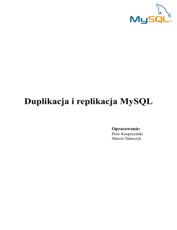 Duplikacja i replikacja MySQL Opracowanie: Piotr Knopczyński Marcin Talarczyk Replikacja Replikacja danych to proces powielania informacji między różnymi serwerami baz danych. Replikacja pozwala nam na: • Skalowalność – możliwe jest rozłożenie obciążenia pomiędzy wieloma serwerami. Operacje zapisu i aktualizacji rekordów odbywają się na jednym serwerze, a pobieranie i przeszukiwanie danych z drugiego. • Bezpieczeństwo – dzięki replikacji tworzymy klona istniejącej bazy produkcyjnej. Nie uchroni nas to przed operacjami typu DROP TABLE, ale może pomóc w przypadku awarii sprzętowej głównego serwera. • Analiza – skomplikowane operacje analityczne, różnego rodzaju przeliczenia i analizy statystyczne mogą być wykonywane na osobnym serwerze bez konieczności obciążania głównej bazy. • Separacja – możemy udostępnić klon bazy produkcyjnej dla developerów lub testerów, aby wykonali swoje prace na kopii bazy. Mechanizmy replikacji MySQL Replikacja danych MySQL opiera się o bardzo prostą zasadę. Serwer główny (master), prowadzi swego rodzaju dziennik, w którym zapisuje każdą czynność jaką wykonał. Wykorzystuje do tego bin-logi. Są to pliki binarne zawierające instrukcje jakie wykonał master. Serwer zapasowy (slave) odczytuje te dane i kolejno wykonuje zapytania zapełniając bazę kolejnymi rekordami. Efektem tej pracy są dwie identyczne bazy danych. Po skonfigurowaniu mechanizmu replikacji na serwerze master pojawia się dodatkowy wątek, który odpowiada za wysyłanie bin-logów do serwerów slave. Z kolei serwer zapasowy tworzy dwa wątki: • I/O Thread – odpowiada za odbieranie dziennika od serwera głównego i zapisuje go w plikach tymczasowych relay-log. • SQL Thread – zajmuje się parsowaniem tych plików i wykonywaniem zapytań do bazy. Całą sytuację przedstawia poniższy schemat: Rodzaje replikacji System bazodanowy MySQL umożliwia trzy różne metody replikacji, co przekłada się na format danych zapisywanych do bin-logów. Za wybór metody relikacji odpowiada zmienna binlog_format, która może przyjąć wartość: ROW,STATEMENT,MIXED. Metody replikacji: • SBR (statement-based replication) - w tym trybie, serwer do pliku zapisuje zapytania jakie wykonał. • RBR (row-based replication) - do bin-logów zapisywane są wyniki działań zapytań na serwerze master. Zapisywana jest informacja jaki rekord został w jaki sposób zmieniony. • MFL (mixed-format logging) - jest to połączenie dwóch powyższych typów replikacji. Technika replikacji SBR jest bardzo szybka i wydajna, ponieważ w jej przypadku serwer główny zapisuje do pliku zapytanie jakie wykonał, następnie serwer zapasowy je odczytuje i wykonuje. Niestety do pliku logów zapisywane są tylko zapytania SQL, co przysporzy nam problemów, gdy nasze zapytania będą bardziej złożone. Problem ten rozwiązała metoda RBR, która do bin-logów zapisuje wyłącznie zmiany jakie zaszły po wykonaniu polecenia - logowane są informacje na temat sposobu modyfikacji konkretnych rekordów. Niestety metoda ta jest znacznie wolniejsza od poprzedniej oraz zwiększa ilość wysyłanych danych pomiędzy replikującymi się serwerami. Z pomocą przyszła nam metoda MFL, w której w większości przypadków, logowane są zapytania SQL tak jak w przypadku SBR, natomiast dla zapytań, których wynik nie jest przewidywalny, włączana jest replikacja RBR. Konfiguracja Do konfiguracji użyjemy dwóch maszyn ze świeżo zainstalowanym pakietem mysql i mysql-server. Załóżmy, że nasze serwery mają następujące IP: • master => 1.1.1.1 • slave => 1.1.1.2 W pliku /etc/mysql/my.cnf w sekcji [mysqld] dodajemy następujące linie: server-id = 1 log-bin = /var/log/mysql/mysql-bin.log sync_binlog = 1 oraz na maszynie slave: server-id = 2 log-bin = /var/log/mysql/mysql-bin.log sync_binlog = 1 Zmienna server-id musi mieć unikalną wartość na każdym z serwerów oraz być różna od 0. Chcemy też by MySQL automatycznie usuwał pliki mysql-bin.log starsze niż 10 dni, a maksymalna wielkość pojedynczego pliku to 500MB. Warto też się upewnić czy wartość opcji innodb_flush_log_at_trx_commit jest równa 1. expire_logs_days = 10 max_binlog_size = 500M innodb_flush_log_at_trx_commit = 1 Zmieniamy również wartość zmiennej bind-addres, żeby serwer mysql nasłuchiwał na wszystkich adresach IP: bind-address = 0.0.0.0 Możemy teraz zrestartować proces mysqld: [root@master ~]# /etc/init.d/mysqld restart [root@slave ~]# /etc/init.d/mysqld restart Na serwerze master dodamy nowego użytkownika z prawami do replikacji: mysql> CREATE USER 'slaveuser'@'%' IDENTIFIED BY 'haslo'; mysql> GRANT REPLICATION SLAVE ON *.* TO 'slaveuser'@'%'; mysql> flush privileges; Możemy przetestować połączenie z serwera slave: [root@slave ~]# mysql -u slaveuser -h 1.1.1.1 -p Enter password: ***** Welcome to the MySQL monitor. Commands end with ; or \g. Your MySQL connection id is 979 Server version: 5.5.25-log MySQL Community Server ... Pobranie współrzędnych pliku replikacji Wraz z włączeniem replikacji mysql tworzy pliki dziennika w katalogu /var/log/mysql (dokładnie tak jak zdefiniowaliśmy w pliku /etc/mysql/my.cnf). Do synchronizacji serwera slave z master, musimy znać aktualną pozycję tego pliku. Musimy też zablokować możliwość dodawania/edycji/usuwania danych z naszej bazy na pewien czas, ponieważ każda z tych operacji powoduje zmianę współrzędnych. Na serwerze master wpisujemy: mysql> FLUSH TABLES WITH READ LOCK; mysql> show master status\G; *************************** 1. row *************************** File: mysql-bin.000001 Position: 107 Binlog_Do_DB: Binlog_Ignore_DB: Jak widzimy powyżej, aktualny plik dziennika to mysql-bin.000001, a pozycja ma wartość = 107. Eksport i import baz danych Kolejnym krokiem jest eksport bazy z serwera master na slave. [root@master ~]# mysqldump --add-drop-table --master-data --quick -u superroot -p --all-databases > /tmp/