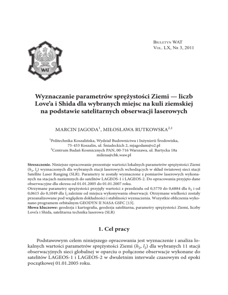 Biuletyn WAT Vol. LX, Nr 3, 2011 Wyznaczanie parametrów sprężystości Ziemi — liczb Love’a i Shida dla wybranych miejsc na kuli ziemskiej na podstawie satelitarnych obserwacji laserowych Marcin Jagoda1, Miłosława Rutkowska2,1 1 Politechnika Koszalińska, Wydział Budownictwa i Inżynierii Środowiska, 75-453 Koszalin, ul. Śniadeckich 2, [email protected] 2 Centrum Badań Kosmicznych PAN, 00-716 Warszawa, ul. Bartycka 18a [email protected] Streszczenie. Niniejsze opracowanie prezentuje wartości lokalnych parametrów sprężystości Ziemi (h2, l2) wyznaczonych dla wybranych stacji laserowych wchodzących w skład światowej sieci stacji Satellite Laser Ranging (SLR). Parametry te zostały wyznaczone z pomiarów laserowych wykonanych na stacjach naziemnych do satelitów LAGEOS-1 i LAGEOS-2. Do opracowania przyjęto dane obserwacyjne dla okresu od 01.01.2005 do 01.01.2007 roku. Otrzymane parametry sprężystości przyjęły wartości z przedziału od 0,5770 do 0,6884 dla h2 i od 0,0615 do 0,1049 dla l2 zależnie od miejsca wykonywania obserwacji. Otrzymane wielkości zostały przeanalizowane pod względem dokładności i stabilności wyznaczenia. Wszystkie obliczenia wykonano programem orbitalnym GEODYN II NASA GSFC [13]. Słowa kluczowe: geodezja i kartografia, geodezja satelitarna, parametry sprężystości Ziemi, liczby Love’a i Shida, satelitarna technika laserowa (SLR) 1. Cel pracy Podstawowym celem niniejszego opracowania jest wyznaczenie i analiza lokalnych wartości parametrów sprężystości Ziemi (h2, l2) dla wybranych 11 stacji obserwacyjnych sieci globalnej w oparciu o połączone obserwacje wykonane do satelitów LAGEOS-1 i LAGEOS-2 w dwuletnim interwale czasowym od epoki początkowej 01.01.2005 roku. 80 M. Jagoda, M. Rutkowska Celem pośrednim jest oszacowanie minimalnego interwału czasu pozwalającego uzyskać stabilność prowadzonych wyznaczeń. Ponadto zostanie przeprowadzona ocena zgodności wyznaczonych lokalnych parametrów sprężystości z ich wartościami globalnymi. 2. Wstęp Ziemia podlega oddziaływaniu siły przyciągania Słońca, Księżyca oraz planet Układu Słonecznego, a także sile odśrodkowej wywołanej jej ruchem po orbicie. Grawitacyjne oddziaływanie Księżyca jest największe ze względu na jego małą odległość od Ziemi, oddziaływanie Słońca jest około dwukrotnie mniejsze, natomiast grawitacyjne oddziaływanie pozostałych planet ma wartość o kilka rzędów wielkości mniejszą i jest w efekcie zaniedbywalne. Vaniček w swojej pracy [23] podaje następujące zestawienie (tab. 1) udziału wartości potencjału sił pływowych Słońca oraz najbliższych i największych planet Układu Słonecznego w stosunku do potencjału pływowego wywołanego przyciąganiem Księżyca przyjętego jako 1,0. Tabela 1 Wielkość potencjału sił pływowych Słońca i wybranych planet w stosunku do potencjału pływowego wywołanego przyciąganiem Księżyca (źródło: [23]) Ciało niebieskie Potencjał pływowy Księżyc 1,0 Słońce 0,4618 Wenus 0,000054 Jowisz 0,0000059 Mars 0,0000010 Zgodnie z rysunkiem 1 oznaczone kolorem czerwonym siły przyciągania Księżyca są dla poszczególnych punktów powierzchni Ziemi różne co do wartości i co do kierunku. Natomiast siła odśrodkowa oznaczona kolorem czarnym jest stała zarówno co do wartości, jak i kierunku w każdym punkcie Ziemi [2]. Siły te równoważą się w środku mas Ziemi, natomiast pływy są wynikiem ich niezrównoważenia na powierzchni Ziemi i wywołują zmienne w czasie przemieszczenia mas ziemskich i oceanicznych, których wielkość jest ściśle związana z regionalną budową Ziemi. Zmiany rozkładu mas perturbują ruch satelity na orbicie oraz powodują zmiany położenia stacji obserwacyjnych. Przedstawione powyżej zjawisko występuje również w przypadku układu mas: Ziemia–Słońce, Ziemia–planety Układu Słonecznego itd. Wyznaczanie parametrów sprężystości ziemi — liczb Love’a i Shida... 81 Rys. 1. Zasada powstawania pływów księżycowo-słonecznych (źródło: [2]) Zmiany rozkładu mas Ziemi na skutek pływów wyrażone są przez dynamiczne ruchy stacji obserwacyjnych o maksymalnej amplitudzie ±40 cm, które zgodnie z teorią Diamante, Williamson [4] opisane są formułą: gdzie: 4 2 h h 3 GM j r 3l Rˆ j rˆ Rˆ j + 3 2 − l2 Rˆ j rˆ − 2 rˆ , ∆r = ∑ 3 2 2 j=2 2 GM Earth R j ( ) ( ) (1) GMj — parametr grawitacyjny Księżyca (j = 2) lub Słońca (j = 3); GMEarth — parametr grawitacyjny Ziemi; Rˆ j — geocentryczny wersor położenia ciała zaburzającego — Księżyca lub Słońca; , , r — pozycja stacji — długość i szerokość geocentryczna oraz odległość stacji od środka masy Ziemi; h2 — liczba Love’a drugiego stopnia; l2 — liczba Shida drugiego stopnia. W równaniu (1) występują parametry h2 oraz l2, które określane są mianem liczb Love’a i Shida. Pierwszy z nich (h2) odnosi się do radialnego przemieszczenia pływowego stacji, drugi (l2) dotyczy przemieszczenia poprzecznego, jego wartość jest mniejsza od h2 o około jeden rząd wielkości. Parametry sprężystości są miernikiem elastycznej reakcji Ziemi na naprężenia pływowe. Jeżeli przyjmiemy, że Ziemia jest ciałem całkowicie sztywnym, wówczas nie zachodzi elastyczna deformacja i liczby h, l są równe 0. Jeżeli założymy drugi skrajny przypadek, że Ziemia nie jest elastyczna, lecz jest ciałem całkowicie płynnym, wówczas liczby Love’a i Shida przyjmują wartość równą 1. Czyli dla „Ziemi sztywnej” h, l = 0, dla „Ziemi płynnej” h, l = 1, zaś dla „Ziemi sprężystej” przyjmują wartości pośrednie: 0 < h, l < 1 [15]. Zgodnie z Conventions 2003 [12] globalne wartości parametrów sprężystości Ziemi dla pływów drugiego stopnia wynoszą: h2 = 0,6078, l2 = 0,0847. 82 M. Jagoda, M. Rutkowska Oczywiście tak jak dla pływów drugiego stopnia (równanie (1)) istnieją również liczby Love’a i Shida dla harmonik s