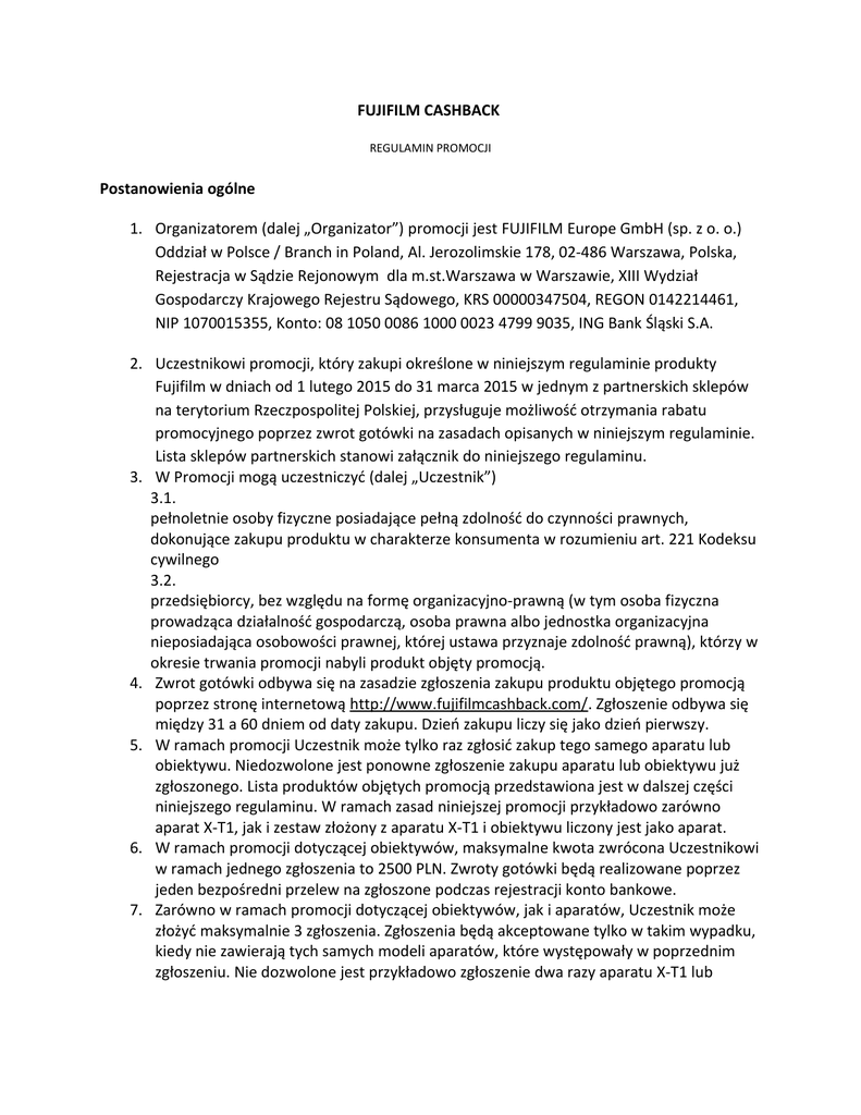 FUJIFILM CASHBACK REGULAMIN PROMOCJI Postanowienia ogólne 1. Organizatorem (dalej „Organizator”) promocji jest FUJIFILM Europe GmbH (sp. z o. o.) Oddział w Polsce / Branch in Poland, Al. Jerozolimskie 178, 02-486 Warszawa, Polska, Rejestracja w Sądzie Rejonowym dla m.st.Warszawa w Warszawie, XIII Wydział Gospodarczy Krajowego Rejestru Sądowego, KRS 00000347504, REGON 0142214461, NIP 1070015355, Konto: 08 1050 0086 1000 0023 4799 9035, ING Bank Śląski S.A. 2. Uczestnikowi promocji, który zakupi określone w niniejszym regulaminie produkty Fujifilm w dniach od 1 lutego 2015 do 31 marca 2015 w jednym z partnerskich sklepów na terytorium Rzeczpospolitej Polskiej, przysługuje możliwość otrzymania rabatu promocyjnego poprzez zwrot gotówki na zasadach opisanych w niniejszym regulaminie. Lista sklepów partnerskich stanowi załącznik do niniejszego regulaminu. 3. W Promocji mogą uczestniczyć (dalej „Uczestnik”) 3.1. pełnoletnie osoby fizyczne posiadające pełną zdolność do czynności prawnych, dokonujące zakupu produktu w charakterze konsumenta w rozumieniu art. 221 Kodeksu cywilnego 3.2. przedsiębiorcy, bez względu na formę organizacyjno-prawną (w tym osoba fizyczna prowadząca działalność gospodarczą, osoba prawna albo jednostka organizacyjna nieposiadająca osobowości prawnej, której ustawa przyznaje zdolność prawną), którzy w okresie trwania promocji nabyli produkt objęty promocją. 4. Zwrot gotówki odbywa się na zasadzie zgłoszenia zakupu produktu objętego promocją poprzez stronę internetową http://www.fujifilmcashback.com/. Zgłoszenie odbywa się między 31 a 60 dniem od daty zakupu. Dzień zakupu liczy się jako dzień pierwszy. 5. W ramach promocji Uczestnik może tylko raz zgłosić zakup tego samego aparatu lub obiektywu. Niedozwolone jest ponowne zgłoszenie zakupu aparatu lub obiektywu już zgłoszonego. Lista produktów objętych promocją przedstawiona jest w dalszej części niniejszego regulaminu. W ramach zasad niniejszej promocji przykładowo zarówno aparat X-T1, jak i zestaw złożony z aparatu X-T1 i obiektywu liczony jest jako aparat. 6. W ramach promocji dotyczącej obiektywów, maksymalne kwota zwrócona Uczestnikowi w ramach jednego zgłoszenia to 2500 PLN. Zwroty gotówki będą realizowane poprzez jeden bezpośredni przelew na zgłoszone podczas rejestracji konto bankowe. 7. Zarówno w ramach promocji dotyczącej obiektywów, jak i aparatów, Uczestnik może złożyć maksymalnie 3 zgłoszenia. Zgłoszenia będą akceptowane tylko w takim wypadku, kiedy nie zawierają tych samych modeli aparatów, które występowały w poprzednim zgłoszeniu. Nie dozwolone jest przykładowo zgłoszenie dwa razy aparatu X-T1 lub aparatu X-T1 i zestawu złożonego z aparatu X-T1 z obiektywem. Automatycznie dyskwalifikowane będą zgłoszenia dotyczące tych produktów uprzednio zgłaszanych. Zgłaszanie zakupu 8. Zgłoszenie zakupu odbywa się poprzez wypełnienie formularzu on-line. W formularzu należy wypełnić dane personalne, szczegóły dotyczące zakupionego produktu i objętego promocją. Należy także załączyć dowód zakupu. 9. Po zgłoszeniu zakupu Uczestnik automatycznie otrzyma e-mail potwierdzający zgłoszenie. 10. Organizator poinformuje mailowo Uczestnika o błędnie wypełnionym formularzu. Uczestnik otrzyma możliwość poprawienia błędnie wypełnionego formularza w ciągu 7 dni od dnia otrzymania e-maila. 11. Wielokrotne, nieuczciwe, niekompletne zgłoszenia będą dyskwalifikowane przez organizatora. Decyzja organizatora w tej sprawie jest ostateczna. 12. Prawo do otrzymania zwrotu gotówki w ramach promocji opisanej w niniejszym regulaminie jest unieważnione w momencie zwrotu produktu do sklepu w celu otrzymania zwrotu uiszczonej za produkt kwoty lub wymiany produktu na inny. Zwrot gotówki 13. Proces zwrotu gotówki w ramach promocji jest ukończony, jeśli w ciągu 21 dni od dnia zgłoszenia zakupu produktu objętego promocją Uczestnik otrzyma zwrot gotówki na konto. Nie ma innej możliwości zakończenia procesu zwrotu gotówki w ramach promocji. Kontakt 14. Adres mailowy do korespondencji to [email protected]. W korespondencji mailowej należy podać numer pesel. Alternatywnie możliwy jest kontakt z Biurem Obsługi Klienta: [email protected]. Rabat promocyjny 15. W ramach promocji klient otrzyma rabat w wysokości 430 zł za wszystkie aparaty lub zestawy z wyjątkiem aparatu X30, 215 zł za aparat X30 oraz 430 zł za obiektyw, przy czym w przypadku zgłoszenia dwóch obiektywów Uczestnik otrzyma 1300 zł zwrotu. Przykładowo, jeśli Uczestnik zgłosi zakup dowolnego aparatu z listy aparatów objętych promocją poza modelem X30 i trzech obiektywów, będzie mu przysługiwał rabat w wysokości 2160zł. 16. Promocją objęte są następujące aparaty i obiektywy Fujifilm: X-T1 + 18-55mm KIT X-T1 + 18-135mm KIT X-E2 + 18-55mm KIT X-E2 body X-T1 Graphite Silver body X30 XF14mmF2.8R XF23mmF1.4R XF35mmF1.4R XF56mmF1.2R XF60mmF2.4 R Macro XF10-24mmF4 R OIS XF18-55mmF2.8-4 R LM OIS XF18-135mmF3.5-5.6 R WR XF55-200mmF3.5-4.8 R OIS Reklamacje i postanowienia końcowe 17. Uczestnik może złożyć reklamację związaną z promocją w terminie do 15 kwietnia 2015 (decyduje data stempla pocztowego). Reklamacja powinna być przesłana na piśmie na adres Organizatora z dopiskiem „Cashback Fujifilm”. W reklamacji Uczestnik powinien wskazać swoje imię i nazwisko oraz adres do korespondencji, a także żądanie i dokładny opis okoliczności stanowiących podstawę reklamacji. Złożone reklamacje rozpatrywane będą w terminie 14 dni od daty ich otrzymania. Zainteresowani zostaną powiadomieni o sposobie rozpatrzenia reklamacji na piśmie, niezwłocznie po rozpatrzeniu reklamacji. 18. Zgłoszenie zakupu produktu w ramach promocji tradycyjną drogą pocztową nie będzie rozpatrywane. 19. Administratorem danych osobowych Uczestników jest Organizator. Dane przetwarzane są w celu organizacji promocji. 20. P