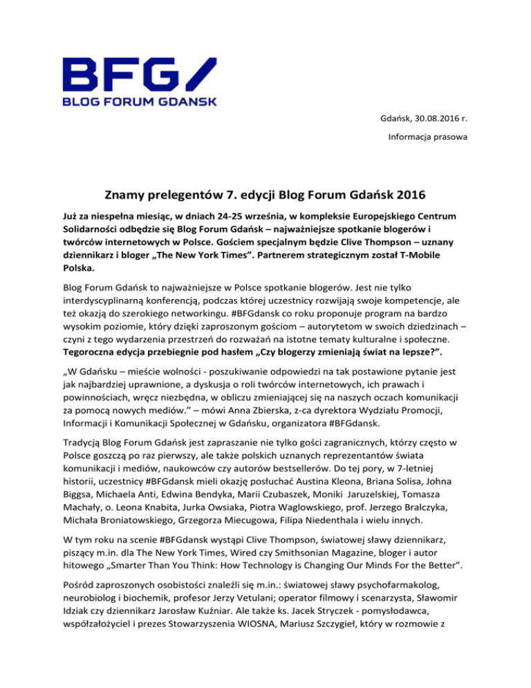 Gdańsk, 30.08.2016 r. Informacja prasowa Znamy prelegentów 7. edycji Blog Forum Gdańsk 2016 Już za niespełna miesiąc, w dniach 24-25 września, w kompleksie Europejskiego Centrum Solidarności odbędzie się Blog Forum Gdańsk – najważniejsze spotkanie blogerów i twórców internetowych w Polsce. Gościem specjalnym będzie Clive Thompson – uznany dziennikarz i bloger „The New York Times”. Partnerem strategicznym został T-Mobile Polska. Blog Forum Gdańsk to najważniejsze w Polsce spotkanie blogerów. Jest nie tylko interdyscyplinarną konferencją, podczas której uczestnicy rozwijają swoje kompetencje, ale też okazją do szerokiego networkingu. #BFGdansk co roku proponuje program na bardzo wysokim poziomie, który dzięki zaproszonym gościom – autorytetom w swoich dziedzinach – czyni z tego wydarzenia przestrzeń do rozważań na istotne tematy kulturalne i społeczne. Tegoroczna edycja przebiegnie pod hasłem „Czy blogerzy zmieniają świat na lepsze?”. „W Gdańsku – mieście wolności - poszukiwanie odpowiedzi na tak postawione pytanie jest jak najbardziej uprawnione, a dyskusja o roli twórców internetowych, ich prawach i powinnościach, wręcz niezbędna, w obliczu zmieniającej się na naszych oczach komunikacji za pomocą nowych mediów.” – mówi Anna Zbierska, z-ca dyrektora Wydziału Promocji, Informacji i Komunikacji Społecznej w Gdańsku, organizatora #BFGdansk. Tradycją Blog Forum Gdańsk jest zapraszanie nie tylko gości zagranicznych, którzy często w Polsce goszczą po raz pierwszy, ale także polskich uznanych reprezentantów świata komunikacji i mediów, naukowców czy autorów bestsellerów. Do tej pory, w 7-letniej historii, uczestnicy #BFGdansk mieli okazję posłuchać Austina Kleona, Briana Solisa, Johna Biggsa, Michaela Anti, Edwina Bendyka, Marii Czubaszek, Moniki Jaruzelskiej, Tomasza Machały, o. Leona Knabita, Jurka Owsiaka, Piotra Waglowskiego, prof. Jerzego Bralczyka, Michała Broniatowskiego, Grzegorza Miecugowa, Filipa Niedenthala i wielu innych. W tym roku na scenie #BFGdansk wystąpi Clive Thompson, światowej sławy dziennikarz, piszący m.in. dla The New York Times, Wired czy Smithsonian Magazine, bloger i autor hitowego „Smarter Than You Think: How Technology is Changing Our Minds For the Better”. Pośród zaproszonych osobistości znaleźli się m.in.: światowej sławy psychofarmakolog, neurobiolog i biochemik, profesor Jerzy Vetulani; operator filmowy i scenarzysta, Sławomir Idziak czy dziennikarz Jarosław Kuźniar. Ale także ks. Jacek Stryczek - pomysłodawca, współzałożyciel i prezes Stowarzyszenia WIOSNA, Mariusz Szczygieł, który w rozmowie z Konradem Kruczkowskim opowie o warsztacie pracy reportażysty, czy Krzysztof Gonciarz producent wideo, prowadzący kanały na YouTube o łącznej liczbie ponad miliona subskrybentów. Partnerem strategicznym tegorocznej edycji został T-Mobile Polska. „ Widzimy wszyscy jak sieci mobilne i upowszechnienie Internetu korzystnie wpływają na komunikację międzyludzką, w tym na rozwój blogosfery. Wydaje się więc, że moment na nawiązanie współpracy mamy idealny – 25-lecie Internetu w Polsce i 20-lecie działalności TMobile – pierwszego operatora komórkowego w Polsce.” - wyjaśnia Małgorzata RybakDowżyk, Dyrektor Komunikacji Korporacyjnej T-Mobile Polska – „Obecność na #BFGdansk to nie tylko forma realizacji naszej strategii prowadzenia dialogu i relacji ze społecznością cyfrowych entuzjastów. Dostrzegamy misję, jaka przyświeca Blog Forum Gdańsk – rozwijania przyszłych liderów opinii w cyfrowej komunikacji i cieszymy się że będziemy mogli mieć w tym swój udział.” – dodaje. W ramach współpracy z T-Mobile Polska powstanie m.in. specjalny raport o polskiej blogosferze sporządzony przez Natalię Hatalską – eksperta komunikacji i badaczkę trendów, oraz zorganizowana zostanie debata dotycząca przyszłości komunikacji cyfrowej. T-Mobile Polska zapewni także transmisję na żywo z konferencji. Wszystkie informacje na temat tegorocznej edycji Blog Forum Gdańsk www.blogforumgdansk.pl. Pełna lista prelegentów http://blogforumgdansk.pl/images/bfg_prelegenci.gif Bieżąca komunikacja Blog Forum Gdańsk: https://www.facebook.com/BlogForumGdansk https://twitter.com/BlogForumGdansk https://twitter.com/TMobilePolska Kontakt dla mediów: BFGdansk: [email protected]