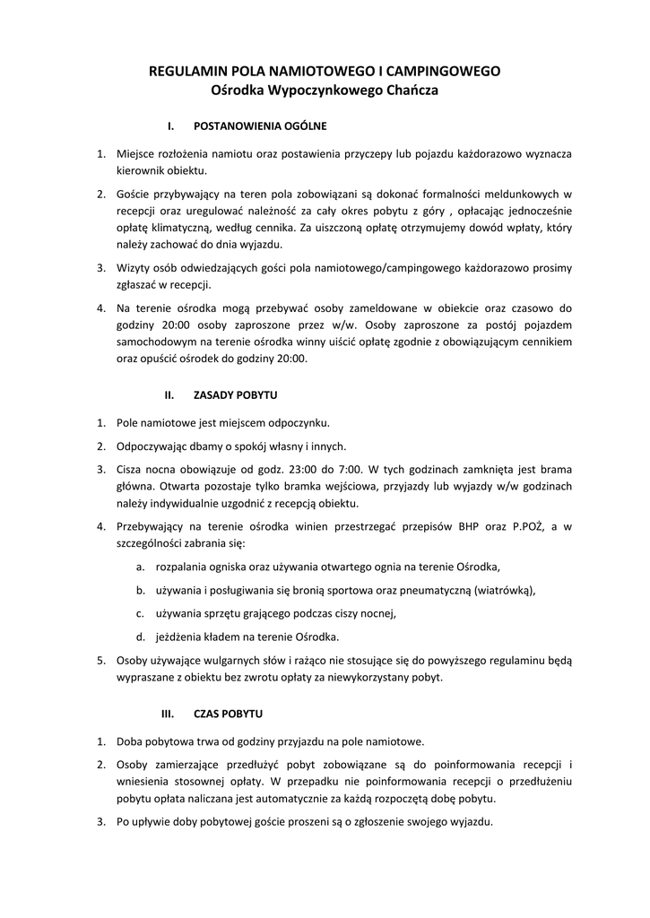 REGULAMIN POLA NAMIOTOWEGO I CAMPINGOWEGO Ośrodka Wypoczynkowego Chańcza I. POSTANOWIENIA OGÓLNE 1. Miejsce rozłożenia namiotu oraz postawienia przyczepy lub pojazdu każdorazowo wyznacza kierownik obiektu. 2. Goście przybywający na teren pola zobowiązani są dokonać formalności meldunkowych w recepcji oraz uregulować należność za cały okres pobytu z góry , opłacając jednocześnie opłatę klimatyczną, według cennika. Za uiszczoną opłatę otrzymujemy dowód wpłaty, który należy zachować do dnia wyjazdu. 3. Wizyty osób odwiedzających gości pola namiotowego/campingowego każdorazowo prosimy zgłaszać w recepcji. 4. Na terenie ośrodka mogą przebywać osoby zameldowane w obiekcie oraz czasowo do godziny 20:00 osoby zaproszone przez w/w. Osoby zaproszone za postój pojazdem samochodowym na terenie ośrodka winny uiścić opłatę zgodnie z obowiązującym cennikiem oraz opuścić ośrodek do godziny 20:00. II. ZASADY POBYTU 1. Pole namiotowe jest miejscem odpoczynku. 2. Odpoczywając dbamy o spokój własny i innych. 3. Cisza nocna obowiązuje od godz. 23:00 do 7:00. W tych godzinach zamknięta jest brama główna. Otwarta pozostaje tylko bramka wejściowa, przyjazdy lub wyjazdy w/w godzinach należy indywidualnie uzgodnić z recepcją obiektu. 4. Przebywający na terenie ośrodka winien przestrzegać przepisów BHP oraz P.POŻ, a w szczególności zabrania się: a. rozpalania ogniska oraz używania otwartego ognia na terenie Ośrodka, b. używania i posługiwania się bronią sportowa oraz pneumatyczną (wiatrówką), c. używania sprzętu grającego podczas ciszy nocnej, d. jeżdżenia kładem na terenie Ośrodka. 5. Osoby używające wulgarnych słów i rażąco nie stosujące się do powyższego regulaminu będą wypraszane z obiektu bez zwrotu opłaty za niewykorzystany pobyt. III. CZAS POBYTU 1. Doba pobytowa trwa od godziny przyjazdu na pole namiotowe. 2. Osoby zamierzające przedłużyć pobyt zobowiązane są do poinformowania recepcji i wniesienia stosownej opłaty. W przepadku nie poinformowania recepcji o przedłużeniu pobytu opłata naliczana jest automatycznie za każdą rozpoczętą dobę pobytu. 3. Po upływie doby pobytowej goście proszeni są o zgłoszenie swojego wyjazdu. IV. PRZEPISY PORZĄDKOWE 1. Każdy przebywający winien dbać o porządek i ład wokół swojego miejsca wypoczynku. Śmieci i odpady składować w miejscach do tego wyznaczonych. 2. Szanujemy otaczającą nas przyrodę. Nie niszczymy drzew i krzewów. 3. Mycie naczyń i innych przedmiotów przez użytkowników przyczep campingowych i pola namiotowego odbywać się może tylko i wyłącznie w wyznaczonym miejscu znajdującym się w ogólnodostępnym sanitariacie ośrodka. 4. Dzieci przebywające na terenie ośrodka winny obowiązkowo znajdować się pod opieką i nadzorem rodziców lub innych osób dorosłych. V. ZASADY PARKOWANIA POJAZDÓW 1. Osoby wjeżdżające pojazdem silnikowym na teren ośrodka mają obowiązek uiszczenia opłaty parkingowej zgodnej z aktualnie obwiązującym cennikiem opłat. 2. Parkowanie pojazdów odbywać się może tylko i wyłącznie w miejscach do tego wyznaczonych . 3. Zabrania się mycia pojazdów samochodowych na terenie ośrodka. VI. ZASADY POBYTU ZWIERZĄT 1. Za zwierzę przebywające na terenie pola namiotowego odpowiada jego właściciel. 2. Właściciel ma obowiązek uiszczenia opłaty za zwierzę. 3. Psy na terenie ośrodka mogą przebywać tylko i wyłącznie na uwięzi lub w kagańcach. 4. Właściciele zwierząt przebywających na terenie pola są zobowiązani do zapewnienia bezpieczeństwa i czystości oraz posiadania aktualnego świadectwa szczepienia psa przeciwko wściekliźnie. VII. POSTANOWIENIA KOŃCOWE 1. W przypadku skrócenia pobytu recepcja nie zwraca opłaty za niewykorzystane dni wypoczynku. 2. Ośrodek nie ponosi odpowiedzialności finansowej za przedmioty wartościowe (pieniądze, biżuteria, sprzęt, itp.) pozostawione i należące do użytkowników. 3. Wniesienie opłaty za pobyt jest równoznaczne z akceptacją niniejszego regulaminu. 4. Wszystkie inne kwestie nie ujęte w niniejszym regulaminie należy każdorazowo uzgadniać z kierownikiem. 5. Skargi, wnioski, i życzenia można zgłaszać w recepcji obiektu. 6. W sprawach nie uregulowanych w niniejszym regulaminie mają zastosowanie odpowiednie przepisy Kodeksu Cywilnego. ŻYCZYMY MIŁEGO WYPOCZYNKU