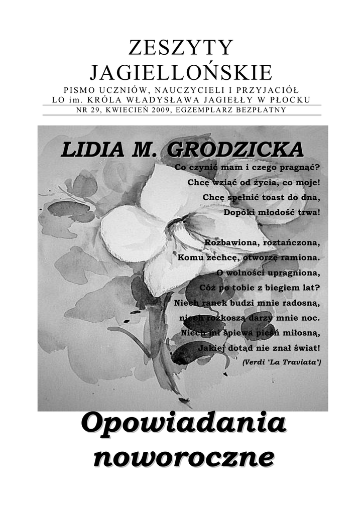 ZESZYTY JAGIELLOŃSKIE PISM O UCZNIÓW, NAUC ZYCIELI I PR ZYJ AC IÓŁ LO im. KR Ó LA W ŁAD YSŁAW A JAG IEŁŁY W PŁO C KU N R 2 9 , K WI E C I E Ń 2 0 0 9 , E G Z E M P L A R Z B E Z P Ł AT N Y LIDIA M. GRODZICKA Co czynić mam i czego pragnąć? Chcę wziąć od życia, co moje! Chcę spełnić toast do dna, Dopóki młodość trwa! Rozbawiona, roztańczona, Komu zechcę, otworzę ramiona. O wolności upragniona, Cóż po tobie z biegiem lat? Niech ranek budzi mnie radosną, niech rozkoszą darzy mnie noc. Niech mi śpiewa pieśń miłosną, Jakiej dotąd nie znał świat! (Verdi "La Traviata") Opowiadania noworoczne Lidia M. Grodzicka czyli krótka charakterystyka poetki, cz. I Urodziła się Dawno Temu i Daleko Stąd. Wzięła się, oczywiście, ze strączka grochu. Tak się dzieje, kiedy Słońce zapragnie mieć dziecko. Na dowód swojego pochodzenia posiada wielkie, grochowe korale. Teraz obija się po Świecie, poszukując dziur w niebie, uciekając przed wiatrem w polu, gubiąc źdźbła trawy w pudełeczkach na igły... na poduszeczkach na igły, pardon. Ogólnie, jest zazwyczaj wielce zajęta wszystkim, co nigdy się nie zdarzy, a także kilkoma jeszcze rzadszymi rzeczami. W wolnych chwilach maluje kamienie na kartkach pocztowych. Z chęcią zacznie pisać ładne, długie, pełne wszystkiego, co trzeba, listy, do każdego, kto wyrazi chęć wyjmowania ich ze swojej skrzynki. Nie domaga się refundacji znaczków. Jak najbardziej nie oczekuje na odpowiedzi. Nigdy bowiem nie jest do końca pewna, gdzie się akurat obudzi. Nie ma to praktycznie żadnego związku z lokalizacją podczas zasypiania. Jej środowiskiem naturalnym pozostają nasłonecznione łąki, biblioteczne sale, podmiejskie uliczki oraz gościnne kanapy w salonach. A także dworce i wnętrza pociągów, szynobusów, autobusów, minibusów oraz metra. Ma mnóstwo niechlubnych, wstydliwych, źle świadczących, paskudnych, niechlujnych, nachalnych nałogów, których lepiej nie przytaczać, z braku miejsca. Najbardziej rzuca się w oczy to, że czyta. Wszędzie, wszystko, zawsze. Oczywiście gwiżdże wtedy, kiedy nie trzeba. Za Stachurą powtarza, że "wódka lubi dym". Całkiem lubi wódkę. Nie ma i nie zamierza poszukiwać sensu życia, ponieważ stratą czasu jest szukanie rzeczy nieistniejących i niepotrzebnych. A czasu nie ma wiele. Ma go bardzo, bardzo niewiele. Obraca się w ciągłym niedoczasie. Pewnie dlatego, że nigdy nie oszczędziła ani minuty na niczym, co można by zrobić szybciej, ale pobieżnie. Codziennie rano zachwyca się. Przejaskrawia kolory. Potrzebuje widzieć ostro i przejrzyście. Nadaje kontury jasne, wyraźne. Usiłuje ubarwiać nierzeczywistość. Nigdy, ale to przenigdy nie zamierza umierać. Zeszyty Jagiellońskie. Pismo Uczniów, Nauczycieli i Przyjaciół Liceum Ogólnokształcącego im. Króla Władysława Jagiełły w Płocku Redakcja: ul. 3 Maja 4, 09 – 402 Płock; ht tp://www.j agiello nka. plo ck. pl; (024) 364-59-20 [email protected]; Opiekun zespołu: mgr Wiesław Kopeć. Zespół redakcyjny: uczniowie klasy IIIa. 2 Inga czyli rzecz pachnąca cynamonem Inga... - Ingo! Ingo! Inga skuliła się. Ktoś wołał ją między pasmami porywistego wiatru. Wirujące dziko słowa dobiegały celu przetarte i niewyraźne. To wołał Kot. Zawsze niepokoił się, kiedy Ingi nie było w domu na czas podczas burzy czy śniegu. A jej nigdy nie było „na czas”. - Już idę!.. - odkrzyknęła w stronę, którą uznała za w miarę właściwą. Śnieg wciskał się jej w oczy, uszy, do nosa. Porywy usiłowały odebrać płaszcz, a nawet powyrywać włosy z głowy. Na szczęście włosy Ingi, pod ciepłą wełnianą czapką, splecione były w grube, ciasne warkocze, których wyrwanie, nawet wichurze, mogło nastręczyć poważnych problemów. Na szczęście. Między kurzawą zamajaczyło, prawie niewidoczne, prostokątne światełko. To znowu Kot. Pewnie stoi w otwartych drzwiach. Wypatruje Ingi i czeka. O, jak to dobrze. Jak to dobrze, że jest Kot, kominek pełen płomieni, ciepłe ciasteczka z jabłkiem i cynamonem. Kakao... Inga westchnęła rozmarzona. Białe płatki wirowały wokoło niej, tworząc nieprzebyty gąszcz o konsystencji owsianki. Po chwili zasłaniały już wszystko. Cały Świat Ingi stał się biały. Silniejszy podmuch wichury pchnął ją na kolana. - Ingo! - głos Kota niknął, przytłoczony tą nieokiełznaną, bezbarwną nicością. „Gdzie JA jestem” zdążyła jeszcze pomyśleć „A właściwie - gdzie podział się ŚWIAT?”. Ktoś narzucił na nią coś ciężkiego i przyjemnego, niczym wełniany koc. „Ach, gdyby to mógł być wełniany koc...” - pomyślałaby zapewne Inga, gdyby chwilę wcześniej nie straciła przytomności. Obudziła się na miękkiej, miejscami tylko trochę wysiedzianej kanapie. Wełniany koc, który jednak nie okazał się wyłącznie sennym marzeniem, okrywał ją szczelnie, od czubka brody, po zbielałe koniuszki palców stóp. Ktoś rozebrał ją, ściągnął mokre skarpetki, spodnie oraz sweter i palto, pozostawiając wyłącznie, również lekko wilgotną, bieliznę. Rozplótł nawet warkocze. Inga była mu niezmiernie wdzięczna. - Dziękuję Kocie - szepnęła w stronę odwróconego tyłem, bujanego fotela, znad którego unosił się, przybierający niekiedy fantazyjne kształty, nieprzerwany obłoczek fajkowych oparów. Fotel poruszył się, po czym dymienie ustało. - Nie ma za co - szorstki, lekko zdystansowany, lecz ciepły głos przywodził na myśl coś słodkiego, w miłym, kojącym kolorze... - Czekoladę... - Co, proszę? - Gdyby Twój głos miał kolor - odparła natychmiast Inga - to byłby to kolor czekolady. Albo miodu. Ewentualnie. - zastrzegła na koniec, jakby ten ostateczny upust kosztował ją niemało wysiłku. Trzasnęła gwałtownie zamykana książka. „Mag” stwierdziła bezwiednie. 3 - Wolę czekoladę - odpowiedział po namyśle, gdy bujanie wreszcie ustało. Wstał. Miał na sobie bia