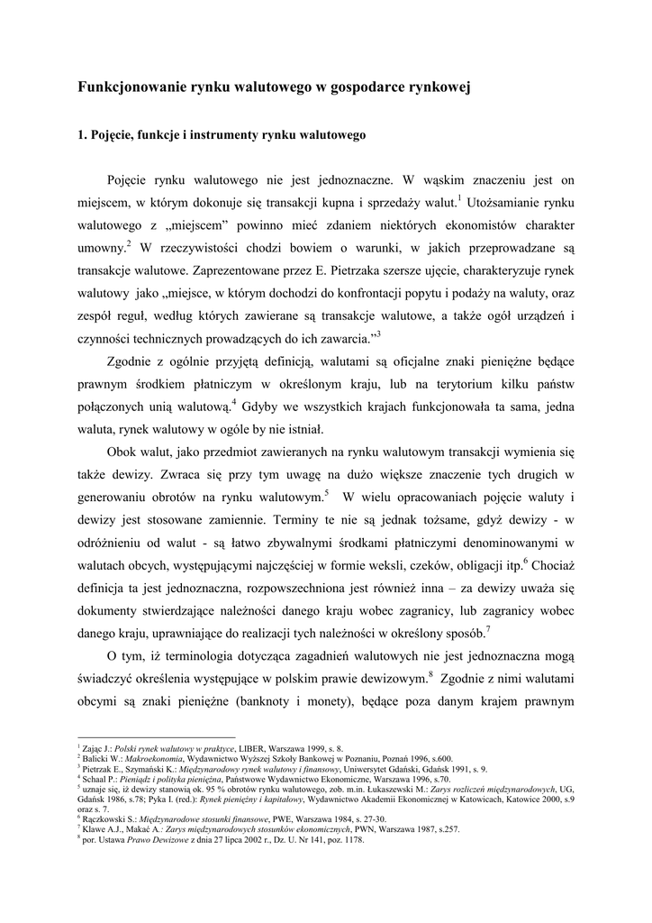 Funkcjonowanie rynku walutowego w gospodarce rynkowej 1. Pojęcie, funkcje i instrumenty rynku walutowego Pojęcie rynku walutowego nie jest jednoznaczne. W wąskim znaczeniu jest on miejscem, w którym dokonuje się transakcji kupna i sprzedaży walut.1 Utożsamianie rynku walutowego z „miejscem” powinno mieć zdaniem niektórych ekonomistów charakter umowny.2 W rzeczywistości chodzi bowiem o warunki, w jakich przeprowadzane są transakcje walutowe. Zaprezentowane przez E. Pietrzaka szersze ujęcie, charakteryzuje rynek walutowy jako „miejsce, w którym dochodzi do konfrontacji popytu i podaży na waluty, oraz zespół reguł, według których zawierane są transakcje walutowe, a także ogół urządzeń i czynności technicznych prowadzących do ich zawarcia.”3 Zgodnie z ogólnie przyjętą definicją, walutami są oficjalne znaki pieniężne będące prawnym środkiem płatniczym w określonym kraju, lub na terytorium kilku państw połączonych unią walutową.4 Gdyby we wszystkich krajach funkcjonowała ta sama, jedna waluta, rynek walutowy w ogóle by nie istniał. Obok walut, jako przedmiot zawieranych na rynku walutowym transakcji wymienia się także dewizy. Zwraca się przy tym uwagę na dużo większe znaczenie tych drugich w generowaniu obrotów na rynku walutowym.5 W wielu opracowaniach pojęcie waluty i dewizy jest stosowane zamiennie. Terminy te nie są jednak tożsame, gdyż dewizy - w odróżnieniu od walut - są łatwo zbywalnymi środkami płatniczymi denominowanymi w walutach obcych, występującymi najczęściej w formie weksli, czeków, obligacji itp.6 Chociaż definicja ta jest jednoznaczna, rozpowszechniona jest również inna – za dewizy uważa się dokumenty stwierdzające należności danego kraju wobec zagranicy, lub zagranicy wobec danego kraju, uprawniające do realizacji tych należności w określony sposób.7 O tym, iż terminologia dotycząca zagadnień walutowych nie jest jednoznaczna mogą świadczyć określenia występujące w polskim prawie dewizowym.8 Zgodnie z nimi walutami obcymi są znaki pieniężne (banknoty i monety), będące poza danym krajem prawnym 1 Zając J.: Polski rynek walutowy w praktyce, LIBER, Warszawa 1999, s. 8. Balicki W.: Makroekonomia, Wydawnictwo Wyższej Szkoły Bankowej w Poznaniu, Poznań 1996, s.600. 3 Pietrzak E., Szymański K.: Międzynarodowy rynek walutowy i finansowy, Uniwersytet Gdański, Gdańsk 1991, s. 9. 4 Schaal P.: Pieniądz i polityka pieniężna, Państwowe Wydawnictwo Ekonomiczne, Warszawa 1996, s.70. 5 uznaje się, iż dewizy stanowią ok. 95 % obrotów rynku walutowego, zob. m.in. Łukaszewski M.: Zarys rozliczeń międzynarodowych, UG, Gdańsk 1986, s.78; Pyka I. (red.): Rynek pieniężny i kapitałowy, Wydawnictwo Akademii Ekonomicznej w Katowicach, Katowice 2000, s.9 oraz s. 7. 6 Rączkowski S.: Międzynarodowe stosunki finansowe, PWE, Warszawa 1984, s. 27-30. 7 Klawe A.J., Makać A.: Zarys międzynarodowych stosunków ekonomicznych, PWN, Warszawa 1987, s.257. 8 por. Ustawa Prawo Dewizowe z dnia 27 lipca 2002 r., Dz. U. Nr 141, poz. 1178. 2 środkiem płatniczym, a także wycofane z obiegu, lecz podlegające wymianie. Dewizy natomiast to papiery wartościowe i inne dokumenty wyrażające zobowiązania w walutach obcych. Z tego też względu rynek walutowy definiuje się często jako taki, na którym przedmiotem zawieranych transakcji są instrumenty finansowe o najwyższym stopniu płynności pochodzące z różnych obszarów walutowych.9 Rynek walutowy, poza przedmiotem obrotów dokonywanych na nim, niczym nie różni się od pozostałych rynków. Dlatego też - podobnie jak na każdym rynku – ustalona na nim cena równowagi jest wynikiem kształtowania się popytu i podaży. Cena jednej waluty wyrażona w jednostkach waluty innego kraju, czyli stosunek, w jakim jedna waluta jest wymieniana na drugą nosi miano kursu walutowego.10 Najważniejszym zadaniem kursu walutowego jest funkcja przelicznika jednej waluty na drugą. Jest on bardzo istotną kategorią ekonomiczną i ważnym instrumentem polityki gospodarczej. Pełni rolę parametru decyzyjnego i jest jednym z najistotniejszych instrumentów pośredniego zarządzania handlem zagranicznym. Nie należy go jedynie utożsamiać z formalnym instrumentem rachunkowym, ponieważ wpływa na koszty i dochody przedsiębiorstw biorących udział w międzynarodowej wymianie zarówno po stronie eksportu, jak i importu.11 Kurs walutowy pełni w gospodarce szereg funkcji, z których najważniejszymi są:12 - funkcja kształtowania polityki pieniężnej, - funkcja informacyjno – decyzyjna, - funkcja cenotwórcza, - funkcja alokacyjna. Jako instrument polityki pieniężnej pełni on ważną rolę w kształtowaniu ilości pieniądza w obiegu, wyrównaniu deficytu bilansu płatniczego, czy ograniczaniu inflacji. Jest on także często wykorzystywany do regulacji obrotów z zagranicą. Obniżenie kursu walutowego w stosunku do walut obcych, czyli dewaluacja, w odróżnieniu od jego podwyższenia zwanego rewaluacją, powoduje spadek cen towarów eksportowych na rynkach zagranicznych i wzrost cen dóbr importowych.13 W sytuacji, gdy zmiana kursu nie następuje na mocy decyzji administracyjnej, lecz pod wpływem sił rynkowych, używa się odpowiednio terminów deprecjacja i aprecjacja. 9 Pietrzak E., Szymański K.: op.cit, s. 29. Nojrzewska E.: Podstawy ekonomii, Wydawnictwon Szkolne i Pedagogiczne, Warszawa 1996, s.377. Zabielski K.: Finanse Międzynarodowe, Wydawnictwo Naukowe PWN, Warszawa 1999, s. 12. 12 Chrabonszczewska E., Kalicki K.: Teoria i polityka kursu walutowego, Szkoła Główna Handlowa, Warszawa 1996, s. 81. 13 por. David J.H.: La monnaie et la politique monetaire, Paris 1986, s.293 – 309. 10 11 Generalnie niska wartość pieniądza krajowego w stosunku do innych walut na międzynarodowym rynku przyczynia się pozytywnie do opłacalności obrotów towarowych. Za tę samą ilość pieniądza zagranicznego, rodzime podmioty uzyskują wi