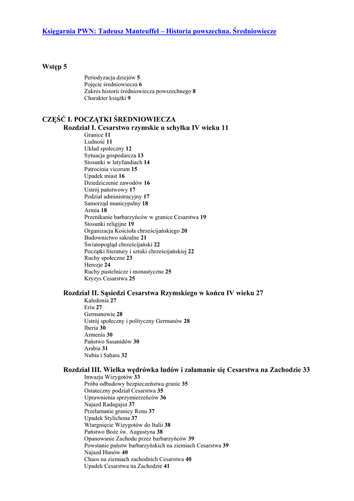Księgarnia PWN: Tadeusz Manteuffel – Historia powszechna. Średniowiecze Wstęp 5 Periodyzacja dziejów 5 Pojęcie średniowiecza 6 Zakres historii średniowiecza powszechnego 8 Charakter książki 9 CZĘŚĆ I. POCZĄTKI ŚREDNIOWIECZA Rozdział I. Cesarstwo rzymskie u schyłku IV wieku 11 Granice 11 Ludność 11 Układ społeczny 12 Sytuacja gospodarcza 13 Stosunki w latyfundiach 14 Patrocinia vicorum 15 Upadek miast 16 Dziedziczenie zawodów 16 Ustrój państwowy 17 Podział administracyjny 17 Samorząd municypalny 18 Armia 18 Przenikanie barbarzyńców w granice Cesarstwa 19 Stosunki religijne 19 Organizacja Kościoła chrześcijańskiego 20 Budownictwo sakralne 21 Światopogląd chrześcijański 22 Początki literatury i sztuki chrześcijańskiej 22 Ruchy społeczne 23 Herezje 24 Ruchy pustelnicze i monastyczne 25 Kryzys Cesarstwa 25 Rozdział II. Sąsiedzi Cesarstwa Rzymskiego w końcu IV wieku 27 Kaledonia 27 Eriu 27 Germanowie 28 Ustrój społeczny i polityczny Germanów 28 Iberia 30 Armenia 30 Państwo Sasanidów 30 Arabia 31 Nubia i Sahara 32 Rozdział III. Wielka wędrówka ludów i załamanie się Cesarstwa na Zachodzie 33 Inwazja Wizygotów 33 Próba odbudowy bezpieczeństwa granic 35 Ostateczny podział Cesarstwa 35 Uprawnienia sprzymierzeńców 36 Najazd Radagajsa 37 Przełamanie granicy Renu 37 Upadek Stylichona 37 Wtargnięcie Wizygotów do Italii 38 Państwo Boże św. Augustyna 38 Opanowanie Zachodu przez barbarzyńców 39 Powstanie państw barbarzyńskich na ziemiach Cesarstwa 39 Najazd Hunów 40 Chaos na ziemiach zachodnich Cesarstwa 40 Upadek Cesarstwa na Zachodzie 41 Rozdział IV. Cesarstwo Rzymskie na Wschodzie 44 Cesarstwo na Wschodzie w V wieku 44 Stosunki społeczne 44 Cesarz i dynastia 45 Spory religijne – monofizytyzm 46 Demy 46 Walka z próbą emancypacji Odoakra 47 Rządy Teodoryka w Italii 47 Walka o przywrócenie Cesarstwu mocarstwowości 48 Rewindykacja Afryki 49 Wojna z Ostrogotami w Italii 49 Reorganizacja odzyskanej Italii 50 Rewindykacja Hiszpanii 51 Reformy wewnętrzne Justyniana 51 Przemiany kulturalne na Wschodzie 51 Ruchy etniczne na pograniczu bałkańskim 53 Najazd Longobardów na Italię 53 Reformy administracyjno-wojskowe Cesarstwa we Włoszech 55 Rzym i Papiestwo 56 Reforma zakonna Benedykta z Nursji 56 Wojna z Persją oraz najazdy Słowian i Awarów 57 Rewolta Fokasa 57 Najazd perski 58 Odbudowa Cesarstwa przez Herakliusza 58 Rozdział V. Arabowie i islam 60 Znaczenie geograficzne Arabii 60 Wystąpienie Mahometa 60 Początki kalifatu 62 Organizacja państwa arabskiego 62 Kryzys wewnętrzny państwa kalifów 64 Rządy Omajadów 65 Szyici i Charidżyci 65 Rozrost terytorialny państwa arabskiego za Omajadów 65 Upowszechnienie przez Arabów zdobyczy cywilizacyjnych 67 Handel 68 Rozkwit literatury 69 Filozofia 69 Nauki ścisłe i doświadczalne 70 Sztuki plastyczne 70 Opozycja przeciw Omajadom i ich upadek 71 Skutki zwycięstwa Abbasydów 71 Ustrój i administracja kalifatu Abbasydów 72 Zarodki rozkładu państwa kalifów 74 Ruchy odśrodkowe 74 Rozdział VI. Państwo Franków 76 Frankowie 76 Zjednoczenie Franków przez Chlodwiga 76 Ustrój społeczny Franków 77 Patrymonialne państwo Franków 78 Skarb 79 Wielka własność 80 Beneficja i prekaria 80 Miasta 81 Immunitety 81 Komendacja 82 Kryzys monarchii Merowingów 82 Rządy Karola Młota 83 Utrata korony przez Merowingów 84 Powstanie Państwa Kościelnego 85 Konsolidacja państwa karolińskiego 85 Niebezpieczeństwo ponownego rozdrobnienia 86 Ponowna interwencja we Włoszech 86 Wojna z Sasami i Słowianami 87 Intrygi bizantyńskie 87 Wojny z Saracenami w Hiszpanii 88 Koronacja cesarska Karola 89 System rządów Karola Wielkiego 90 Podział administracyjny państwa karolińskiego 91 Sądownictwo 92 Skarb 92 Służba wojskowa 92 Degresja gospodarcza Zachodu 93 Gospodarka dominalna 93 Reforma monetarna Karola Wielkiego 94 Renesans karoliński 95 Szkolnictwo karolińskie 95 Dziejopisarstwo karolińskie 96 Sztuki plastyczne 97 Kryzys monarchii karolińskiej 98 Traktat w Verdun 100 Rozdrobnienie feudalne państwa karolińskiego 100 Feudalizacja urzędów 102 Triumf partykularyzmu 102 Feudalizacja duchowieństwa 103 Kształtowanie się stosunków lennych 104 Obowiązki lenne 104 Grupa lenna 105 Wojny prywatne 105 Rozdział VII. Wyspy Brytyjskie i Skandynawia 107 Charakterystyka i fizjografia Brytanii 107 Skutki ewakuacji Brytanii przez Cesarstwo Rzymskie 107 Chrystianizacja Irlandii 108 Organizacja państw anglosaskich i ich chrystianizacja 108 Proces jednoczenia się Brytanii 110 Brytania w orbicie wpływów skandynawskich 110 Ustrój społeczny Anglo-Sasów 111 Ustrój polityczny Anglo-Sasów 112 Normanowie i ich najazdy 113 Podbój Brytanii przez Normanów francuskich 114 Organizacja państwa normandzkiego w Brytanii 115 Brytania w orbicie wpływów francuskich 116 Rozdział VIII. Słowiańszczyzna 117 Pierwotni Słowianie 117 Antowie i Sklawini 117 Słowianie na Bałkanach 118 Dywersja Protobułgarów 118 Słowianie nad środkowym Dunajem 119 Wyodrębnienie się trzech słowiańskich grup językowych 119 Ustrój społeczny Słowian 119 Ustrój polityczny Słowian 120 Stosunki gospodarcze 120 Charakter osadnictwa słowiańskiego 121 Wierzenia religijne Słowian 121 Państwo Samona 122 Państwo Wielkomorawskie 124 Misja Cyryla i Metodego 124 Losy liturgii słowiańskiej 126 Najazd Węgrów i upadek Państwa Wielkomorawskiego 127 Państwa sukcesyjne Wielkich Moraw 127 Słowianie północno-zachodni 128 Początki państwa polskiego 128 Początki Rusi 130 Ruś a Bizancjum 131 Rozdział IX. Bizancjum i Bałkany 133 Bizancjum wobec naporu Arabskiego 133 Położenie Kościoła Wschodniego 134 Niebezpieczeństwo bułgarskie 134 Chrystianizacja Bułgarów 134 Wzmocnienie Bizancjum przez Bazylego 135 Konflikt bizantyńsko-bułgarski 135 Bogomili 136 Upadek pierwotnego państwa bułgarskiego 136 Schizma wschodnia 137 Przekształcenia ustrojowe Bizancjum 137 Temy 139 Ogólna sytuacja gospodarcza Biz