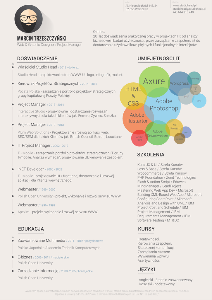 Marcin trzeszczyński Web & Graphic Designer / Project Manager Adres Kontakt Al. Niepodległości 145/24 02-555 Warszawa www.studiohead.pl [email protected] +48 644 213 440 O mnie: 20 lat doświadczenia praktycznej pracy w projektach IT: od analizy biznesowej i badań użyteczności, przez zarządzanie zespołem, aż do dostarczania użytkownikowi pięknych i funkcjonalnych interfejsów. DOŚWIADCZENIE UMIEJĘTNOŚCI IT Właściciel Studio Head / 2012 - do teraz Studio Head - projektowanie stron WWW, UI, logo, infografik, makiet. Kierownik Projektów Strategicznych / 2014 - 2015 Poczta Polska - zarządzanie portfolio projektów strategicznych grupy kapitałowej Poczty Polskiej. Project Manager / 2013 - 2014 Interactive Studio - projektownie i dostarczanie rozwiązań interaktywnych dla takich klientów jak: Ferrero, Żywiec, Śnieżka. Project Manager / 2012 - 2013 Plum Web Solutions - Projektowanie i rozwój aplikacji web, SEO/SEM dla takich Klientów jak: British Council, Boiron, L’occitane. HTML & CSS Axure Adobe Illustartor Adobe Flash Bootstrap Wordpress Adobe Photoshop Adobe Dreamweaver Less & Sass PHP SQL MS Project UML Autocad IT Project Manager / 2002 - 2012 T - Mobile - zarządzanie portfolio projektów strategicznych IT grupy T-mobile. Analiza wymagań, projektowanie UI, kierowanie zespołem. .NET Developer / 2000 - 2002 T - Mobile - projektownie UI / front-end, dostarczanie i urozwój aplikacji dla Klienta wewnętrznego. Webmaster / 1999 - 2000 Polish Open University - projekt, wykonanie i rozwój serwisu WWW. Webmaster / 1996 - 1999 Apexim - projekt, wykonanie i rozwój serwisu WWW. SZKOLENIA Kurs UX & UI / Strefa Kursów Less & Sass / Strefa Kursów Woocommerce / Strefa Kursów PHP Foundation / Zend Technologies Flash & Action Script / Eduweb MindManager / LeadProject Mastering Web App Dev / Microsoft Building XML-Based Web App / Microsoft Configuring SharePoint / Microsoft Analysis and Design with UML / IBM Project Cost and Schedule / IBM Project Management / IBM Requirements Management / IBM Software Testing / MT&DC EDUKACJA KURSY Zaawansowane Multimedia / 2011 - 2012 / podyplomowe Kreatywności. Kierowania zespołem. Skutecznej komunikacji. Zarządzania czasem. Wywierania wpływu. Asertywności. Polsko-Japońska Akademia Technik Komputerowych E-biznes / 2006 - 2011 / magisterskie Polish Open University Zarządzanie Informacją / 2000- 2005 / licencjackie Polish Open University JĘZYKI Angielski - średnio-zaawansowany Rosyjski - podstawowy „Wyrażam zgodę na przetwarzanie moich danych osobowych zawartych w mojej ofercie pracy dla potrzeb niezbędnych do realizacji procesu rekrutacji (zgodnie z ustawą z dn. 29.08.97 roku o Ochronie Danych Osobowych Dz. Ust Nr 133 poz. 883)”