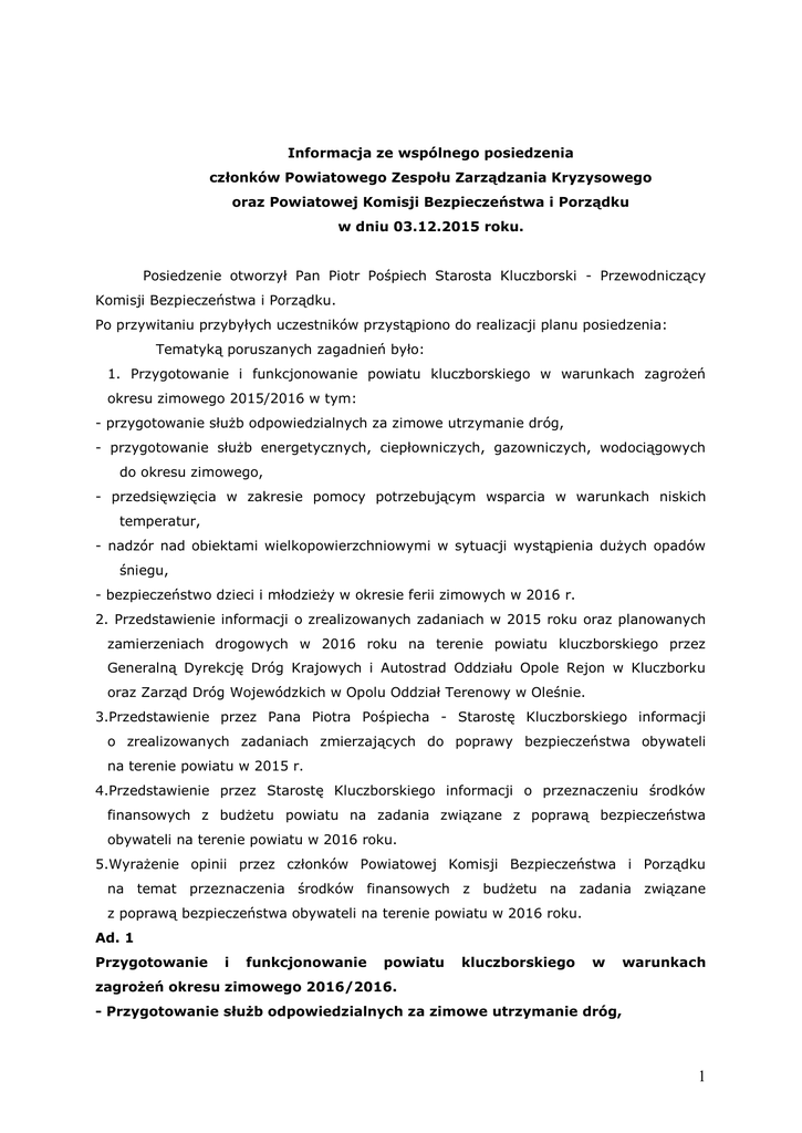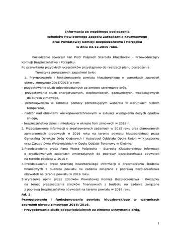 Informacja ze wspólnego posiedzenia członków Powiatowego Zespołu Zarządzania Kryzysowego oraz Powiatowej Komisji Bezpieczeństwa i Porządku w dniu 03.12.2015 roku. Posiedzenie otworzył Pan Piotr Pośpiech Starosta Kluczborski - Przewodniczący Komisji Bezpieczeństwa i Porządku. Po przywitaniu przybyłych uczestników przystąpiono do realizacji planu posiedzenia: Tematyką poruszanych zagadnień było: 1. Przygotowanie i funkcjonowanie powiatu kluczborskiego w warunkach zagrożeń okresu zimowego 2015/2016 w tym: - przygotowanie służb odpowiedzialnych za zimowe utrzymanie dróg, - przygotowanie służb energetycznych, ciepłowniczych, gazowniczych, wodociągowych do okresu zimowego, - przedsięwzięcia w zakresie pomocy potrzebującym wsparcia w warunkach niskich temperatur, - nadzór nad obiektami wielkopowierzchniowymi w sytuacji wystąpienia dużych opadów śniegu, - bezpieczeństwo dzieci i młodzieży w okresie ferii zimowych w 2016 r. 2. Przedstawienie informacji o zrealizowanych zadaniach w 2015 roku oraz planowanych zamierzeniach drogowych w 2016 roku na terenie powiatu kluczborskiego przez Generalną Dyrekcję Dróg Krajowych i Autostrad Oddziału Opole Rejon w Kluczborku oraz Zarząd Dróg Wojewódzkich w Opolu Oddział Terenowy w Oleśnie. 3.Przedstawienie przez Pana Piotra Pośpiecha - Starostę Kluczborskiego informacji o zrealizowanych zadaniach zmierzających do poprawy bezpieczeństwa obywateli na terenie powiatu w 2015 r. 4.Przedstawienie przez Starostę Kluczborskiego informacji o przeznaczeniu środków finansowych z budżetu powiatu na zadania związane z poprawą bezpieczeństwa obywateli na terenie powiatu w 2016 roku. 5.Wyrażenie opinii przez członków Powiatowej Komisji Bezpieczeństwa i Porządku na temat przeznaczenia środków finansowych z budżetu na zadania związane z poprawą bezpieczeństwa obywateli na terenie powiatu w 2016 roku. Ad. 1 Przygotowanie i funkcjonowanie powiatu kluczborskiego w warunkach zagrożeń okresu zimowego 2016/2016. - Przygotowanie służb odpowiedzialnych za zimowe utrzymanie dróg, 1 Kierownik Zarządu Dróg Wojewódzkich w Opolu Oddziału Terenowego w Oleśnie przedstawił materiał dotyczący organizacji zimowego utrzymania dróg wojewódzkich (na obszarze powiatu kluczborskiego w sezonie 2015/2016) w niżej przedstawionych obszarach. Zasady prowadzenia robót zimowego utrzymania dróg. Teren powiatu kluczborskiego obsługiwany jest przez bazę sprzętowo - transportową znajdującą się w Oleśnie na terenie Oddziału Terenowego przy drodze krajowej nr 11 ul. Wielkie Przedmieście 3 46-300 Olesno. Zarząd Dróg Wojewódzkich w Opolu — Oddział Terenowy w Oleśnie administruje drogami wojewódzkimi na obszarze powiatu kluczborskiego o łącznej długości 18,805 km . Prace związane z zimowym utrzymaniem dróg prowadzone będą na następujących drogach wojewódzkich: dw nr - 494 Bierdzany - Bodzanowice od km 2+439 do km 13+702, dl. 11,263 km dw nr - 487 Byczyna - Olesno od km 0+000 do km 7+542, dł. 7,542 km W tym odcinki utrzymywane w: III standardzie dw 494 Bierdzany - Bodzanowice - 11,263 km - dł. odcinków do posypywania - miejsca niebezpieczne 4,400 km VI standardzie dw 487 Byczyna - Olesno - 7,542 km - dł. odcinków do posypywania - miejsca niebezpieczne 2,800 łon Wszystkie sprawy organizacyjne, związane z zimowym utrzymaniem dróg, podlegają Kierownikowi Oddziału Terenowego w Oleśnie - Zarządu Dróg Wojewódzkich w Opolu Panu Tomaszowi Sosnowskiemu zam. Olesno ul. Słowackiego 1/93, tel. kom. 504 029 645. Do kierowania bezpośrednio akcją zimową w Oddziale Terenowym w Oleśnie został wyznaczony Majster ZDW Opole - OT w Oleśnie Pan Franciszek Leś zam. Olesno ul. Konopnickiej 10/10 tel. kom. 504 029 646. Z chwilą rozpoczęcia prac przy odśnieżaniu dróg i zwalczaniu śliskości wprowadzone będą dyżury pracowników Oddziału Terenowego w budynku przy ulicy Wielkie Przedmieście 3 w Oleśnie przy kierowaniu i koordynowaniu prac. Zakres dyżurów będzie uzależniony od prognozowania warunków atmosferycznych i stanu przejezdności dróg. Telefony kontaktowe: - od poniedziałku do piątku w godz. 7:00 - 15:00 tel: (034) 350- 91-90 od poniedziałku do piątku w godz. 15:00 - 7:00, oraz soboty, niedziele i święta tel: (034) 350-91-99 Standardy zimowego utrzymania dróg. Przy odśnieżaniu dróg i zwalczaniu śliskości zimowej wprowadzono standardy prac, które uzależnione są od funkcji w układzie komunikacyjnym oraz obciążenia 2 ruchem. Standardy te będą stosowane przy średnich warunkach zimowych. W przypadku obfitych opadów śniegu w pierwszej kolejności sprzęt kierowany będzie na drogi III standardu. Natomiast na drogach zakwalifikowanych do IV standardu przejezdność utrzymywana będzie w drugiej kolejności. Zimowe utrzymanie dróg obejmuje prace mające na celu zmniejszenia lub ograniczenie zakłóceń ruchu drogowego wywołanych czynnikami atmosferycznymi takimi jak śliskość zimowa oraz opady śniegu. Zapewnienie w okresie zimowym pełnej i stałej przejezdności dróg twardych, bez jakichkolwiek przerw i utrudnień w ruchu jest niemożliwe z powodu braku zabezpieczenia finansowego. Osłona bierna i meteorologiczna dróg. Odcinki dróg najbardziej narażone na zawiewanie śniegiem i powstawaniem zasp przed sezonem zimowym zostają zabezpieczone zasłonami przeciwśnieżnymi. Są to zasłony z siatki z tworzyw sztucznych. Odcinki dróg najbardziej podatne na powstawanie śliskości zimowej, (odcinki leśne, okolice wiaduktów i mostów drogowych), zostały oznakowane znakami A-32 „oszronienie jezdni". Do prawidłowego prowadzenia prac przy zimowym utrzymaniu dróg niezbędna jest między innymi informacja o stanie pogody i kierunku jej zmian. ZDW Opole - OT Olesno będzie otrzymywało taką informację na podstawie zawartej umowy z Meteogroup Polska Sp. z o.o. z siedzibą w Warszawie. Lokalizacja znaków drogowych typ - A-32 „oszronienie jezdni" na terenie powiat