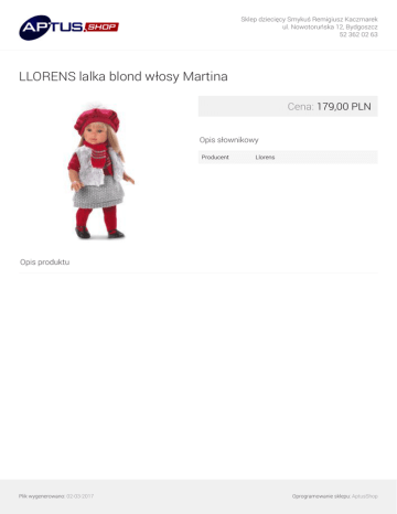 Sklep dziecięcy Smykuś Remigiusz Kaczmarek ul. Nowotoruńska 12, Bydgoszcz 52 362 02 63 LLORENS lalka blond włosy Martina Cena: 179,00 PLN Opis słownikowy Producent Llorens Opis produktu Plik wygenerowano: 02-03-2017 Powered by TCPDF (www.tcpdf.org) Oprogramowanie sklepu: AptusShop