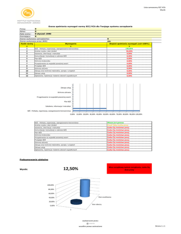Lista samooceny SCC VCA Wynik Ocena spełnienia wymagań normy SCC/VCA dla Twojego systemu zarządzania 0 Firma: 0 Adres: 0 styczeń 1900 Data oceny: 0 Oceniający: Ocena wykonana samodzielnie: 0 Ocena wykonana przez IKMJ: nie Punkt normy Wymaganie x x 1 2 3 4 5 6 7 8 9 10 11 12 Stopień spełnienia wymagań (cel=100%) x 100,00% 50,00% 0,00% 0,00% 0,00% 0,00% 0,00% 0,00% 0,00% 0,00% 0,00% 0,00% BZŚ - Polityka, organizacja, zaangażowanie kierownictwa Analiza ryzyka / plan działań Szkolenie, informacja i instruktaż Komunikacja i konsultacje w zakresie BZŚ Plan BZŚ Ochrona środowiska Przygotowanie na wypadek poważnej awarii Przeglądy BZŚ Ochrona zdrowia Zakupy oraz kontrola materiałów, sprzętu i urządzeń Zakupy usług Zgłaszanie, rejestracja i badanie zdarzeń wypadkowych Zakupy usług Ochrona zdrowia Przygotowanie na wypadek poważnej awarii Plan BZŚ Szkolenie, informacja i instruktaż BZŚ - Polityka, organizacja, zaangażowanie kierownictwa 0,00% 10,00% 20,00% 30,00% 40,00% 50,00% 60,00% 70,00% 80,00% 90,00% 100,00% Obszar jest gotowy Przed Tobą trochę pracy Czeka Cię mnóstwo pracy Czeka Cię mnóstwo pracy Czeka Cię mnóstwo pracy Czeka Cię mnóstwo pracy Czeka Cię mnóstwo pracy Czeka Cię mnóstwo pracy Czeka Cię mnóstwo pracy Czeka Cię mnóstwo pracy Czeka Cię mnóstwo pracy Czeka Cię mnóstwo pracy BZŚ - Polityka, organizacja, zaangażowanie kierownictwa Analiza ryzyka / plan działań Szkolenie, informacja i instruktaż Komunikacja i konsultacje w zakresie BZŚ Plan BZŚ Ochrona środowiska Przygotowanie na wypadek poważnej awarii Przeglądy BZŚ Ochrona zdrowia Zakupy oraz kontrola materiałów, sprzętu i urządzeń Zakupy usług Zgłaszanie, rejestracja i badanie zdarzeń wypadkowych Podsumowanie globalne Masz szczątkowy system zarządzania, czeka Cię dużo pracy 12,50% Wynik: 100,00% 80,00% 60,00% Stan oczekiwany 40,00% 20,00% Stan obecny 0,00% 1 wytworzone przez: wszelkie prawa zastrzeżone Strona 1 z 1