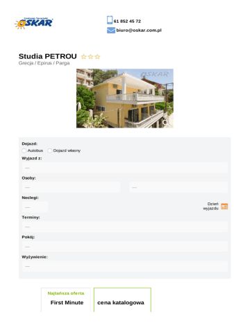 61 852 45 72 [email protected] Studia PETROU Grecja / Epirus / Parga Dojazd: Autobus Dojazd własny Wyjazd z: Osoby: Noclegi: Dzień wyjazdu Terminy: Pokój: Wyżywienie: Najtańsza oferta First Minute cena katalogowa do 5 marca 2017: 601,20 zł do 5 marca 2017: 601,20 zł do 2 kwietnia 2017: 1402,80 zł do 2 kwietnia 2017: 1402,80 zł Suma:2004,00 Suma: zł 2004,00 zł Opis oferty Miejscowość Atuty położone Opinie w centrum Pargi bliskość plaży cisza i spokój Rozkład jazdy aneks kuchenny we wszystkich studiach Położenie Obiekt położony w centrum malowniczej Pargi, w cichej dzielnicy mieszkalnej. Idealne miejsce pozwalające odpocząć od codzienności i miejskiego hałasu. Zaledwie krótki spacer dzieli Studia Petrou od wszystkich atrakcji miasta, a oddalona o 400 metrów piaszczysta plaża umożliwia całodzienne plażowanie. Studia i apartamenty wyposażone w aneksy kuchenne zadowolą nawet najbardziej wymagających, a przepiękne widoki sprawią, że pokochasz Pargę! Zakwaterowanie Zakwaterowanie w studiach 2-3 – osobowych z aneksami kuchennymi z podstawowym wyposażeniem. Każde studio posiada balkon lub taras. Dostępne opcje zakwaterowania studio 2 osobowe studio 3 osobowe dokwaterowanie* / studio 1 osobowe (dopłata) Dostępne opcje wyżywienia we własnym zakresie śniadania obiadokolacje śniadania i obiadokolacje Pakiet KOMFORT gwarancja wyboru miejsca w autokarze napoje w autokarze w cenie (6 x do wyboru: kawa, herbata, zimny napój 0,2l) cena: 50 zł/os Pakiet PRESTIGE gwarancja wyboru miejsca w autokarze napoje w autokarze w cenie (6 x do wyboru: kawa, herbata, zimny napój 0,2l) pierwszeństwo wejścia na pokład autokaru nadbagaż 5 kg w cenie suchy prowiant na drogę powrotną cena: 100 zł/os Karta Dużej Rodziny www.oskar.com.pl/zalaczniki/karta_duzej_rodziny Warunki promocji FIRST MINUTE www.oskar.com.pl/zalaczniki/warunki_promocji Ubezpieczenie Warunki ubezpieczenia Bezpieczne Podróże Signal Iduna dokument do pobrania www.oskar.com.pl/zalaczniki/owu Warunki ubezpieczenia Kosztów Imprezy Turystycznej Signal Iduna dokument do pobrania www.oskar.com.pl/zalaczniki/owurg Turystyczny Fundusz Gwarancyjny W związku z powołaniem do życia w dniu 26.11.2016 Turystycznego Funduszu Gwarancyjnego każdy klient Biura Podróży Oskar zobowiązany jest do zapłaty kwoty w wysokości 10zł/os. przy każdorazowej rezerwacji imprezy turystycznej (obowiązuje od dnia 26.11.2016). Kwota przeznaczona na Turystyczny Fundusz Gwarancyjny zostanie automatycznie doliczona do wartości rezerwacji (w momencie jej dokonania). Wyjątkiem są imprezy turystyczne odbywające się w krajach posiadających granicę z Rzeczpospolitą Polską. Składka nie jest przychodem biura. Udogodnienia Klimatyzacja Regulowane fotele Tacki Nowoczesna flota Zawodowy kierowca Pasy bezpieczeństwa Toaleta w autokarze Podnóżki Lodówka AGD RTV Bez paszportu Spokojna okolica Region nadmorski Program ramowy Dzień 1 - 2 Wyjazd z Polski zgodnie z rozkładem jazdy autokarów. Przejazd przez Czechy, Słowację, Węgry, Serbię, Macedonię. Dzień 3 Przyjazd do Pargi w godzinach popołudniowych. Zakwaterowanie. Dzień 4 - 12 Pobyt na miejscu. Możliwość korzystania z dodatkowych wycieczek fakultatywnych. Dzień 12 Wykwaterowanie do godz. 09.00. Czas wolny. Wyjazd do Polski w godzinach popołudniowych. Dzień 13 - 14 Przejazd przez Macedonię, Serbię, Węgry, Słowację, Czechy. Przyjazd do Polski. Orientacyjne godziny powrotu do poszczególnych miast zgodnie z rozkładem jazdy autokarów. Cena obejmuje przejazd autokarem klasy LUX (klimatyzacja, cafe - bar, DVD, WC) zakwaterowanie: 9 noclegów w Studio PETROU opiekę pilota w czasie podróży opieka rezydenta na miejscu wyżywienie wg wybranej opcji oferta obejmuje sprzątanie początkowe i końcowe; w czasie pobytu sprzątanie we własnym zakresie ubezpieczenie KL 10000 euro, NNW 10000 zł, bagaż (utrata 500 zł) Cena nie obejmuje Dopłaty wymagane na miejscu opłata serwisowo - kwaterunkowa 10 euro/os; dzieci do 12 lat płacą 50% - płatne u pilota w autokarze Dopłaty opcjonalne ubezpieczenie od chorób przewlekłych i nowotworowych KL 20000 euro, NNW 10000 zł, bagaż (utrata 500 zł): 160 zł/os ubezpieczenie od kosztów rezygnacji: 3,5% wartości rezerwacji Informacje dodatkowe dokumenty: paszport lub dowód osobisty (zgodnie z obowiązującymi przepisami) zaleca się wyrobienie karty EKUZ aneks kuchenny o podstawowym wyposażeniu (lodówka, kuchenka gazowa lub elektryczna, garnki, naczynia, sztućce) należy posiadać własne ręczniki i środki czystości Chcesz wiedzieć szybciej? Polub nas na facebooku OSKAR Sp. z o.o. pl.Wolności 2/4c, 61-738 Poznań Potrzebujesz pomocy? Zadzwoń lub napisz: 61 852 45 72 [email protected] Zadzwoń Projekt i wdrożenie: Simply User