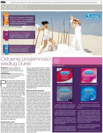 DODATEK DYSTRYBUOWANY WRAZ Z DZIENNIKIEM METRO ZAWIERA WYŁĄCZNIE MATERIAŁY PRZYGOTOWANE I POCHODZĄCE OD MEDIAPLANET 3 NOWOŚCI Materiał promocyjny Żele 2 w 1 intymne i do masażu z Linii Blisko i Czule powstały z myślą o zapewnieniu partnerom maksymalnej bliskości. Linia Zabawa i Przygoda, to gwarancja, że w sypialni nigdy nie powieje nudą! Linię Pewność i Zaufanie stworzono by zapewnić podstawowe nawilżenie. Odcienie przyjemności według Durex ■ Pytanie: Chcesz wiedzieć jak sprawić, by chwile spędzane we dwoje dawały jeszcze więcej radości i satysfakcji? ■ Odpowiedź: Musisz się nauczyć jasno komunikować partnerowi swoje potrzeby i nie bać się realizacji najskrytszych pragnień. P olski seks nadal nieśmiało wygląda spod pierzyny, jednak z roku na rok jesteśmy z niego coraz bardziej zadowoleni. Według najnowszych wyników badania Durex Global Sex Wellbeing Survey coraz więcej Polaków, bo aż 74% uważa swoje życie seksualne za udane. To bardzo dobry wynik, który pokazuje, że przez ostatnich kilka lat zadowolenie Polaków z seksu wzrosło. Jeszcze w 2008 roku, w tym samym badaniu, tylko 54% ankietowanych oceniło je pozytywnie. Od lat, największym sprzymierzeńcem w intymnej sferze życia są prezerwatywy – stosuje je prawie połowa Polaków. Durex, ekspert w dziedzinie życia seksualnego, przygotował dla miłośników łóżkowych igraszek, 4 wyjątkowe linie produktów dedykowanych przyjemności i bezpieczeństwu. Edukacja i zwiększanie świadomość seksualnej, to przesłania marki, dzięki którym ludzie na całym świecie mogą cieszyć się z udanego i bezpiecznego życia intymnego. 4 linie produktów – Pewność i Zaufanie, Zabawa i Przygoda, Blisko i Czule oraz Więcej i Dłużej to szeroka gama prezerwatyw i żeli intymnych, które mają nie tylko chronić, ale także bawić i rozpieszczać. Kochaj mnie czule Świat to różni ludzie o odmiennych upodobaniach i potrzebach. Durex to świadoma tych potrzeb marka, otwarcie reagująca i dopasowująca swoje produkty do zapotrzebowań kochanków z różnych stron świata. Jak przystało na najlepszego przewodnika po świecie seksu, Durex na pierwszym miejscu stawia bezpieczeństwo. Produkty z flagowej linii Pewność i Zaufanie to połączenie odpowiedniego nawilżenia z poczuciem ochrony przed ciążą i chorobami intymnymi. W udanym związku partnerzy pragną doświadczać prawdziwej jedności. Niezwykle cienkie prezerwatywy z serii Blisko i Czule pozwalają o sobie zapomnieć i odczuć większą przyjemność z maksymalnej bliskości. Żele intymne z tej samej linii pomogą rozpocząć zmysłową grę wstępną od pobudzającego masażu. Spragnieni czułości kochankowie mogą przebierać wśród zapachów energetyzującej Guarany, kwiatów Ylang Ylang i kojącego Aloesu. CZY WIESZ, ŻE... Linia Blisko i Czule Linia Zabawa i Przygoda Więcej, dłużej, mocniej Durex zachęca partnerów do odważnego komunikowania swoich pragnień i bezwstydnego mówienia o seksie. Jedną z potrzeb może być chęć zabawy i wprowadzenia nowych elementów do sypialni. Z tą myślą powstała linia produktów Durex Zabawa i Przygoda. Wyjątkowe prezerwatywy i lubrykanty z tej serii, oprócz ochrony i zabezpieczenia, dostarczają prawdziwej eksplozji kolorowych, owocowych doznań. Intrygujące prążki i wypustki potęgują przyjemność ze zbliżenia, a żele o smaku i zapachu Soczystej Wiśni, Słodkiej Truskawki czy Pina Colady, urozmaicą miłosne figle każdej pary. Wszystkim, którzy szukają sposobu na wydłużenie miłosnych igraszek dedykowana jest linia Durex Więcej i Dłużej. Prezerwatywy Performa z benzokainą pomogą opóźnić erekcję i pozwolą czerpać dłuższą przyjemność z cielesnych uciech. Z myślą o paniach powstał wyjątkowy żel Durex Play „O”, który uwrażliwiając sfery intymne wzmacnia seksualne doznania. Poszukiwacze nowych wrażeń powinni wypróbować nakładkę wibracyjną Durex Vibrations Ring, która dostarczy niezapomnianych, wibrujących emocji. Uwolnij swoje potrzeby z Durex i ciesz się prawdziwą przyjemnością z miłosnego tête-à-tête. Linia Więcej i Dłużej Linia Pewność i Zaufanie ■ Większość badanych, zwłaszcza kobiety (57%) twierdzi, że ich życie seksualne z wiekiem staje się coraz lepsze. ■ 5% ankietowanych nie uprawia miłości w ogóle, a 1% pań i 4% panów płaci za seks. ■ 70% ankietowanych, zarówno kobiet i mężczyzn zgadza się, że nawet w długoletnich związkach można na wiele sposobów podsycać erotyczną fascynację. ■ Do najpopularniejszych środków antykoncepcyjnych cały czas należy prezerwatywa – stosuje ją 49% badanych. Aż 28% respondentów uznało stosunek przerywany za metodę antykoncepcyjną, a 21% przyznało, że nie zabezpiecza się w żaden sposób. Z metod naturalnej antykoncepcji korzysta 22% ankietowanych, a 19% stosuje środki hormonalne. ■ Połowa Polaków deklaruje, że kocha się tak często, jak chce. 14% uprawia seks przynajmniej 5 razy w tygodniu, a 1/4 respondentów przyznała, że współżyje 3-4 razy w tygodniu. ■ W celu poprawy życia seksualnego, Polacy najczęściej decydują się na rozmowę z partnerem (44% kobiet) lub szukają informacji w Internecie (39% mężczyzn). ■ Polacy nie są jednak najwierniejszymi partnerami. Wierność seksualną deklaruje 74% kobiet i 65% mężczyzn. Źródło: Durex Global Sex Wellbeing Survey 2011
