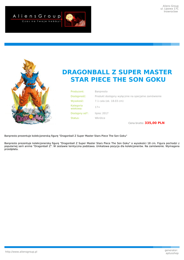 Aliens Group ul. Lipowa 17C Inowrocław DRAGONBALL Z SUPER MASTER STAR PIECE THE SON GOKU Producent: Banpresto Dostępność: Produkt dostępny wyłącznie na specjalne zamówienie Wysokość: 7.1 cala (ok. 18.03 cm) Kategoria wiekowa: 17+ Dostępny od*: lipiec 2017 Status: Wkrótce Cena brutto: 335,00 PLN Banpresto prezentuje kolekcjonerską figurę "Dragonball Z Super Master Stars Piece The Son Goku" Banpresto prezentuje kolekcjonerską figurę "Dragonball Z Super Master Stars Piece The Son Goku" o wysokości 18 cm. Figura pochodzi z popularnej serii anime "Dragonball Z". W zestawie temtyczna podstawa. Unikatowa pozycja dla kolekcjonerów. Na zamówienie. Wymagana przedpłata. http://www.aliensgroup.pl generator: aptusshop