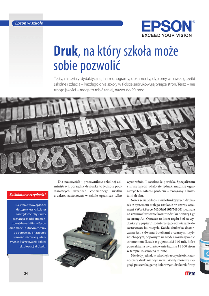 Epson w szkole Druk, na który szkoła może sobie pozwolić Testy, materiały dydaktyczne, harmonogramy, dokumenty, dyplomy a nawet gazetki szkolne i zdjęcia – każdego dnia szkoły w Polsce zadrukowują tysiące stron. Teraz – nie tracąc jakości – mogą to robić taniej, nawet do 90 proc. Kalkulator oszczędności Na stronie www.epson.pl dostępny jest kalkulator oszczędności. Wystarczy zaznaczyć model atramentowej drukarki firmy Epson oraz model, z którym chcemy go porównać, a następnie wskazać szacowaną intensywność użytkowania i okres eksploatacji drukarki. 24 Dla nauczycieli i pracowników szkolnej administracji porządna drukarka to jedno z podstawowych urządzeń codziennego użytku a zakres zastosowań w szkole ogranicza tylko wyobraźnia. I zasobność portfela. Specjalistom z firmy Epson udało się jednak znacznie ograniczyć ten ostatni problem – związany z kosztami druku. Nowa seria jedno- i wielofunkcyjnych drukarek z systemem stałego zasilania w czarny atrament (WorkForce M200/M105/M100) pozwala na zminimalizowanie kosztów druku poniżej 1 gr za stronę A4. Oznacza to koszt rzędu 5 zł za wydruk ryzy papieru! To interesujące rozwiązanie do zastosowań biurowych. Każda drukarka dostarczana jest z dwoma butelkami z czarnym, szybkoschnącym, odpornym na wodę i rozmazywanie atramentem (każda o pojemności 140 ml), które pozwalają na wydrukowanie łącznie 11 000 stron w tempie 15 stron na minutę. Niekiedy jednak w szkolnej rzeczywistości czarno-biały druk nie wystarcza. Wtedy możemy sięgnąć po szeroką gamę kolorowych drukarek firmy Promocja Epson – i w tym przypadku konstruktorzy zadbali nie tylko o jakość, lecz także o kieszenie użytkowników. Drukarki L550, L355 i L300 są dostarczane z dwoma dodatkowymi buteleczkami z atramentem, który wystarcza do wydrukowania około 12 000 stron czarno-białych i 6 500 stron kolorowych. L210 i L110 dostarczane są z atramentem, który wystarcza do wydrukowania około 6 500 stron kolorowych i 4 000 stron czarno-białych. Wygodne buteleczki o pojemności 70 ml zapewniają również niezwykle niski koszt druku poniżej 1 gr za stronę w czerni i poniżej 2 gr za stronę w druku kolorowym. Zalety drukarek Epson Specjaliści z Epsona poszukując rozwiązań minimalizujących koszty druku poszli o krok dalej i stworzyli drukarkę L800, która pozwala na druk zdjęć w pełnej palecie barw – nie różnią się od zdjęć wykonywanych w zakładach fotograficznych niczym, poza ceną: koszt druku zdjęcia w formacie 10x15 cm to około 16 gr (dla porównania: np. w Empiku ceny zaczynają się od 35 gr). To świetny pomysł na tanie uwiecznianie szkolnych uroczystości, konferencji czy wydarzeń z życia placówki. Drukarka, umożliwiająca drukowanie zdjęć w żywych i naturalnych kolorach o dużej trwałości, bez marginesów do formatu A4, dostarczana jest z atramentem wystarczającym na wydrukowanie około 1 800 zdjęć (10x15 cm) – każdego w zaledwie 12 sekund. Zintegrowany bardzo duży pojemnik na atrament zapewniający niezwykle niski koszt drukowania Bezproblemowa konfiguracja i niezawodne działanie Technologia szybkiego uzupełniania atramentu zapewniająca czyste i łatwe uzupełnianie Zawór zamykający umożliwiający łatwy i bezpieczny transport Oryginalny, wysokiej jakość atrament Epson do profesjonalnych wydruków Specjalnie zaprojektowane szczelne zakrętki, filtry i rurki ograniczają do minimum straty atramentu Zintegrowane rurki doprowadzające tusz zapobiegają zacięciom papieru Wewnętrzny spokój z gwarancją firmy Epson Szczegółowe dane techniczne opisywanych urządzeń na www.epson.pl 25