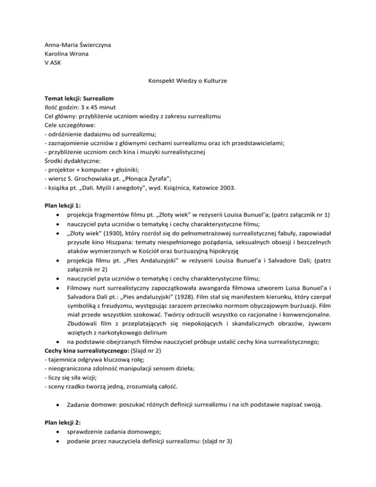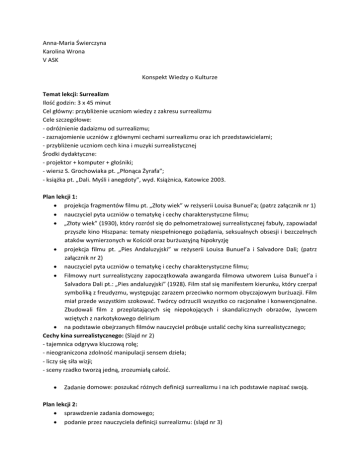 Anna‐Maria Świerczyna Karolina Wrona V ASK Konspekt Wiedzy o Kulturze Temat lekcji: Surrealizm Ilość godzin: 3 x 45 minut Cel główny: przybliżenie uczniom wiedzy z zakresu surrealizmu Cele szczegółowe: ‐ odróżnienie dadaizmu od surrealizmu; ‐ zaznajomienie uczniów z głównymi cechami surrealizmu oraz ich przedstawicielami; ‐ przybliżenie uczniom cech kina i muzyki surrealistycznej Środki dydaktyczne: ‐ projektor + komputer + głośniki; ‐ wiersz S. Grochowiaka pt. „Płonąca Żyrafa”; ‐ książka pt. „Dali. Myśli i anegdoty”, wyd. Książnica, Katowice 2003. Plan lekcji 1: projekcja fragmentów filmu pt. „Złoty wiek” w reżyserii Louisa Bunuel’a; (patrz załącznik nr 1) nauczyciel pyta uczniów o tematykę i cechy charakterystyczne filmu; „Złoty wiek” (1930), który rozrósł się do pełnometrażowej surrealistycznej fabuły, zapowiadał przyszłe kino Hiszpana: tematy niespełnionego pożądania, seksualnych obsesji i bezczelnych ataków wymierzonych w Kościół oraz burżuazyjną hipokryzję projekcja filmu pt. „Pies Andaluzyjski” w reżyserii Louisa Bunuel’a i Salvadore Dali; (patrz załącznik nr 2) nauczyciel pyta uczniów o tematykę i cechy charakterystyczne filmu; Filmowy nurt surrealistyczny zapoczątkowała awangarda filmowa utworem Luisa Bunuel’a i Salvadora Dali pt.: „Pies andaluzyjski” (1928). Film stał się manifestem kierunku, który czerpał symboliką z freudyzmu, występując zarazem przeciwko normom obyczajowym burżuazji. Film miał przede wszystkim szokować. Twórcy odrzucili wszystko co racjonalne i konwencjonalne. Zbudowali film z przeplatających się niepokojących i skandalicznych obrazów, żywcem wziętych z narkotykowego delirium na podstawie obejrzanych filmów nauczyciel próbuje ustalić cechy kina surrealistycznego; Cechy kina surrealistycznego: (Slajd nr 2) ‐ tajemnica odgrywa kluczową rolę; ‐ nieograniczona zdolność manipulacji sensem dzieła; ‐ liczy się siła wizji; ‐ sceny rzadko tworzą jedną, zrozumiałą całość. Zadanie domowe: poszukać różnych definicji surrealizmu i na ich podstawie napisać swoją. Plan lekcji 2: sprawdzenie zadania domowego; podanie przez nauczyciela definicji surrealizmu: (slajd nr 3) Surrealizm (nadrealizm) – ruch artystyczny powstały w 1920‐1930 we Francji, pragnący uniezależnić wyobraźnię artysty od form logicznego myślenia, popierający twórczość na skojarzeniach płynących z podświadomości i marzeń sennych, wyrażających się w nie powiązanych ze sobą obrazach fantastycznych, w nienaturalnych zestawieniach i kombinacjach. historia W 1924r. w Paryżu Andre Breton, nazywany przez złośliwych „papieżem surrealizmu”, ogłosił „Manifest Surrealistyczny” będący pierwszym teoretycznym tekstem formułującym założenia nowego kierunku. Manifest wyrażał nieufność wobec intelektu, pogardę dla zdrowego rozsądku, ciasnego racjonalizmu i pragmatyzmu. Głosił kult wyobraźni i zapowiadał walkę z siłami, które ją krępują. Marzenia senne i halucynacje uznał za cenne źródło w procesie poznawania świata. Tekst ten uważa się za oficjalny początek surrealizmu. Surrealizm narodził się w okresie powszechnego kryzysu ideowego i głębokiej depresji jaka powstała w Europie po I wojnie światowej. Był wyrazem buntu młodych artystów wobec mieszczańskiego społeczeństwa oraz istniejącej rzeczywistości społecznej i politycznej. Na powstanie nadrealizmu miał wpływ dadaizm (1916 – 1923) głoszący destrukcję, bezlitosną negację i szyderstwo z wszelkich powszechnie uznanych wartości. Dadaizm nie miał jednak programu konstruktywnego i twórcy paryskiej grupy Dada: Andre Breton i Luis Aragon stali się inspiratorami surrealizmu. przedstawienie różnic pomiędzy dadaizmem i surrealizmem; (slajd nr 4) Dadaizm: ‐destrukcja; ‐ negacja i szyderstwo uznawanych wartości; ‐ brak konstruktywnego programu i dlatego jego twórcy Andre Breton i Luis Aragon stają się inspiratorami surrealizmu Surrealizm: ‐nieufność wobec intelektu; ‐ pogarda wobec zdrowego rozsądku; ‐ kult wyobraźni; ‐marzenia senne i halucynacje jako źródło poznania świata; ‐ inspiracją dla sztuki: baśnie, mity, twórczość dzieci i umysłowo chorych. przedstawiciele kierunku i ich dzieła: (slajdy nr 5 – 71) ‐ Marcel Duchamp; ‐ Francis Picabia; ‐ Yves Tanguy; ‐ Max Ernst; ‐ Zdzisław Beksiński; ‐ Salvador Dali; (przedstawienie wybranych cytatów z książki pt. „Dali. Myśli i anegdoty”. jeden z uczniów czyta przygotowany przez nauczyciela wiersz Stanisława Grochowiaka pt. „Płonąca Żyrafa” (slajd nr 71) (patrz załącznik nr 3) nauczyciel przedstawia techniki twórcze, którymi posługiwali się surrealiści (slajd nr 72) Techniki twórcze: ‐ kolaż, frotaż – pocieranie ołówkiem kartki położonej na tkaninę lub drewno, na której odciska się faktura; ‐ fumaż – zadymianie, przypalanie oraz rozdmuchiwanie płynnej farby na podłożu; ‐ dekalkomania – odbijanie przypadkowych plam. Zadanie domowe: 1. Przygotować informacje na temat twórczości wybranego przedstawiciela surrealizmu. 2. Znaleźć przykłady dzieł wykonanych przedstawionymi przez nauczyciela technikami twórczymi. Plan lekcji 3. sprawdzenie zadania domowego; uczniowie przy wtórowaniu muzyki surrealistycznej wykonują prace techniką frotażu; rozdanie uczniom krzyżówki sprawdzającej wiadomości na temat surrealizmu (patrz załącznik nr 4); w trakcie rozwiązywania przez uczniów krzyżówki – slajdy nr 73 do 76; sprawdzenie krzyżówki i nagrodzenie ucznia, który jako pierwszy wypełnił wszystkie pola.