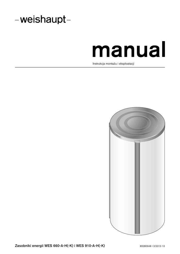 Instrukcja montażu i eksploatacji Zasobniki energii WES 660-A-H(-K) i WES 910-A-H(-K) 83280948 • 2/2012-10 Deklaracja Zgodności Sprachschlüssel 4716000048 Dostawca: Max Weishaupt GmbH Adres: Max-Weishaupt-Straße D-88475 Schwendi Produkt: Zasobnik energii WES 660-A, WES 910-A Wyżej wymieniony produkt jest zgodny z postanowieniami dyrektyw: PED 97 / 23 / EC Produkt ten oznakowany jest w następujący sposób: CE-0036 Zastosowana procedura oceny zgodności moduł B moduł C 1 Schwendi, 17.10.2012 i. V. / Działu Badań i Rozwoju z up. Dr. Schloen Denkinger Kierownik Działu Badań i Rozwoju Kierownik Działu Produkcji i Zarządzania Jakością Instrukcja montażu i eksploatacji Zasobniki energii WES 660-A-H(-K) i WES 910-A-H(-K) 1 Wskazówki dla użytkownika ............................................................................................. 1.1 Prowadzenie użytkownika .................................................................................. 1.1.1 Symbole ................................................................................................................. 1.1.2 Przeznaczenie instrukcji ...................................................................................... 1.1.3 Rękojmia i odpowiedzialność ............................................................................ 5 5 5 5 6 2 Zasady bezpieczeństwa ...................................................................................................... 2.1 Użytkowanie zgodne z przeznaczeniem ......................................................... 2.2 Środki bezpieczeństwa ...................................................................................... 2.2.1 Normalna eksploatacja ....................................................................................... 2.3 Usuwanie materiałów użytych do czyszczenia urządzenia ......................... 7 7 7 7 7 3 Opis produktu ........................................................................................................................... 8 3.1 Klucz do oznaczania typu urządzenia .............................................................. 8 3.2 Numer seryjny ....................................................................................................... 8 3.3 Zasada działania ................................................................................................... 9 3.4 Dane techniczne ............................................................................................... 10 3.4.1 Dopuszczenie .................................................................................................... 10 3.4.2 Moc ...................................................................................................................... 10 3.4.3 Ciśnienie robocze ............................................................................................. 10 3.4.4 Temperatura robocza ....................................................................................... 10 3.4.5 Dopuszczalne warunki otoczenia .................................................................. 10 3.4.6 Wpływ na środowisko naturalne/recykling ................................................. 10 3.4.7 Pojemność .......................................................................................................... 10 3.4.8 Wymiary .............................................................................................................. 11 3.4.9 Ciężar .................................................................................................................. 11 4 Montaż ........................................................................................................................................ 12 4.1 Warunki dotyczące montażu ......................................................................... 12 4.2 Ustawienie zasobnika energii ......................................................................... 13 4.3 Montaż czujnika temperatury ......................................................................... 14 5 Instalacja ................................................................................................................................... 15 5.1 Wymagania ........................................................................................................ 15 5.2 Podłączenie hydrauliczne ............................................................................... 15 5.3 Połączenie zasobników w kaskadę (tylko wersja -K) ............................... 17 5.4 Montaż izolacji ................................................................................................... 18 6 Uruchomienie ......................................................................................................................... 20 7 Wyłączenie ................................................................................................................................ 21 8 Konserwacja ............................................................................................................................ 22 8.1 Wskazówki dotyczące konserwacji .............................................................. 22 8.2 Czyszczenie zasobnika .................................................................................... 22 9 Postępowanie w razie wystąpienia błędu ............................................................... 23 10 Wyposażenie dodatkowe .................................................................................................. 24 10.1 Zestaw zaworu bezpieczeństwa ................................................................... 24 10.2 Zestaw kulowych zaworów kątowych .......................................................... 25 83280948 • 2/2012-10 • La 3-30 Instrukcja montażu i eksploatacji Zasobniki energii WES 660-A-H(-K) i WES 910-A-H(-K) 11 Części zamienne .......................................................................