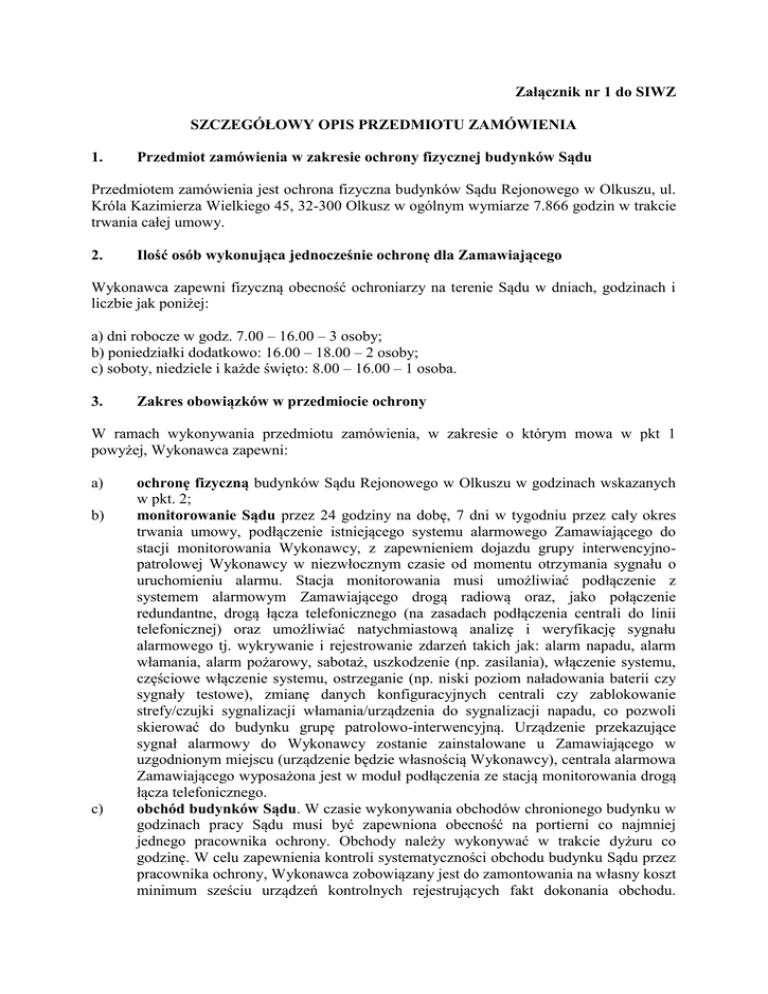 Załącznik nr 1 do SIWZ SZCZEGÓŁOWY OPIS PRZEDMIOTU ZAMÓWIENIA 1. Przedmiot zamówienia w zakresie ochrony fizycznej budynków Sądu Przedmiotem zamówienia jest ochrona fizyczna budynków Sądu Rejonowego w Olkuszu, ul. Króla Kazimierza Wielkiego 45, 32-300 Olkusz w ogólnym wymiarze 7.866 godzin w trakcie trwania całej umowy. 2. Ilość osób wykonująca jednocześnie ochronę dla Zamawiającego Wykonawca zapewni fizyczną obecność ochroniarzy na terenie Sądu w dniach, godzinach i liczbie jak poniżej: a) dni robocze w godz. 7.00 – 16.00 – 3 osoby; b) poniedziałki dodatkowo: 16.00 – 18.00 – 2 osoby; c) soboty, niedziele i każde święto: 8.00 – 16.00 – 1 osoba. 3. Zakres obowiązków w przedmiocie ochrony W ramach wykonywania przedmiotu zamówienia, w zakresie o którym mowa w pkt 1 powyżej, Wykonawca zapewni: a) b) c) ochronę fizyczną budynków Sądu Rejonowego w Olkuszu w godzinach wskazanych w pkt. 2; monitorowanie Sądu przez 24 godziny na dobę, 7 dni w tygodniu przez cały okres trwania umowy, podłączenie istniejącego systemu alarmowego Zamawiającego do stacji monitorowania Wykonawcy, z zapewnieniem dojazdu grupy interwencyjnopatrolowej Wykonawcy w niezwłocznym czasie od momentu otrzymania sygnału o uruchomieniu alarmu. Stacja monitorowania musi umożliwiać podłączenie z systemem alarmowym Zamawiającego drogą radiową oraz, jako połączenie redundantne, drogą łącza telefonicznego (na zasadach podłączenia centrali do linii telefonicznej) oraz umożliwiać natychmiastową analizę i weryfikację sygnału alarmowego tj. wykrywanie i rejestrowanie zdarzeń takich jak: alarm napadu, alarm włamania, alarm pożarowy, sabotaż, uszkodzenie (np. zasilania), włączenie systemu, częściowe włączenie systemu, ostrzeganie (np. niski poziom naładowania baterii czy sygnały testowe), zmianę danych konfiguracyjnych centrali czy zablokowanie strefy/czujki sygnalizacji włamania/urządzenia do sygnalizacji napadu, co pozwoli skierować do budynku grupę patrolowo-interwencyjną. Urządzenie przekazujące sygnał alarmowy do Wykonawcy zostanie zainstalowane u Zamawiającego w uzgodnionym miejscu (urządzenie będzie własnością Wykonawcy), centrala alarmowa Zamawiającego wyposażona jest w moduł podłączenia ze stacją monitorowania drogą łącza telefonicznego. obchód budynków Sądu. W czasie wykonywania obchodów chronionego budynku w godzinach pracy Sądu musi być zapewniona obecność na portierni co najmniej jednego pracownika ochrony. Obchody należy wykonywać w trakcie dyżuru co godzinę. W celu zapewnienia kontroli systematyczności obchodu budynku Sądu przez pracownika ochrony, Wykonawca zobowiązany jest do zamontowania na własny koszt minimum sześciu urządzeń kontrolnych rejestrujących fakt dokonania obchodu. d) e) f) g) h) i) j) k) l) m) n) Urządzenia winny być zamontowane w miejscu uzgodnionym z zamawiającym. współpracę z Policją w godzinach pracy Sądu, polegającą m. in. na bieżącym wpuszczaniu samochodów konwojowych policji na parking wewnętrzny Sądu oraz kierowanie grup konwojowych do aresztu, a także zamykanie drzwi i bram prowadzących do pomieszczeń aresztowych w momencie opuszczenia budynku przez konwój. kontrolę osób wchodzących i wychodzących z Sądu – w zakresie posiadanych uprawnień, z wykorzystaniem: bramowego wykrywacza metalu (własność Zamawiającego) oraz ręcznego detektora metalu (własność Wykonawcy). kontrolę polegająca na zabezpieczeniu mienia sądowego przed wynoszeniem na zewnątrz Sądu przez osoby nieupoważnione. pomoc w sytuacjach nadzwyczajnych: pożary, zagrożenie zdrowia i życia ludzi – stosowanie się w tym zakresie do przepisów obowiązujących u Zamawiającego. natychmiastowe powiadomienie odpowiedniej służby (straży pożarnej, policji, pogotowia lub innych właściwych) oraz upoważnionego przedstawiciela Zamawiającego w przypadku awarii, pożaru, włamania itp.. dokonywanie obchodu budynku, sprawdzenie jego zabezpieczenia oraz pomieszczeń przed wszelkimi zagrożeniami po zakończeniu pracy Sądu. udzielanie w godzinach pracy Sądu dokładnej i pełnej informacji dotyczącej czasu pracy i lokalizacji poszczególnych wydziałów i biur. obserwację w trakcie dyżuru podglądu z kamer zainstalowanych w jednostce, monitorowanie sygnałów alarmowych generowanych przez system przeciwpożarowy, napadowy zainstalowany u Zamawiającego, kontrolę uprawnień do parkowania pojazdów na parkingu Sądu Rejonowego w Olkuszu (sprawdzanie posiadania stosownej karty parkingowej), Zamawiający powierza a Wykonawca przyjmuje na siebie obowiązek strzeżenia mienia i osób (pracowników obiektu) Zamawiającego na terenie obiektów przy ul. Króla Kazimierza Wielkiego 45 w Olkuszu przed kradzieżą z włamaniem powodującym zniszczenie mienia Zamawiającego. Przez włamanie rozumie się bezprawne wtargnięcie do strzeżonego obiektu osób nieupoważnionych, pozostawiając ślady zaboru mienia, materiałów lub urządzeń będących przedmiotem strzeżenia. Poza faktem stwierdzenia zaboru mienia musi być stwierdzone, że sprawca działał z zewnątrz a nie był pracownikiem Zamawiającego. Stwierdzenie czy sprawca działał z zewnątrz ustala się w porozumieniu z Zamawiającym. 3. Zakres obowiązków w przedmiocie transportowania wartości pieniężnych i innych przedmiotów wartościowych w formie inkasa i konwoju a) Odbiór wartości pieniężnych z kasy Sądu Wykonawca będzie dokonywał odbioru wartości pieniężnych z Kasy Sądu Rejonowego w Olkuszu oraz transportował pakiety z gotówką do Banku PEKAO SA Oddział w Olkuszu przy ul. Króla Kazimierza Wielkiego pełniącego funkcję zastępczej obsługi kasowej, a także – w razie konieczności – do Urzędu Pocztowego w Olkuszu przy ul. Króla Kazimierza Wielkiego. Przez pakiet rozumie się wartości pieniężne w bilonie i banknotach, zapakowane w sposób uniemożliwiający ich wyjęcie bez naruszenia op