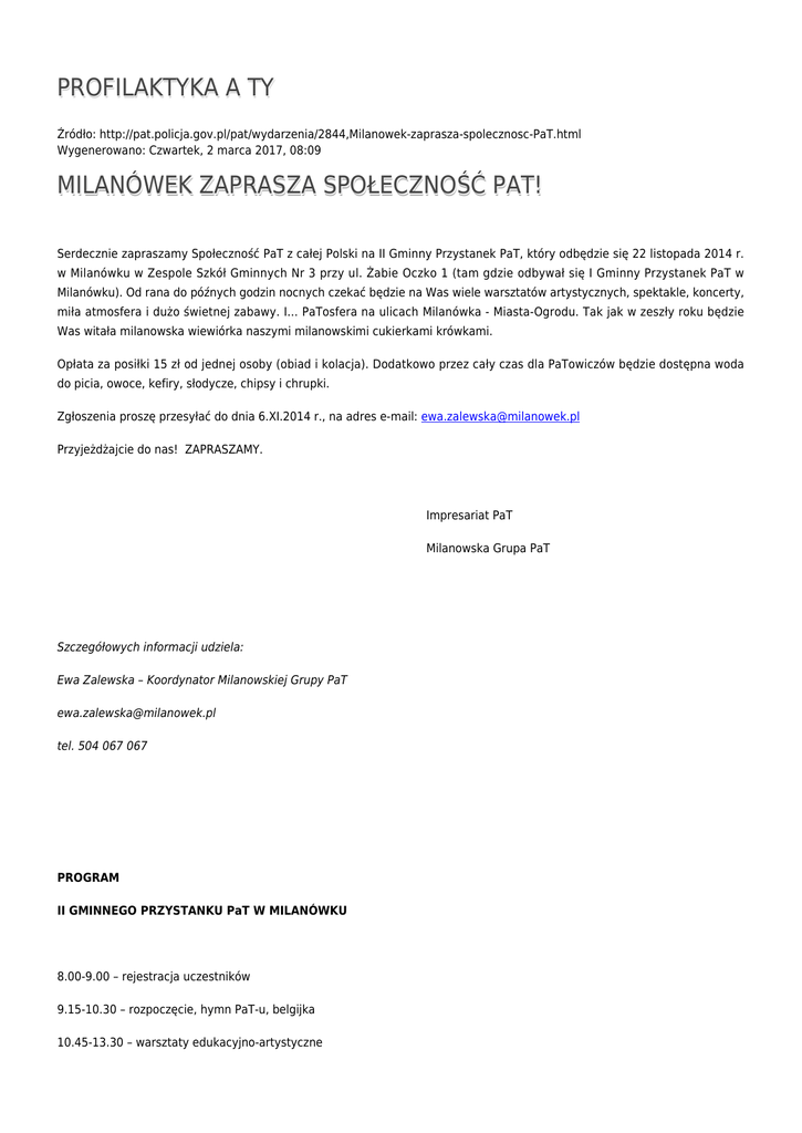 PROFILAKTYKA A TY Źródło: http://pat.policja.gov.pl/pat/wydarzenia/2844,Milanowek-zaprasza-spolecznosc-PaT.html Wygenerowano: Czwartek, 2 marca 2017, 08:09 MILANÓWEK ZAPRASZA SPOŁECZNOŚĆ PAT! Serdecznie zapraszamy Społeczność PaT z całej Polski na II Gminny Przystanek PaT, który odbędzie się 22 listopada 2014 r. w Milanówku w Zespole Szkół Gminnych Nr 3 przy ul. Żabie Oczko 1 (tam gdzie odbywał się I Gminny Przystanek PaT w Milanówku). Od rana do późnych godzin nocnych czekać będzie na Was wiele warsztatów artystycznych, spektakle, koncerty, miła atmosfera i dużo świetnej zabawy. I… PaTosfera na ulicach Milanówka - Miasta-Ogrodu. Tak jak w zeszły roku będzie Was witała milanowska wiewiórka naszymi milanowskimi cukierkami krówkami. Opłata za posiłki 15 zł od jednej osoby (obiad i kolacja). Dodatkowo przez cały czas dla PaTowiczów będzie dostępna woda do picia, owoce, kefiry, słodycze, chipsy i chrupki. Zgłoszenia proszę przesyłać do dnia 6.XI.2014 r., na adres e-mail: [email protected] Przyjeżdżajcie do nas! ZAPRASZAMY. Impresariat PaT Milanowska Grupa PaT Szczegółowych informacji udziela: Ewa Zalewska – Koordynator Milanowskiej Grupy PaT [email protected] tel. 504 067 067 PROGRAM II GMINNEGO PRZYSTANKU PaT W MILANÓWKU 8.00-9.00 – rejestracja uczestników 9.15-10.30 – rozpoczęcie, hymn PaT-u, belgijka 10.45-13.30 – warsztaty edukacyjno-artystyczne 13.30-14.15 – obiad 14.30-16.30 – PaTosfera (w przypadku niekorzystnej pogody obędą się spektakle profilaktyczne zaplanowane na godz. 19.30-20.30 i zostanie wydłużony koncert muzyczny zaplanowany na godz. 16.45-17.30) 16.45-17.30 – koncert muzyczny 17.45-19.00 – warsztaty edukacyjno-artystyczne 19.00-19.30 – kolacja 19.30-20.30 – belgijka, spektakle profilaktyczne 20.30-22.30 – gala finałowa 22.45-0.45 – koncert zespołu Bethel 0.45-1.15 – zakończenie, belgijka Wykaz warsztatów na II Gminnym Przystanku PaT w Milanówku: 1. Latino – Natali Antos 2. Salsa – Agnieszka Forenc DNS Studia Tańca z Milanówka 3. Malowanie na jedwabiu i tkaninie – Andrzej Niewolewski malarz milanowski (zabieramy ze sobą zaplamioną bluzkę lub koszulkę, którą chcemy odzyskać) 4. Strzelecki – Zbigniew Kubek instruktor strzelecki 5. Charakteryzacja – Karolina Kamińska uczennica Zespołu Szkół Nr 1 w Milanówku 6. Wokalne – Pamela Osóbka i Weronika Radzikowska uczennice Zespołu Szkół Nr 1 w Milanówku 7. Hip-hop – Branko Blelopotocky 8. Decoupaga – Małgorzata Frankowska nauczyciel Zespołu Szkół Nr 1 w Milanówku 9. Trening twórczego myślenia - Elżbieta Dybińska psycholog i coach oraz Marta Dublielis prawnik i mediator sądowy 10. Teatralne – Wojciech Wanat terapeuta uzależnień od narkotyków 11. Malowanie na koszulkach – Apollonia Lesiakowska uczennica Zespołu Szkół Gminnych Nr 3 w Milanówku 12. Boks – Artur Nawrocki Mazowiecki Klub Sportowy z Milanówka (zabieramy stroje sportowe) 13. Dziennikarskie – Tomasz Sikorski Zastępca Dyrektora Naczelnego Radia Bogoria 14. Zumba – Szkoła Nauki Tańca Pauli Ostalskiej I love Dance 15. Poetyckie – Beata Niewolewska polonistka 16. Taniec brzucha – Agnieszka Forenc DNS Studia Tańca z Milanówka (zabieramy stroje do tańca brzucha) 17. Graffiti – Bartosz Szymulski (zabieramy ubrania na zmianę bo trochę się możemy ubrudzić) 18. Brazylijskie Jiu Jitsu – Mazowiecki Klub Sportowy z Milanówka (zabieramy stroje sportowe) 19. MMA – Mazowiecki Klub Sportowy z Milanówka (zabieramy stroje sportowe) 20. Warsztaty wychowawcze dla opiekunów – Katarzyna Krawczyk psycholog i terapeuta rodzinny (10.45-13.30) i Hanna Dunowska aktorka i psychoterapeutka, trenerka coachingu, członkini Polskiego Stowarzyszenia Psychoterapetów i Trenerów Psychologii Procesu (17.45-19.00) (warsztaty: boks, MMA, brazylijskie jiu jitsu odbędą się w Mazowieckim Klubie Sportowym, gdzie PaTowicze zostaną przewiezieni autokarem) ZAŁĄCZNIKI DO STRONY Regulamin II Gminnego Przystanku PaT i zgoda rodzica 17.83 KB Karta zgłoszenia 12.71 KB Ocena: 5/5 (1) Tweetnij
