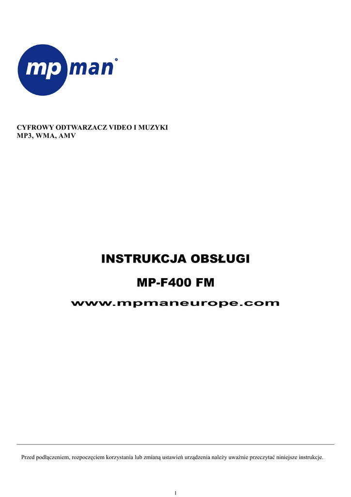 CYFROWY ODTWARZACZ VIDEO I MUZYKI MP3, WMA, AMV INSTRUKCJA OBSŁUGI MP-F400 FM www.mpmaneurope.com Przed podłączeniem, rozpoczęciem korzystania lub zmianą ustawień urządzenia należy uważnie przeczytać niniejsze instrukcje. 1 PODSTAWOWE INFORMACJE 1.1 Właściwości MP-F400 •Obsługuje następujące formaty plików muzycznych: MP1, MP2, MP3, WMA •Ekran LCD •Graficzny interfejs użytkownika 1.2 Opakowanie zawiera Odtwarzacz MP3 Słuchawki stereo Płytę CD z e sterownikami i innym przydatnym oprogramowaniem Przewodnik szybkiego startu Kabel USB 1.3 Wymagania dotyczące komputera 1 2 3 4 5 6 Procesor Pentium 100 MHz lub szybszy Pamięć 32 MB RAM lub więcej CD-ROM Minimum 15 MB wolnych na twardym dysku USB 1.1/2.0 Windows 98/ME/2000/XP, Mac OS 10, Linux 2.4.2 1.4 Interfejs odtwarzacza 1.5 Wygląd i sterowanie (1) (2) (3) (4) (5) (6) (7) (8) (9) Ekran LCD Przycisk PLAY/PAUSE Przycisk PREV/REV (poprzedni/cofanie) lub ściszania dźwięku Przycisk NEXT/FWD (następny/przewijanie) lub podgłaśniania dźwięku Przycisk MENU (nacisnąć i przytrzymać przez 2 sekundy, by wrócić do menu głównego) VOL : tryb dźwięku Gniazdo słuchawkowe i USB Włącznik ON/OFF Mocowanie smyczy 2 1.6 Bateria Odtwarzacz MP-F400 posiada znajdujący się na ekranie wskaźnik naładowania baterii: Naładować baterię gdy wskaźnik pokazuje niski stan naładowania baterii (ładowanie odbywa się przez podłączenie odtwarzacza MP-F400 przy pomocy kabla USB do komputera lub ewentualnie do ładowarki). 1.7 Włączanie i wyłączanie Odtwarzacz włącza się i wyłącza przy pomocy przełącznika ON/OFF. Wciśnięcie i przytrzymanie przez 2 sekundy przycisku PLAY powoduje wyłączenie odtwarzacza. Ponowne wciśnięcie i przytrzymanie przycisku PLAY spowoduje ponowne włączenie urządzenia. FUNKCJE 2.0 Menu główne W menu głównym można wybrać jeden z trzech trybów z odmiennymi cechami: Tryb muzyczny (Play mode) Tryb FM (FM Mode) Tryb ustawień (Setting mode) Funkcję wybiera się przy pomocy przycisków NEXT i PREV. Aktywacja funkcji następuje po naciśnięciu przycisku MENU. Przytrzymanie przez 2 sekundy wciśniętego przycisku MENU powoduje powrót do menu głównego. 2.1 Tryb muzyczny Wybrać tryb muzyczny (MUSIC) w menu głównym i nacisnąć MENU by wejść do niego. Pliki muzyczne można wybierać przy pomocy przycisków NEXT i REV. Wcisnąć PLAY by odtworzyć plik. W trybie muzycznym można dokonać następujących ustawień: Tryb odtwarzania (funkcja dostępna podczas odtwarzania) Zarządzanie plikami (funkcja dostępna w stanie oczekiwania) Tryb odtwarzania W czasie odtwarzania nacisnąć przycisk MENU, by wejść do trybu odtwarzania. Można ustawić jedną z 7 opcji: Replay - Powtarzanie Normal (Zwykły) Każdy z utworów zostanie odtworzony jednokrotnie Repeat One Powtarza aktualny utwór (Powtórz jedną) Folder Odtwarza wszystkie utwory we wskazanym folderze Repeat Folder Powtarza wszystkie utwory we wskazanym folderze (Powtórz folder) Repeat All (Powtórz Powtarza wszystkie utwory wszystkie) Random (Losowo) Odtwarza wszystkie utwory w losowej kolejności Intro (Wstęp) Odtwarza 10-sekundowe początki kolejnych utworów Equalizer- korektor, ustawienia dźwięku Natural Rock Pop Classic Soft Jazz DBB 3 Tempo rate - Tempo odtwarzania Naciskać przyciski NEXT i PREV by zmienić tempo odtwarzania. UWAGA: Zmiany tempa odtwarzania można dokonywać wyłącznie przy plikach MP3! Replay - Powtarzanie A-B replay – można zaznaczyć wybrane fragmenty muzyki do ciągłego powtarzania. Po wybraniu Replay pojawia się ikona a litera A miga. Wcisnąć NEXT by wskazać początek (A) fragmentu do odtwarzania. Litera b zacznie migać. Wcisnąć NEXT by wskazać koniec (B) fragmentu do odtwarzania. Fragment A–B zacznie odtwarzać się w pętli. By wrócić do zwykłego trybu odtwarzania wcisnąć przycisk MENU. Replay times – Liczba powtórzeń Wybrać ilość powtórzeń fragmentu A-B (od 1 do 10 razy). Replay gap – Przerwa miedzy powtórzeniami Wybrać okres przerwy między jednym a drugim powtórzeniem fragmentu A-B (od 1 do 10 sekund). Exit - Wyjście Zarządzanie plikami Aby wejść do trybu zarządzania plikami wcisnąć krótko przycisk MENU, gdy odtwarzacz znajduje się w stanie oczekiwania. Do wyboru są 4 opcje: Local folder – Folder lokalny Przeglądanie plików i folderów zapisanych w pamięci odtwarzacza. Wybierać przy pomocy przycisków NEXT i PREV i nacisnąć MENU by wejść do katalogu lub zatwierdzić wybór. Delete file – Usuń pliki Pozwala na usuwanie plików i folderów zapisanych w pamięci odtwarzacza. Wybierać przy pomocy przycisków NEXT i PREV i nacisnąć MENU by zatwierdzić usunięcie. Delete all – Usuń wszystko Usuwa wszystkie pliki z pamięci urządzenia. Exit – wyjście 2.2 Radio FM Wybrać tryb FM radio w menu głównym i nacisnąć MENU by wejść do niego. - Naciskać krótko lub by zmieniać częstotliwość każdorazowo o 0.1 MHz - Wcisnąć i przytrzymać przycisk lub . Puścić przycisk gdy częstotliwość się zmienia. Radio automatycznie wyszuka kolejną dostępną stację. - Wcisnąć PLAY by wybrać następną zapisaną stację radiową. - Wcisnąć i przytrzymać przycisk MENU by wrócić do głównego menu. - Krótko nacisnąć przycisk Vol by wejść do menu kontroli głośności i naciskać lub by regulować natężenie dźwięku. - Nacisnąć jednokrotnie przycisk MENU żeby wyświetlić submenu FM: Save (Zapisz): zapisywanie aktualnej stacji radiowej Record (Nagrywaj): Nagrywanie aktualnego programu z radia Delete (Usuń): usuwanie aktualnej zapisanej częstotliwości Delete All (Usuń wszystkie): usuwanie wszystkich zapisanych częstotliwości Auto search (Automatyczne wyszukiwanie): dostępne stacje radiowe zostaną wyszukane i zapisane automatycznie Normal Band: amerykańskie częstotliwości radiowe FM (87-108 MHz) Japan Band: japońskie częstotliwości radiowe FM (76-90 MHz) Exit: wyjście z submenu Naciskać przyciski 