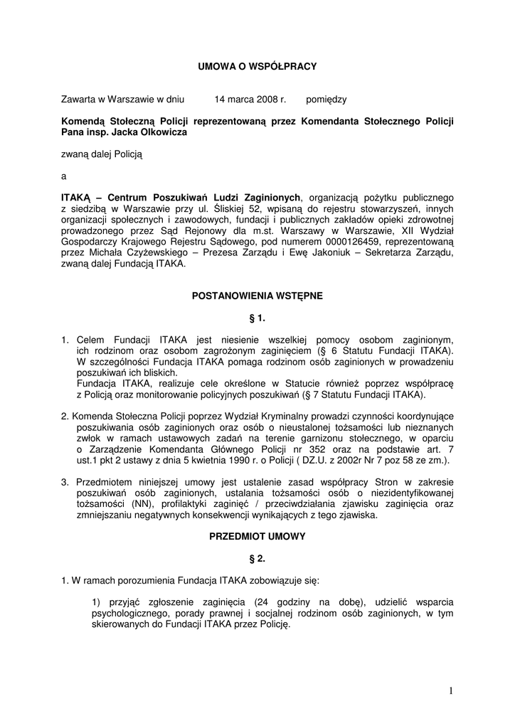 UMOWA O WSPÓŁPRACY Zawarta w Warszawie w dniu 14 marca 2008 r. pomiędzy Komendą Stołeczną Policji reprezentowaną przez Komendanta Stołecznego Policji Pana insp. Jacka Olkowicza zwaną dalej Policją a ITAKĄ – Centrum Poszukiwań Ludzi Zaginionych, organizacją pożytku publicznego z siedzibą w Warszawie przy ul. Śliskiej 52, wpisaną do rejestru stowarzyszeń, innych organizacji społecznych i zawodowych, fundacji i publicznych zakładów opieki zdrowotnej prowadzonego przez Sąd Rejonowy dla m.st. Warszawy w Warszawie, XII Wydział Gospodarczy Krajowego Rejestru Sądowego, pod numerem 0000126459, reprezentowaną przez Michała Czyżewskiego – Prezesa Zarządu i Ewę Jakoniuk – Sekretarza Zarządu, zwaną dalej Fundacją ITAKA. POSTANOWIENIA WSTĘPNE § 1. 1. Celem Fundacji ITAKA jest niesienie wszelkiej pomocy osobom zaginionym, ich rodzinom oraz osobom zagrożonym zaginięciem (§ 6 Statutu Fundacji ITAKA). W szczególności Fundacja ITAKA pomaga rodzinom osób zaginionych w prowadzeniu poszukiwań ich bliskich. Fundacja ITAKA, realizuje cele określone w Statucie również poprzez współpracę z Policją oraz monitorowanie policyjnych poszukiwań (§ 7 Statutu Fundacji ITAKA). 2. Komenda Stołeczna Policji poprzez Wydział Kryminalny prowadzi czynności koordynujące poszukiwania osób zaginionych oraz osób o nieustalonej tożsamości lub nieznanych zwłok w ramach ustawowych zadań na terenie garnizonu stołecznego, w oparciu o Zarządzenie Komendanta Głównego Policji nr 352 oraz na podstawie art. 7 ust.1 pkt 2 ustawy z dnia 5 kwietnia 1990 r. o Policji ( DZ.U. z 2002r Nr 7 poz 58 ze zm.). 3. Przedmiotem niniejszej umowy jest ustalenie zasad współpracy Stron w zakresie poszukiwań osób zaginionych, ustalania tożsamości osób o niezidentyfikowanej tożsamości (NN), profilaktyki zaginięć / przeciwdziałania zjawisku zaginięcia oraz zmniejszaniu negatywnych konsekwencji wynikających z tego zjawiska. PRZEDMIOT UMOWY § 2. 1. W ramach porozumienia Fundacja ITAKA zobowiązuje się: 1) przyjąć zgłoszenie zaginięcia (24 godziny na dobę), udzielić wsparcia psychologicznego, porady prawnej i socjalnej rodzinom osób zaginionych, w tym skierowanych do Fundacji ITAKA przez Policję. 1 2) przyjąć zgłoszenie zaginięcia od Policji, jeżeli Policja oceni, że pomoże to w szybszym odnalezieniu osoby zaginionej po wyrażeniu zgody przez osobę zgłaszającą zaginięcie. 2. Fundacja ITAKA na wniosek Policji: 1) umieści zdjęcie osoby zaginionej, osoby o nieustalonej tożsamości lub nieznanych zwłok wraz z podstawowymi informacjami w Internetowej Bazie Danych Osób Zaginionych i Osób NN Fundacji ITAKA; 2) opublikuje w mediach informacje o osobach zaginionych przekazanych przez Policję, w zależności od swoich możliwości oraz gotowości mediów do współpracy; 3) przekaże jednostce Policji prowadzącej poszukiwania informacje mogące przyczynić się do ustalenia miejsca pobytu osoby zaginionej, z zastrzeżeniem, że przekazanie tych informacji nie będzie naruszać zasad telefonu zaufania. § 3. 1. Fundacja ITAKA dostarczy Policji materiały informujące o działalności i pomocy udzielanej przez Fundację ITAKA rodzinom osób zaginionych (dalej Materiały). 2. Policja zajmie się dystrybucją Materiałów do podległych jej terytorialnych jednostek Policji. 3. Materiały będą umieszczone w jednostkach Policji w miejscu ogólnie dostępnym dla osób zainteresowanych. 4. Po wyczerpaniu obecnie posiadanego nakładu Materiałów, Strony podejmą działania w celu opracowania nowych Materiałów zawierających informacje dotyczące prowadzenia poszukiwań przez Policję oraz Fundację ITAKA. 5. Treść Materiałów będzie wymagała zgodnej akceptacji obu Stron. 6. Policja wyraża zgodę na umieszczenie loga Komendy Stołecznej Policji w tak przygotowanych Materiałach. 7. Koszty przygotowania Materiałów poniesie Fundacja ITAKA. § 4. 1. W ramach porozumienia Policja zobowiązuje się: 1) informować osoby zgłaszające zaginięcie na Policji o działalności i bezpłatnej pomocy oferowanej przez Fundację ITAKA rodzinom i bliskim zaginionych osób; 2) umieszczać na zaświadczeniu o przyjęciu zgłoszenia zaginięcia – zgodnie ze wzorem będącym załącznikiem do Zarządzenia, o którym mowa § 1 ust. 2 następujące informacje: nazwy jednostki prowadzącej poszukiwania, danych kontaktowych tej jednostki w postaci numeru telefonu/faksu oraz zakwalifikowanej kategorii poszukiwań; 2 3) udzielać pracownikom Fundacji ITAKA na ich prośbę informacji o przyjęciu zgłoszenia zaginięcia. Udzielenie informacji nastąpi poprzez kontakt za pomocą telefonu lub faksu, lub maila; 4) umieścić link do strony Fundacji ITAKA na stronie internetowej Komendy Stołecznej Policji. 2. W ramach współpracy Policja będzie udzielała informacji na temat wskazanej osoby zaginionej, która jednostka terytorialnie prowadzi poszukiwania. 3. Fundacja ITAKA po otrzymaniu informacji o zgłoszeniu zaginięcia od rodziny może kontaktować się z jednostką Policji prowadzącą poszukiwania w celu przekazywania dodatkowych informacji mogących mieć wpływ na sposób prowadzenia poszukiwań. 4. Policja zobowiązuje się informować Fundację ITAKA o przekazaniu prowadzenia poszukiwań do innej jednostki Policji, w sytuacji gdy posiada informacje na temat zainteresowania powyższą sprawą przez Fundację ITAKA.; 5. Policja zobowiązuje się każdorazowo informować Fundację ITAKA o zakończeniu wspólnie prowadzonych spraw dotyczących osób zaginionych i osób NN. § 5. 1. Strony zobowiązują się do wzajemnej wymiany informacji dotyczących poszukiwań osób zaginionych oraz osób NN (żywych i martwych). 2. Wymiana informacji i doświadczeń, o których mowa w niniejszej umowie nie będzie naruszać obowiązujących przepisów wewnętrznych Policji w szczególności Zarządzenia, o którym mowa w § 1 ust .2 Ustawy o ochronie danych osobowych (Dz. U. z 1997r Nr 133 p